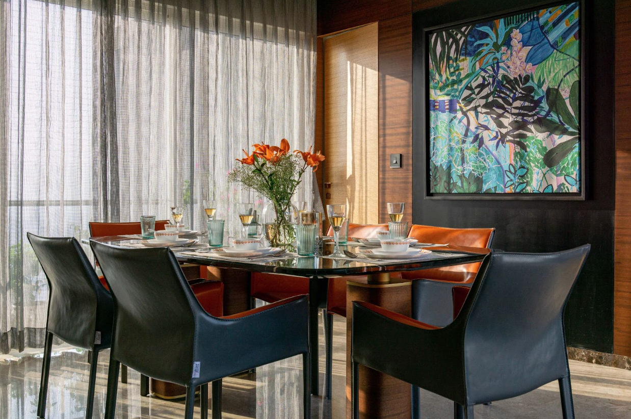 A feature wall adorned with a magnanimous tree-of-life artwork accentuates the living room. A C-shaped couch and coffee table setup placed on a custom-made rug creates a plush sitting area in front of the accent wall. A customized chandelier was designed to suit the aesthetics of the room, further adding to the elegance of the space. Adjacent to the living room is a 6-seater dining area providing a view of the neighbourhood skyline. A flowerbed beside the dining area makes the space more lively thereby helping enhance the appetite. A ring-shaped pendant light draws attention to the table making it the focal point of the space.