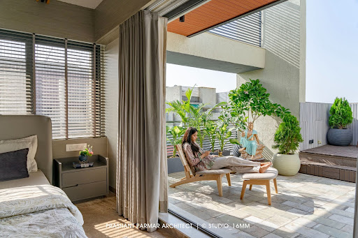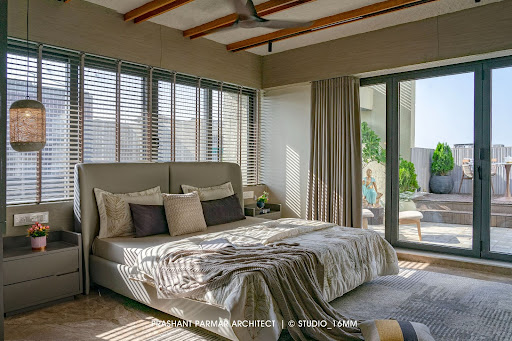 The Son’s bedroom opens up to its private external large open terrace which is adorned with walls cladded with concrete decorative panels. The bedroom's design is harmoniously balanced with the garden's serenity, offering a peaceful sanctuary where the gentle breeze and fragrance of flowers put residents to sleep. The wardrobes are made with fluted glass profile shutters in combination with dark grey matte finish laminates. The ceiling is a combination of wooden slats with rock finish MCM cladding.