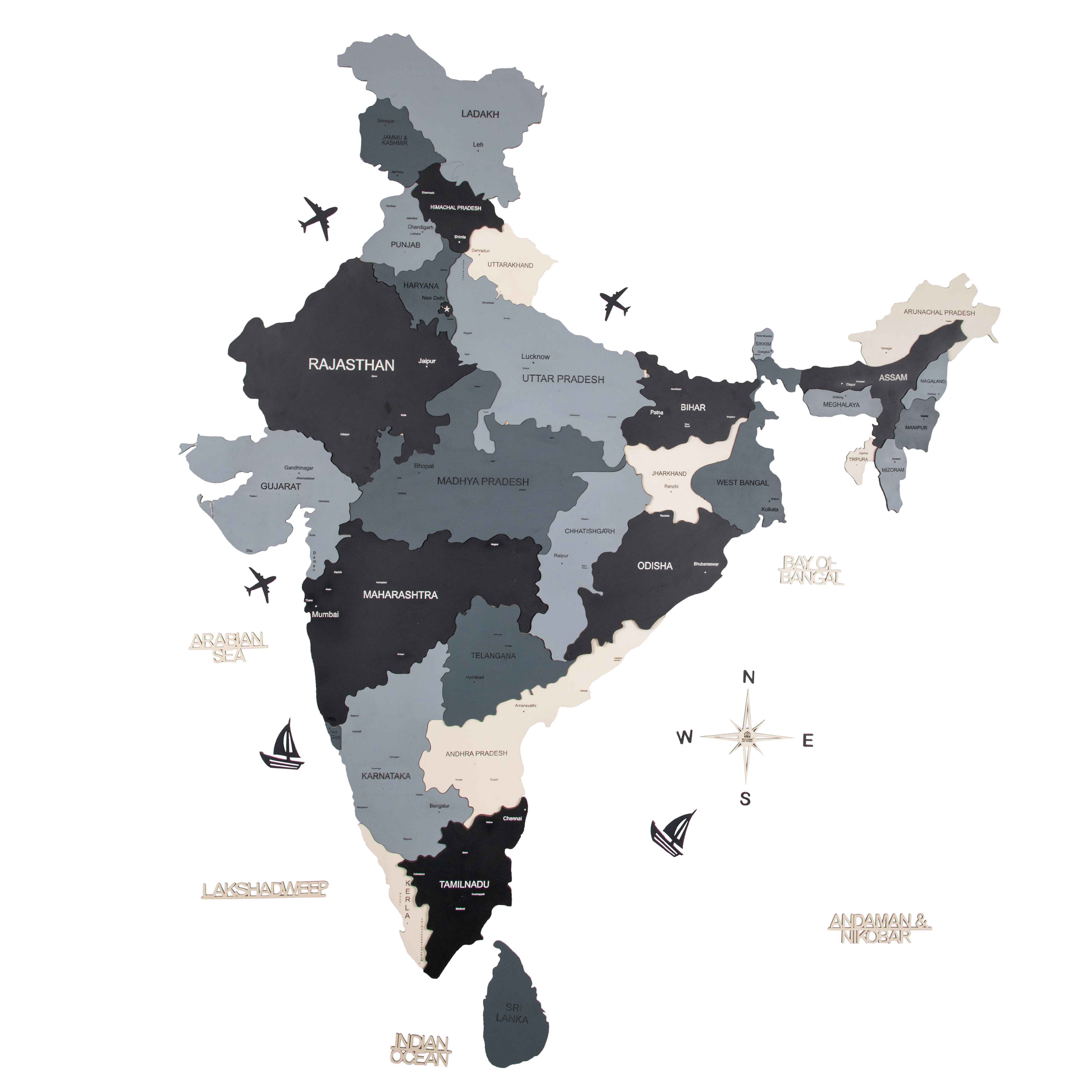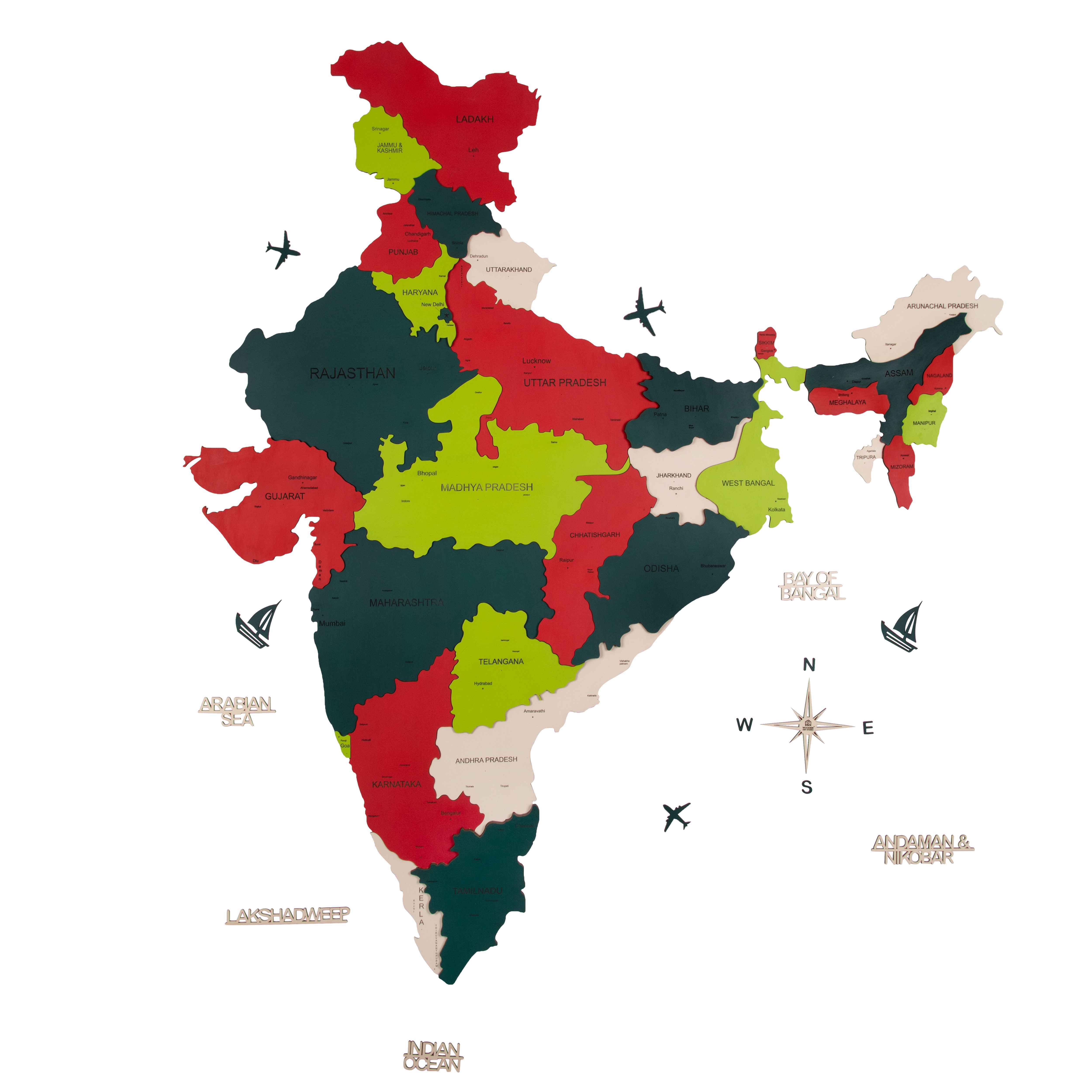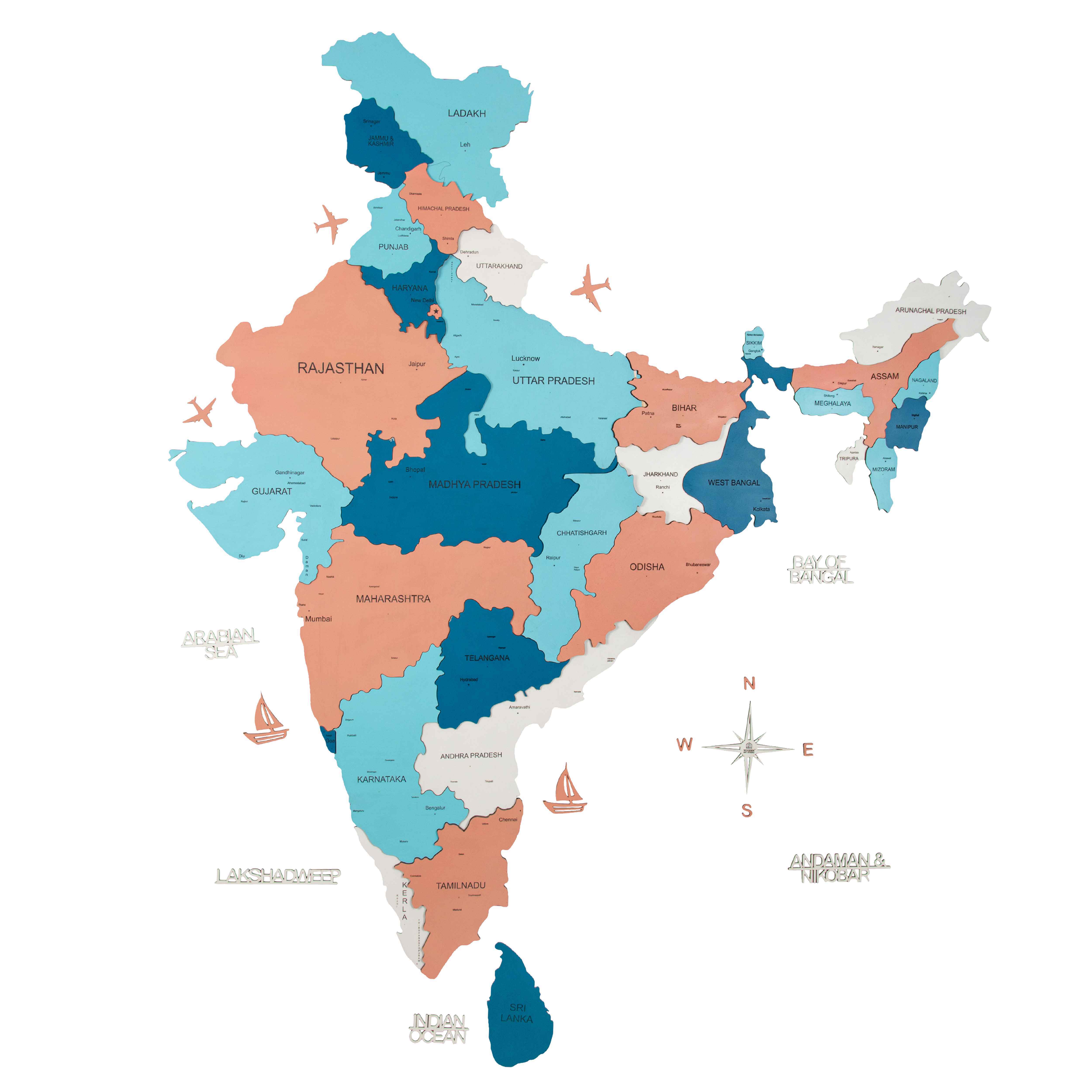 The 3D-colored wooden India map from Wooden Art Studio is colorful, stylish, and bold. The Map features solid color splashes, which are both eye-catching and inspiring. This wooden India map will bring good vibes into any space installed—at home, office, or hotel. The basic option includes states names and borders with states capital names. Precision - We create a high-quality 3D colored wooden India map with laser-cut precision. Handmade Finish - We handcraft each wooden piece in our workshop to magnify the finest details on the map. The 3D colored wooden India map has the following in the box: - Boats, Compass, Ocean names, Wooden planes, Instruction care card, Corner stencils, Special double-sided adhesive tape, User manual, Lifetime warranty, Thank you card.