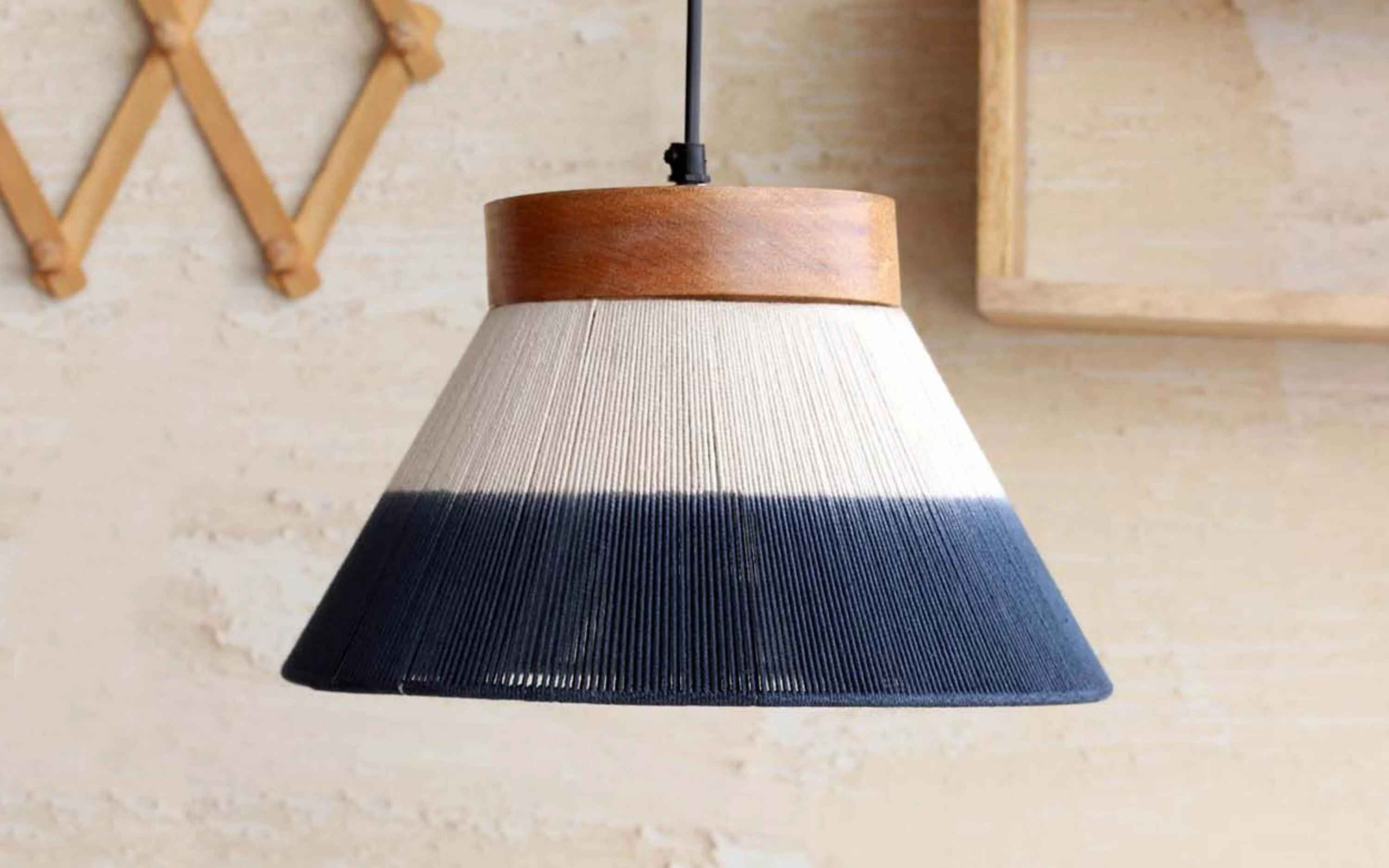 Afreen Hanging Lamp Conical was an unique experiment turned successful in adding gradation in woven shade. The cotton shade when dipped in blue colour looked beautiful adding slight natural gradient in the middle. The look is very handcrafted yet contemporary. Afreen Hanging Lamp Conical Shaded is a beautiful pendant light that can be used to light up your ceiling, hallway, living room, bedroom, dining table, kitchen, balcony or outdoor area. It is made of natural mango wood with an iron frame and cotton thread weave. The finish is natural mango wood with shaded cotton thread in off white to blue. This lamp is perfect for adding a touch of style and elegance to any space. "Depending on your screen settings and resolution on your device there may be a slight variance in fabric color and wood polish of the image and actual product. Wood grains will vary from product to product in case of solid wood furniture."