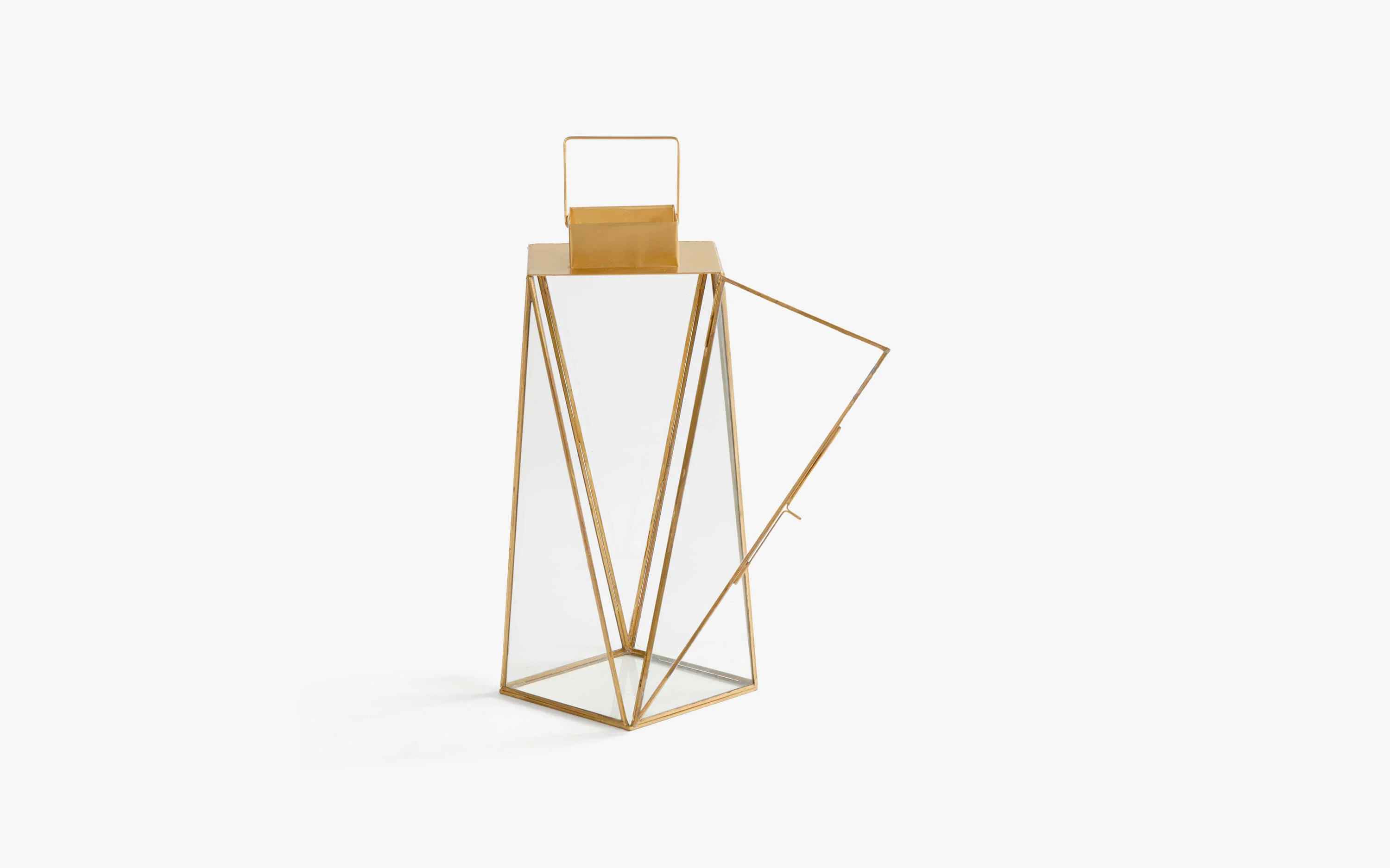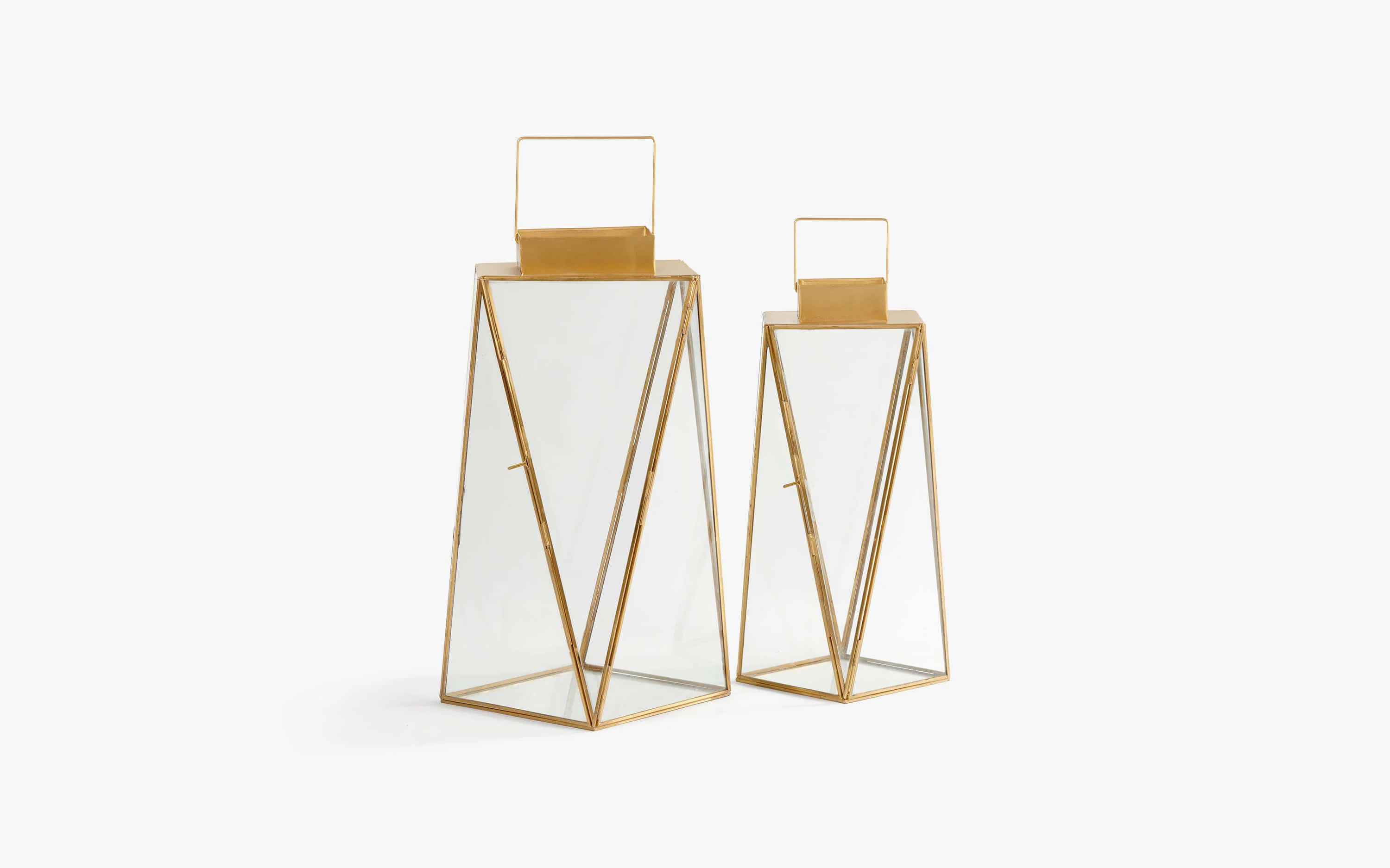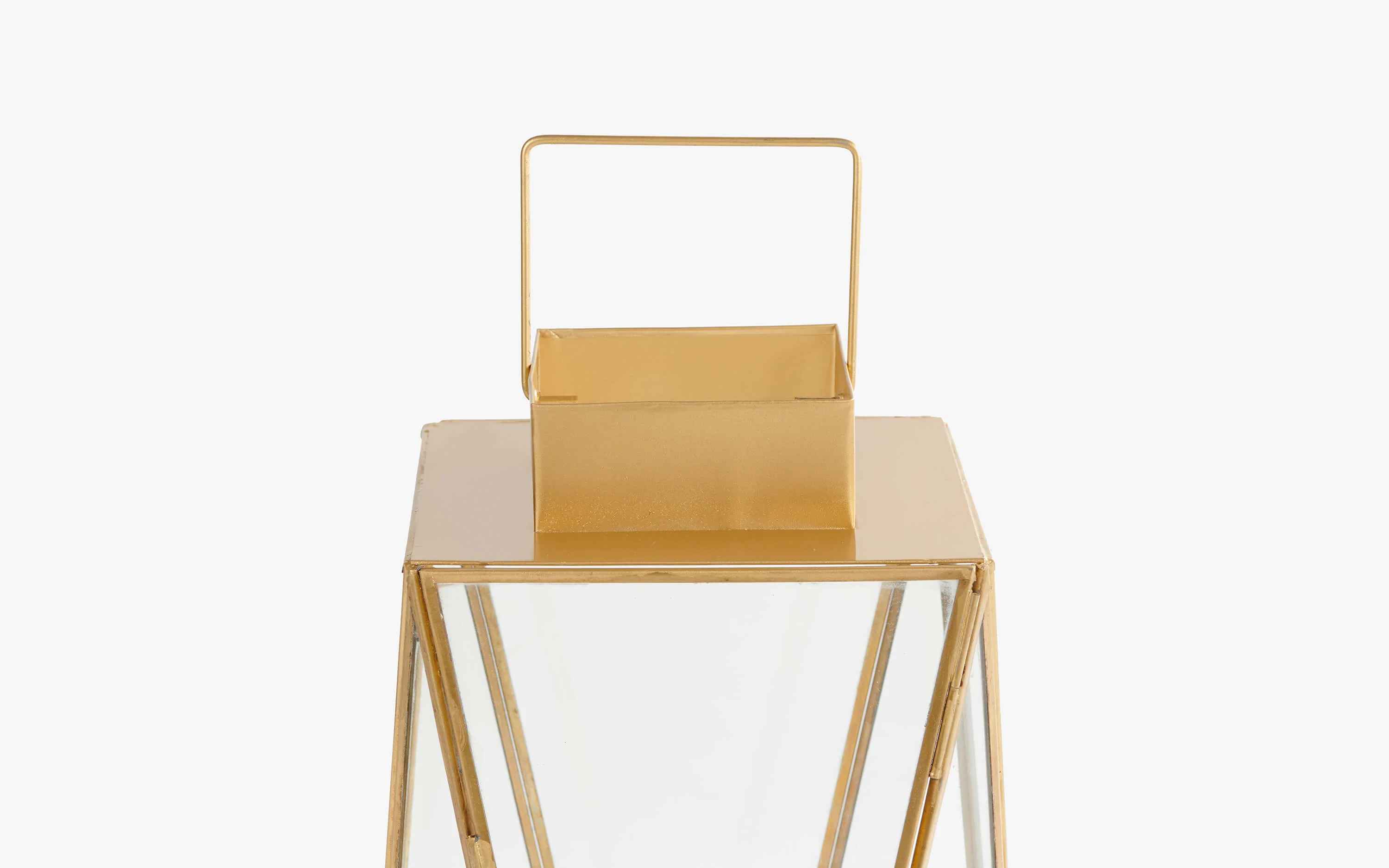 A fascinating union between clear glass and brass frames, the Alex Lantern from the Cahya collection translates versatility while adding a touch of festive glam to your homes! The geometric patterns and the fine lantern holder make them the perfect choice to hang outdoors. Decorate your corners or use them as a centerpiece for a graceful set-up. "Depending on your screen settings and resolution on your device there may be a slight variance in fabric color and wood polish of the image and actual product. Wood grains will vary from product to product in case of solid wood furniture."