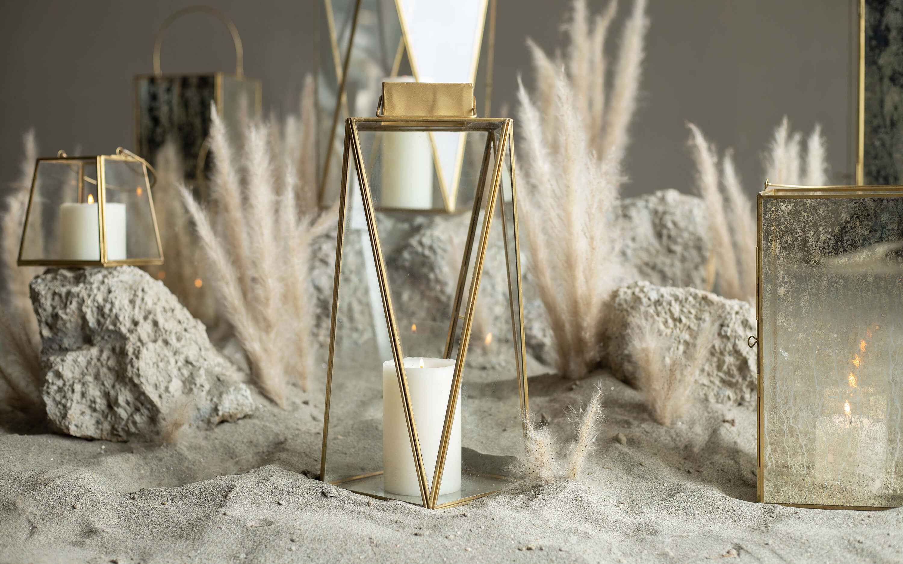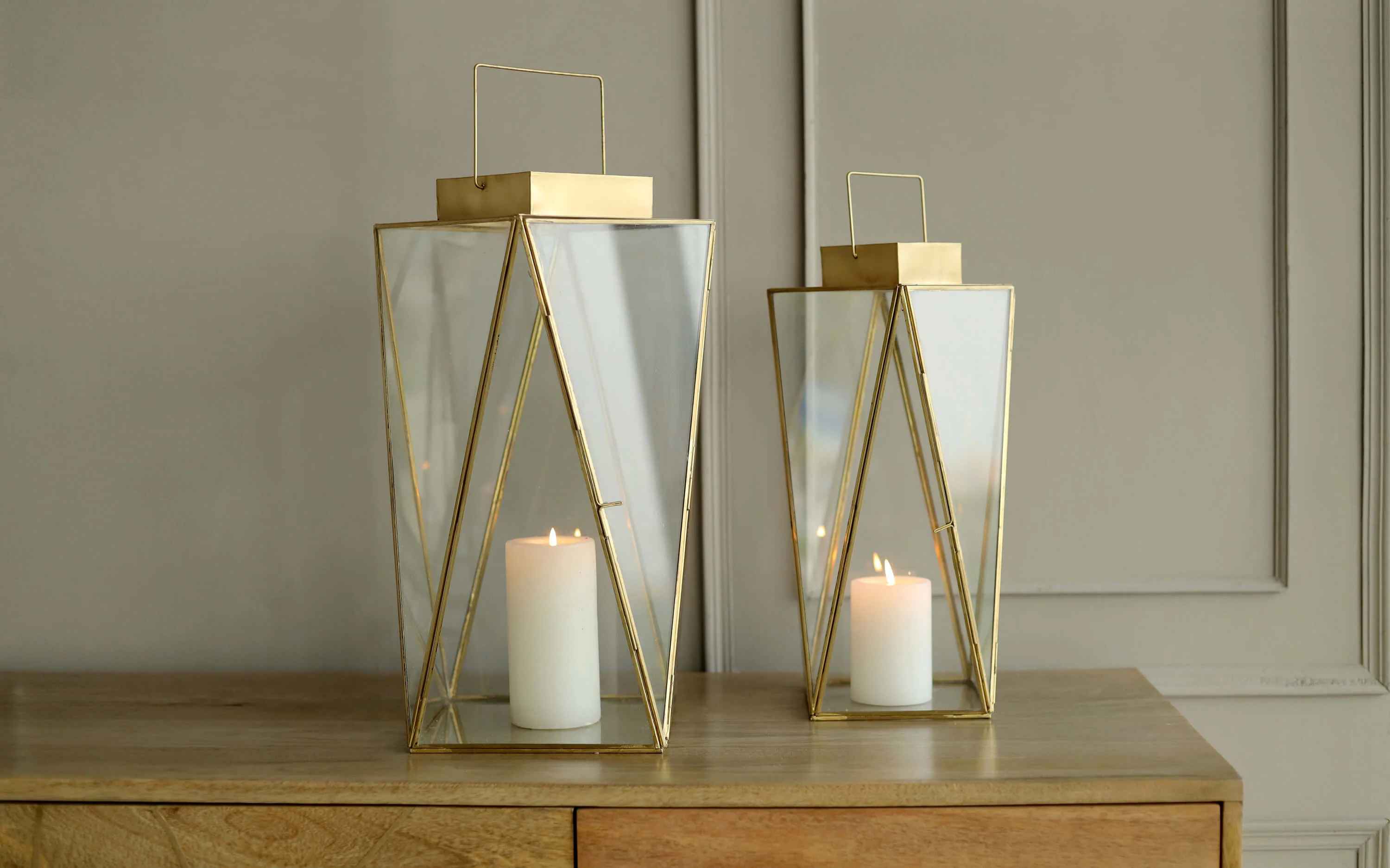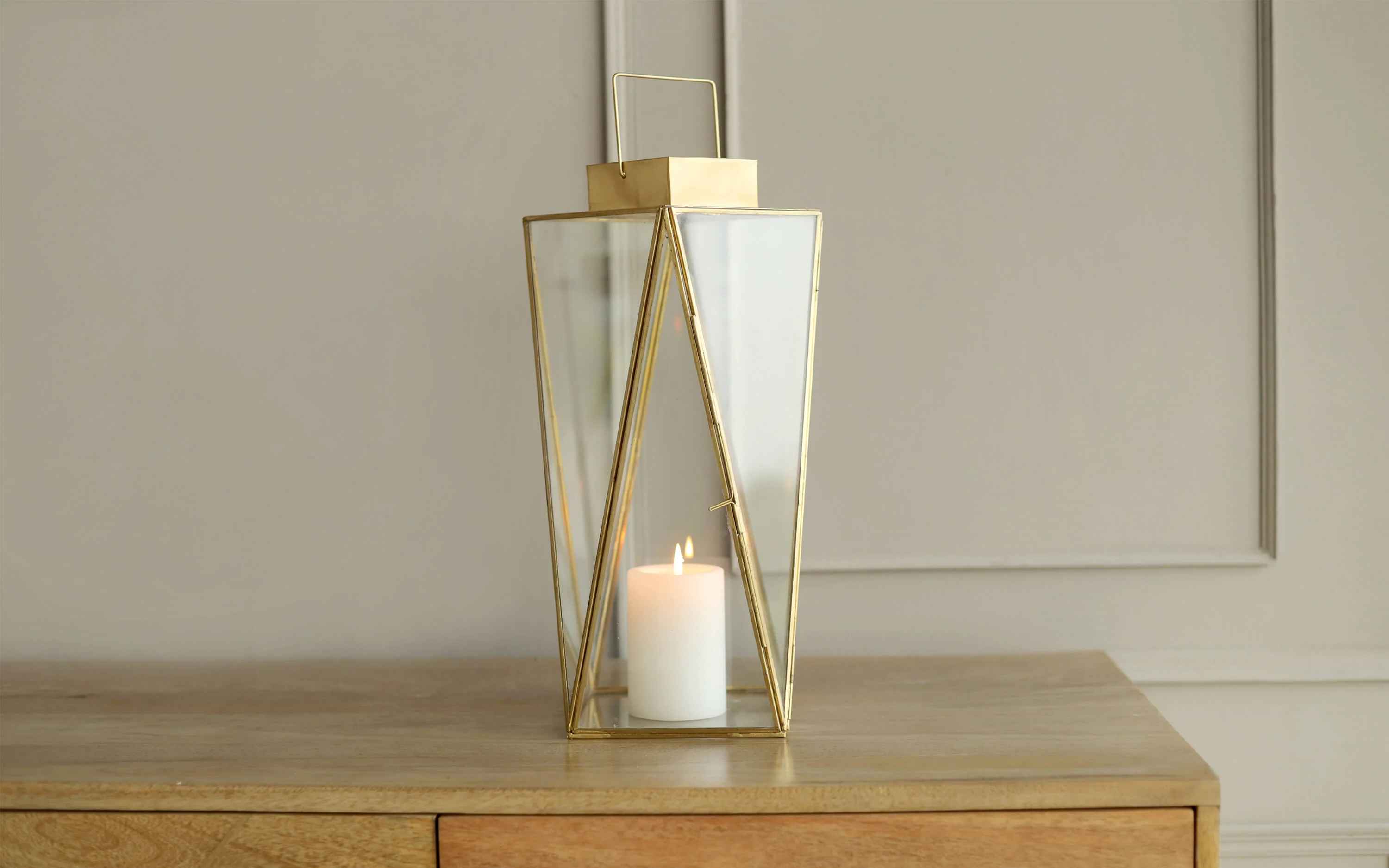 A fascinating union between clear glass and brass frames, the Alex Lantern from the Cahya collection translates versatility while adding a touch of festive glam to your homes! The geometric patterns and the fine lantern holder make them the perfect choice to hang outdoors. Decorate your corners or use them as a centerpiece for a graceful set-up. "Depending on your screen settings and resolution on your device there may be a slight variance in fabric color and wood polish of the image and actual product. Wood grains will vary from product to product in case of solid wood furniture."