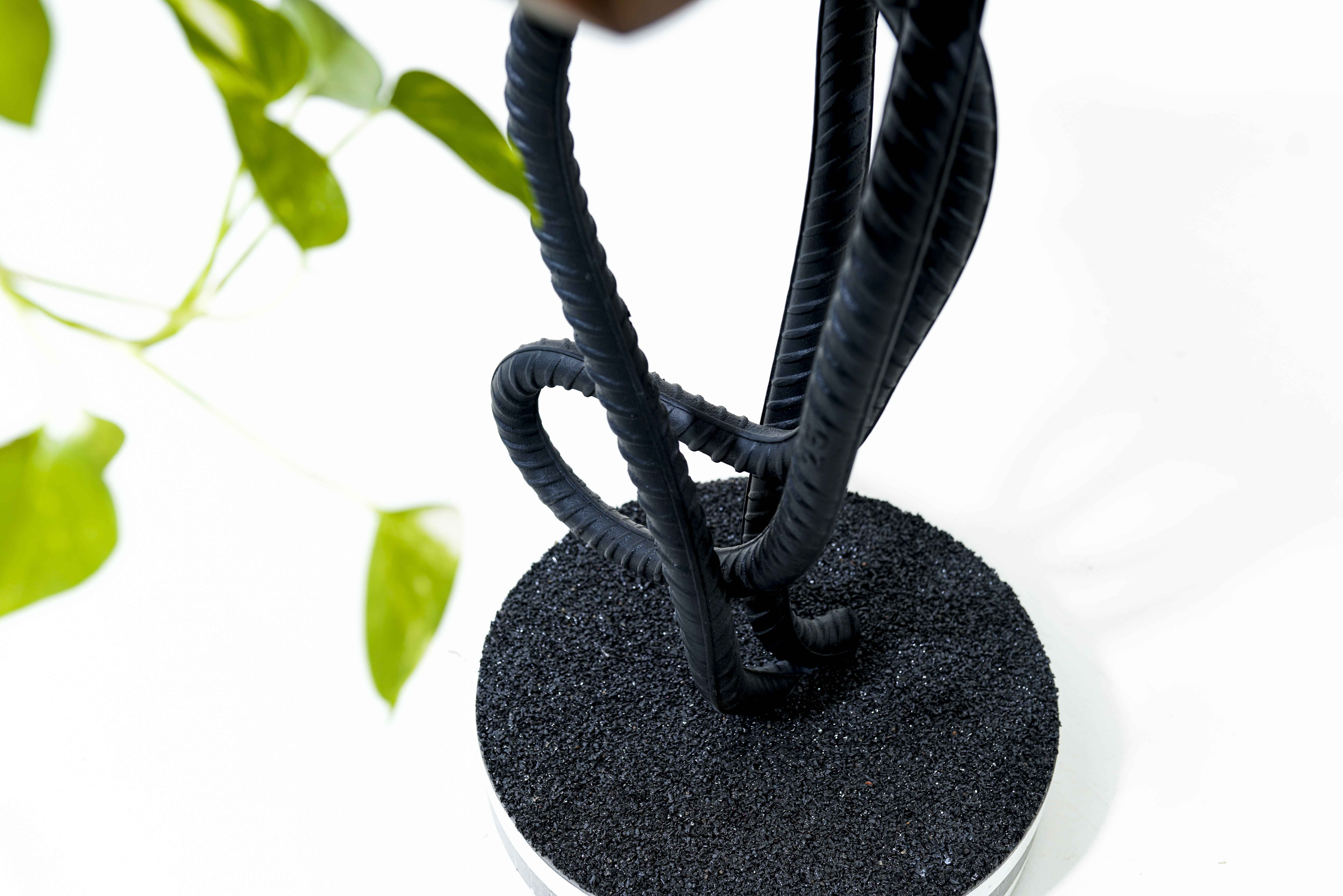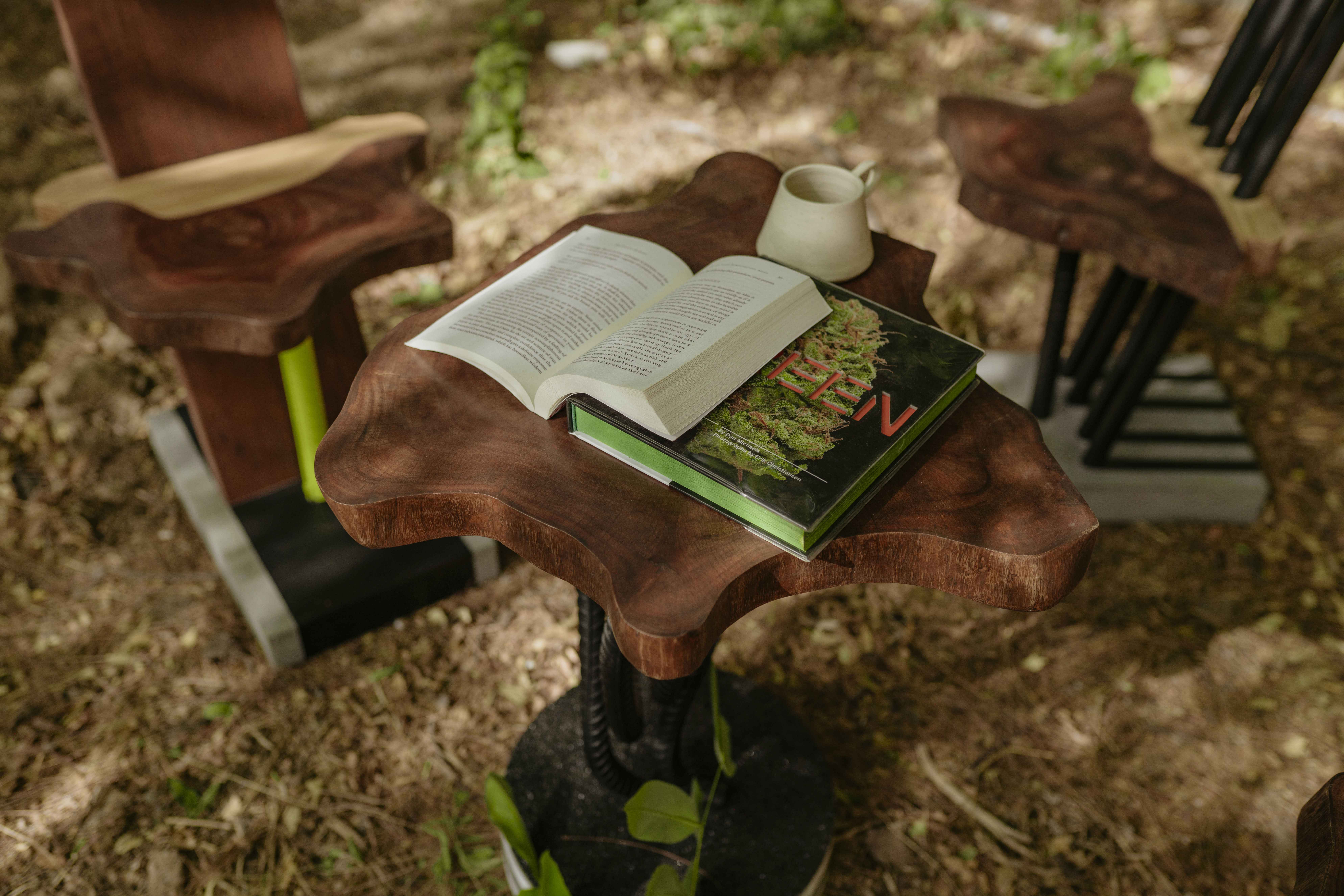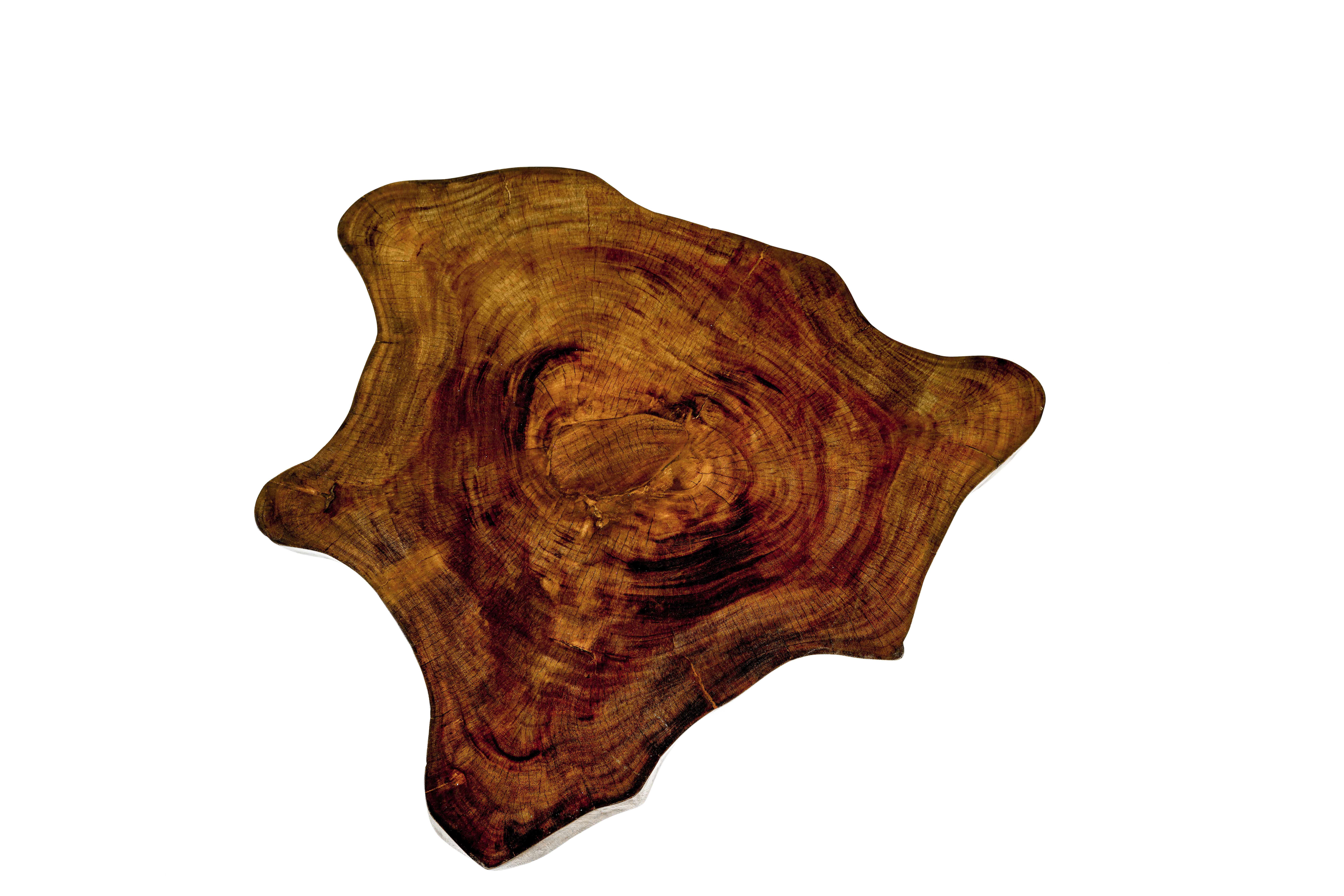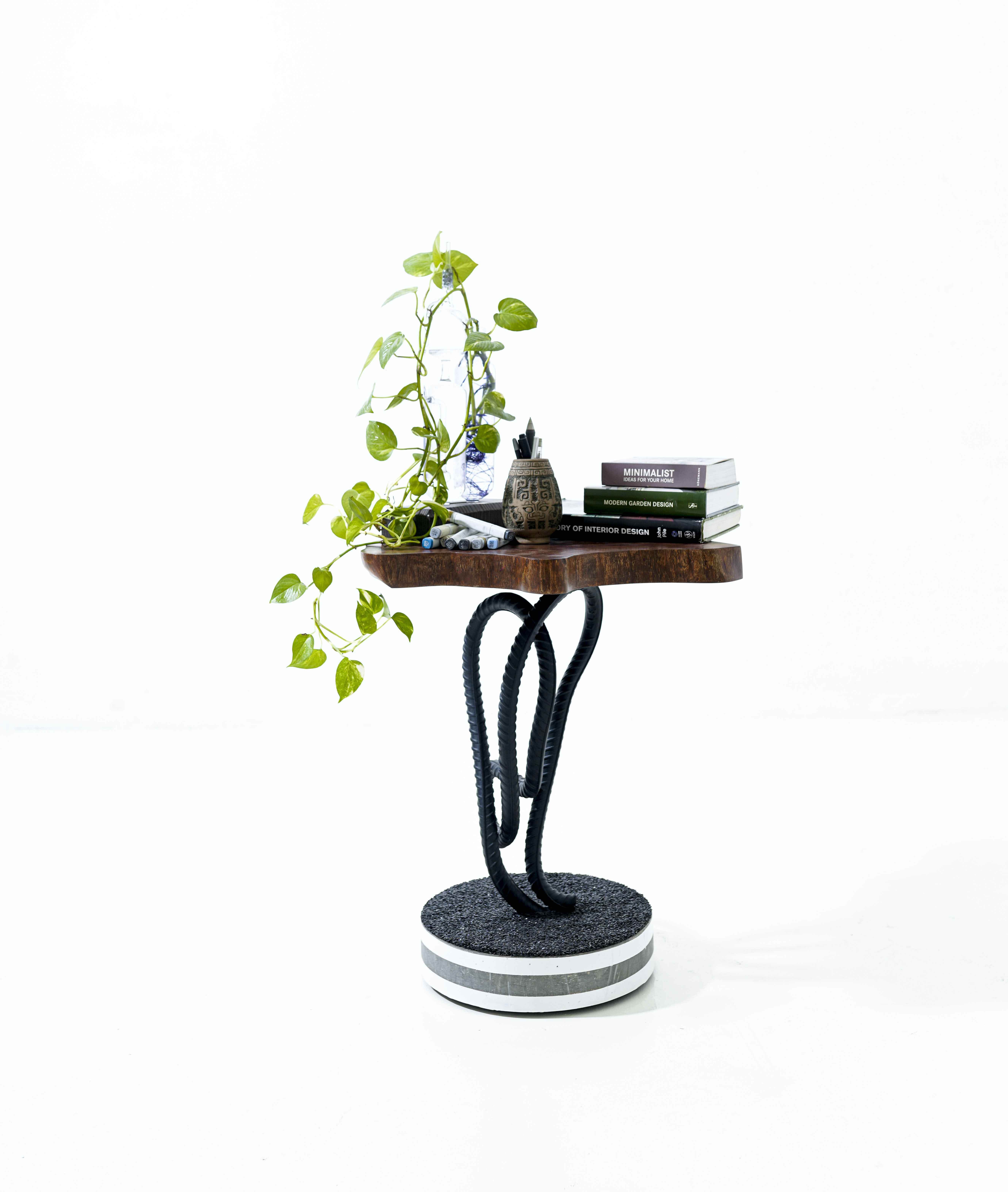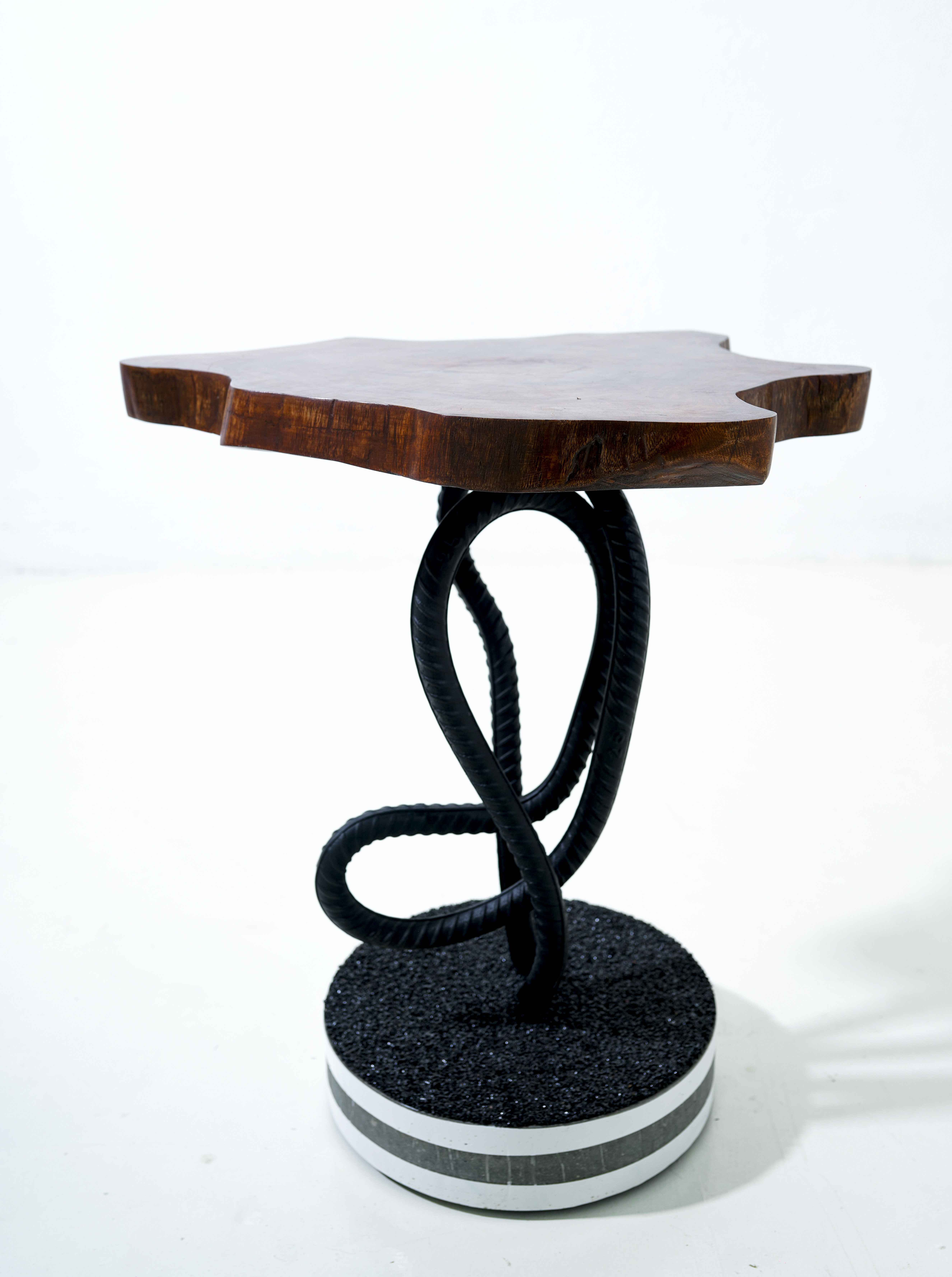 Spruce up your living room or garden with this abstract piece. With a top constructed from reclaimed raw wood, it flaunts an asymmetrical shape and is placed on a deformed steel bar matte black in colour. To keep it well-structured in place and build a weightless design, its base is formed of concrete and covered with Kapchi. This piece is all you need to make a statement in your room or your green outdoors. It is equipped/ optional with 360-degree wheels for quick and easy movements.