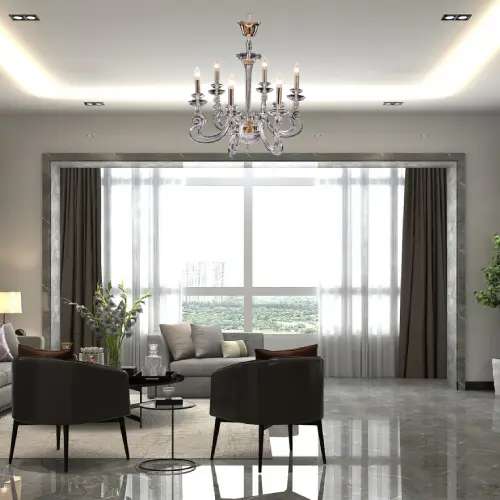 Add glamour to your home with this radiant Antlia - S chandelier. The mesmerising design provides sparkle for dining rooms, grand foyers & entry areas. Six candelabra style lights are arranged on a single-tier around the clear glass centre column. Choose this exceptional fixture to personalize the glam look of custom space. Available in two sizes.