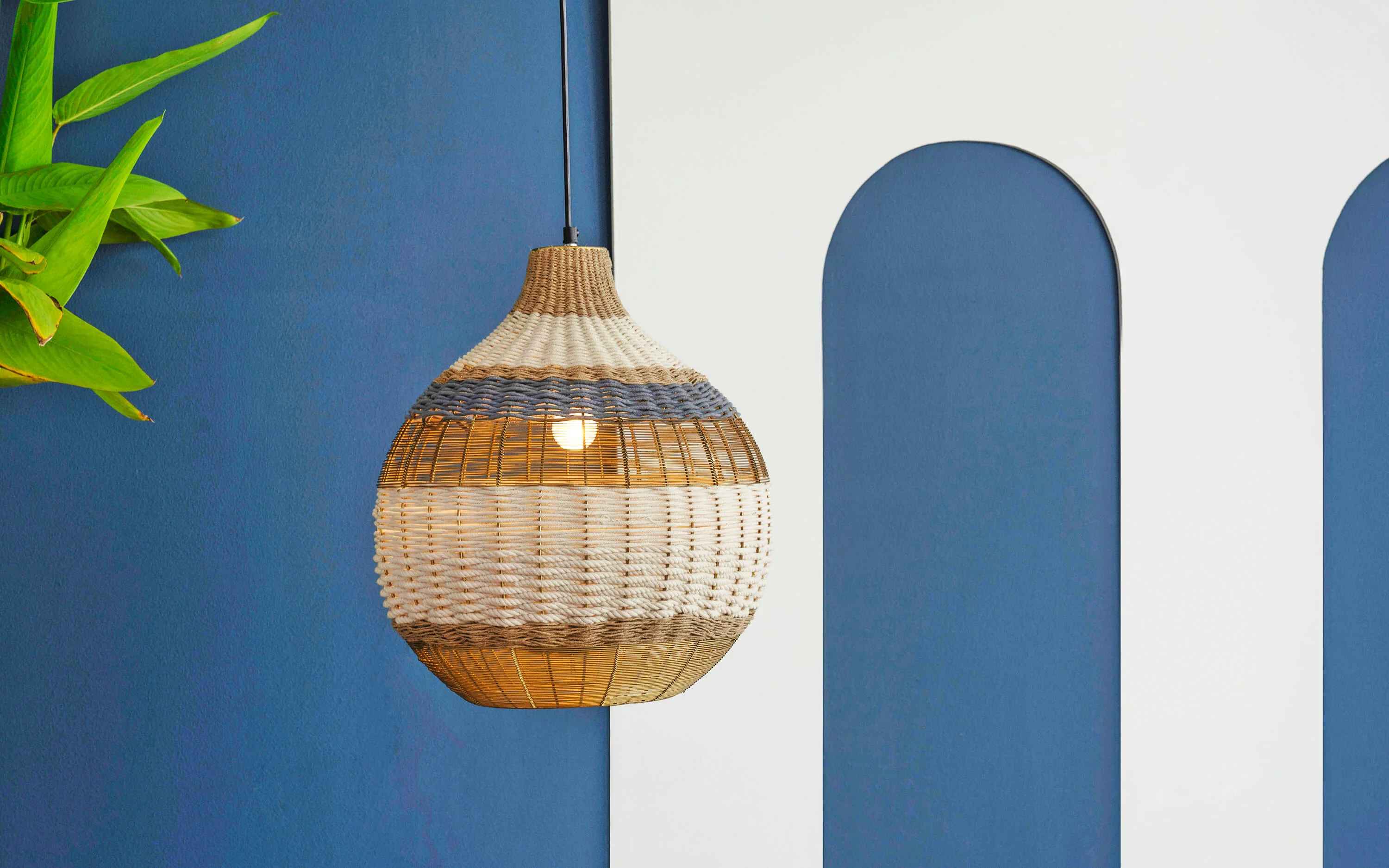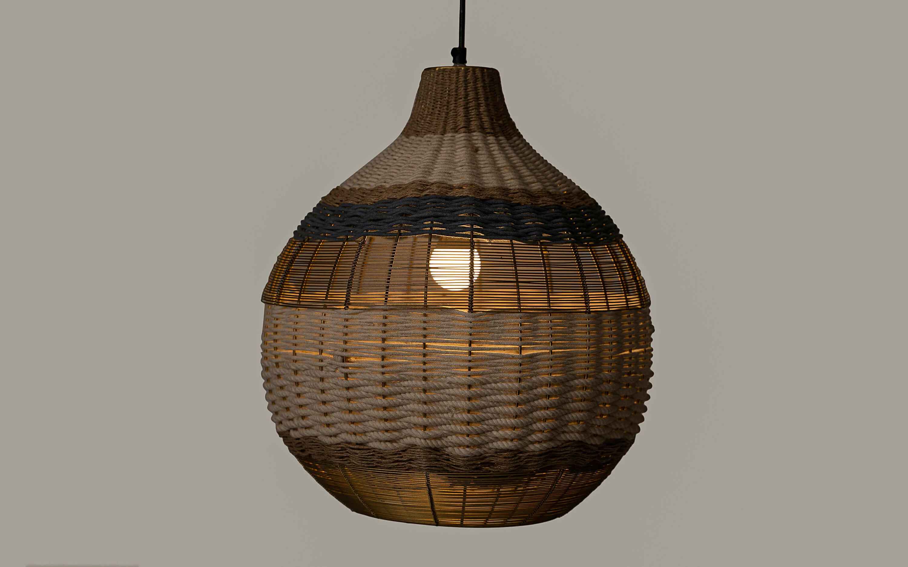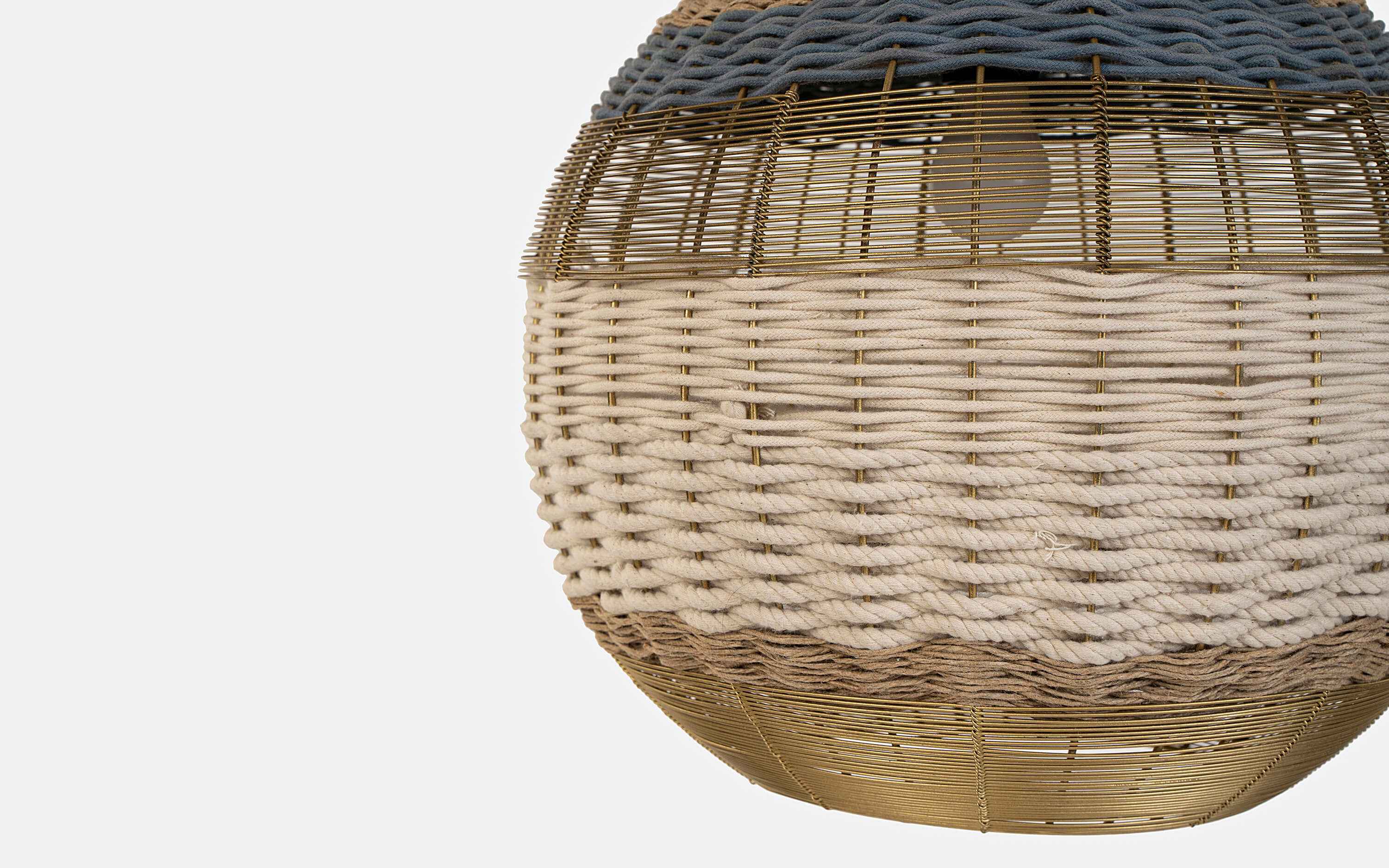 In Greek Mythology, weaving is depicted as heroic, magnificent, clever, valuable, the womanly counterpart to warfare. Arachne was a master weaver by virtue of extensive training, long experience, keen intellect, and fine taste. In this collection three very different kinds of materials- cotton thread in white and blue- depicting the Santorini colors, metal wire in gold finish embodying divine powers, and sisal fiber in natural finish- representing natural contrasting textures are interlaced at more or less right angles to each other within a gold-finished metal framework that holds them under tension. Patterns are created by meticulously varying the length of the threads, each turning back and forth in their own separate areas by our skilled artisans. The overall form follows simple geometry highlighting the visual impact of various textures creating Grecian imagery. The Arachne Drop Hanging Lamp casts a warm and inviting glow in any space. The sleek metal frame is finished in gold and features natural sisal fiber nest shape design and blue coloured cotton thread for a hint of colour . This beautiful lamp is perfect for hanging in your living room, dining room, or bedroom. "Depending on your screen settings and resolution on your device there may be a slight variance in fabric color and wood polish of the image and actual product. Wood grains will vary from product to product in case of solid wood furniture."