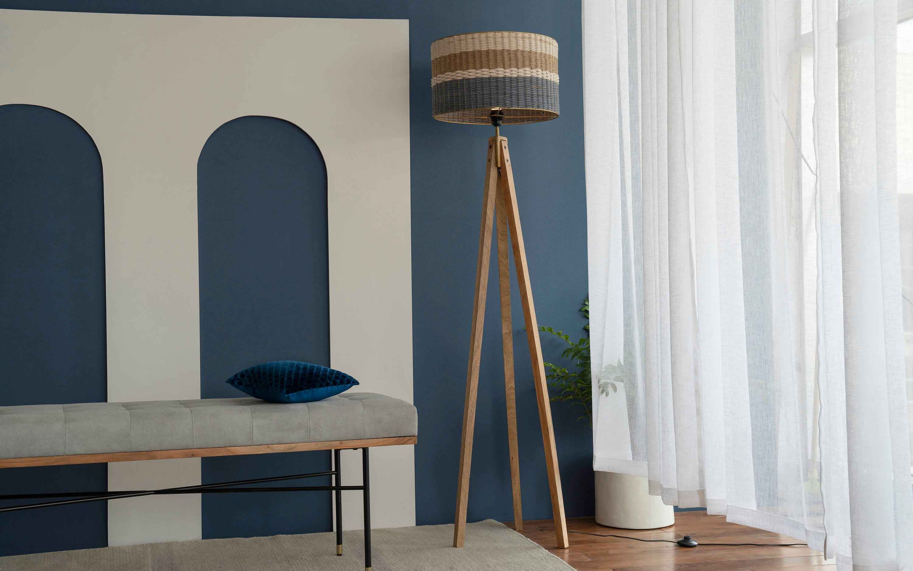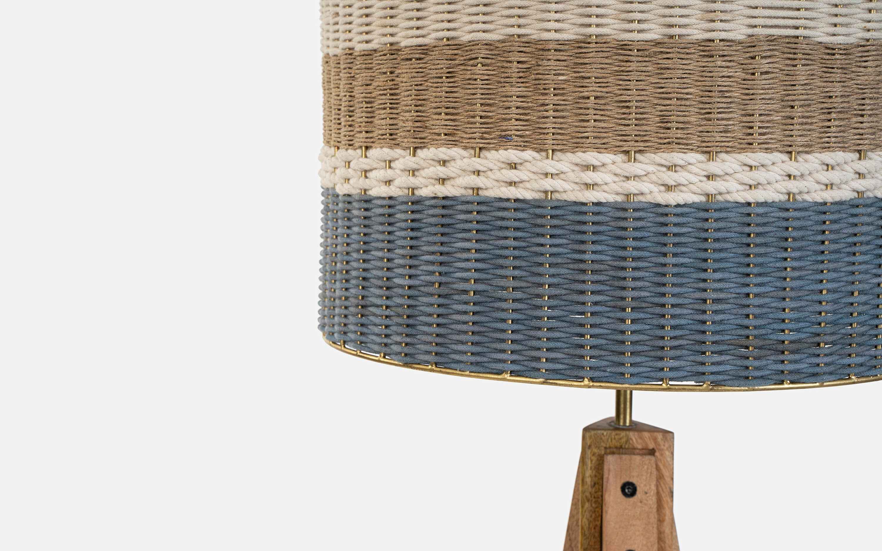 In Greek Mythology, weaving is depicted as heroic, magnificent, clever, valuable, the womanly counterpart to warfare. Arachne was a master weaver by virtue of extensive training, long experience, keen intellect, and fine taste. In this collection three very different kinds of materials- cotton thread in white and blue- depicting the Santorini colors, metal wire in gold finish embodying divine powers, and sisal fiber in natural finish- representing natural contrasting textures are interlaced at more or less right angles to each other within a gold-finished metal framework that holds them under tension. Patterns are created by meticulously varying the length of the threads, each turning back and forth in their own separate areas by our skilled artisans. The overall form follows simple geometry highlighting the visual impact of various textures creating Grecian imagery. "Depending on your screen settings and resolution on your device there may be a slight variance in fabric color and wood polish of the image and actual product. Wood grains will vary from product to product in case of solid wood furniture."