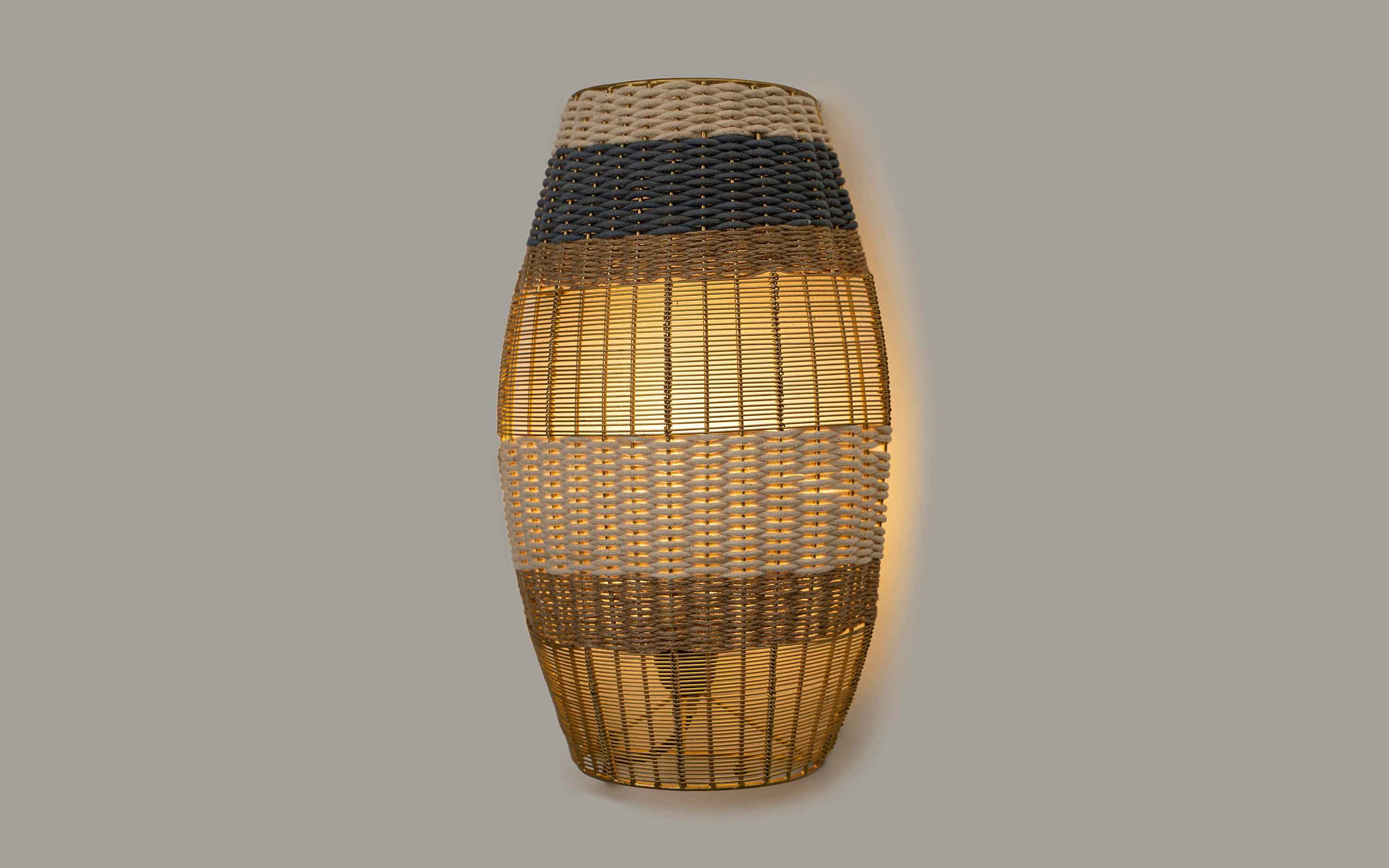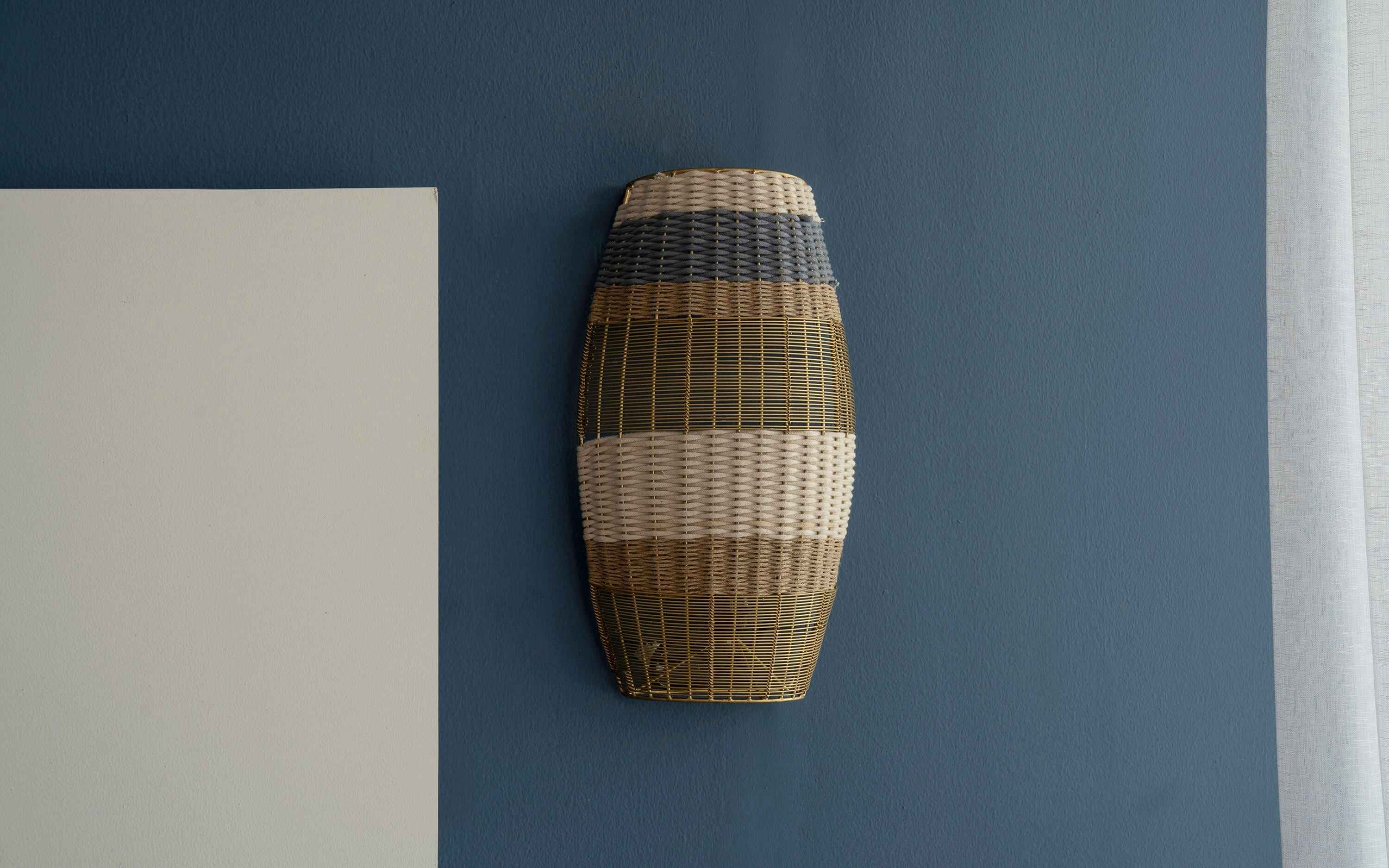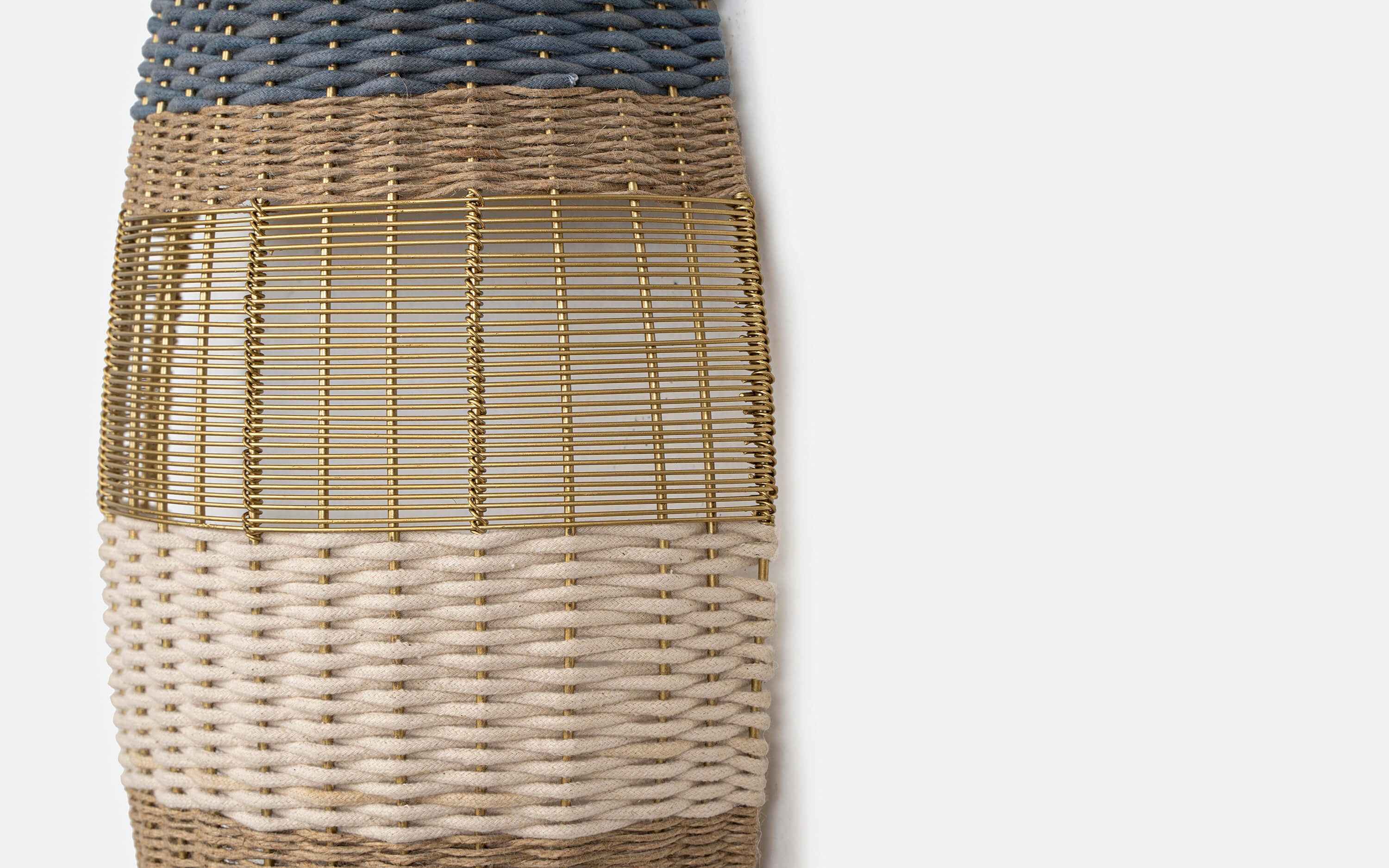 In Greek Mythology, weaving is depicted as heroic, magnificent, clever, valuable, the womanly counterpart to warfare. Arachne was a master weaver by virtue of extensive training, long experience, keen intellect, and fine taste. In this collection three very different kinds of materials- cotton thread in white and blue- depicting the Santorini colors, metal wire in gold finish embodying divine powers, and sisal fiber in natural finish- representing natural contrasting textures are interlaced at more or less right angles to each other within a gold-finished metal framework that holds them under tension. Patterns are created by meticulously varying the length of the threads, each turning back and forth in their own separate areas by our skilled artisans. The overall form follows simple geometry highlighting the visual impact of various textures creating Grecian imagery. "Depending on your screen settings and resolution on your device there may be a slight variance in fabric color and wood polish of the image and actual product. Wood grains will vary from product to product in case of solid wood furniture."