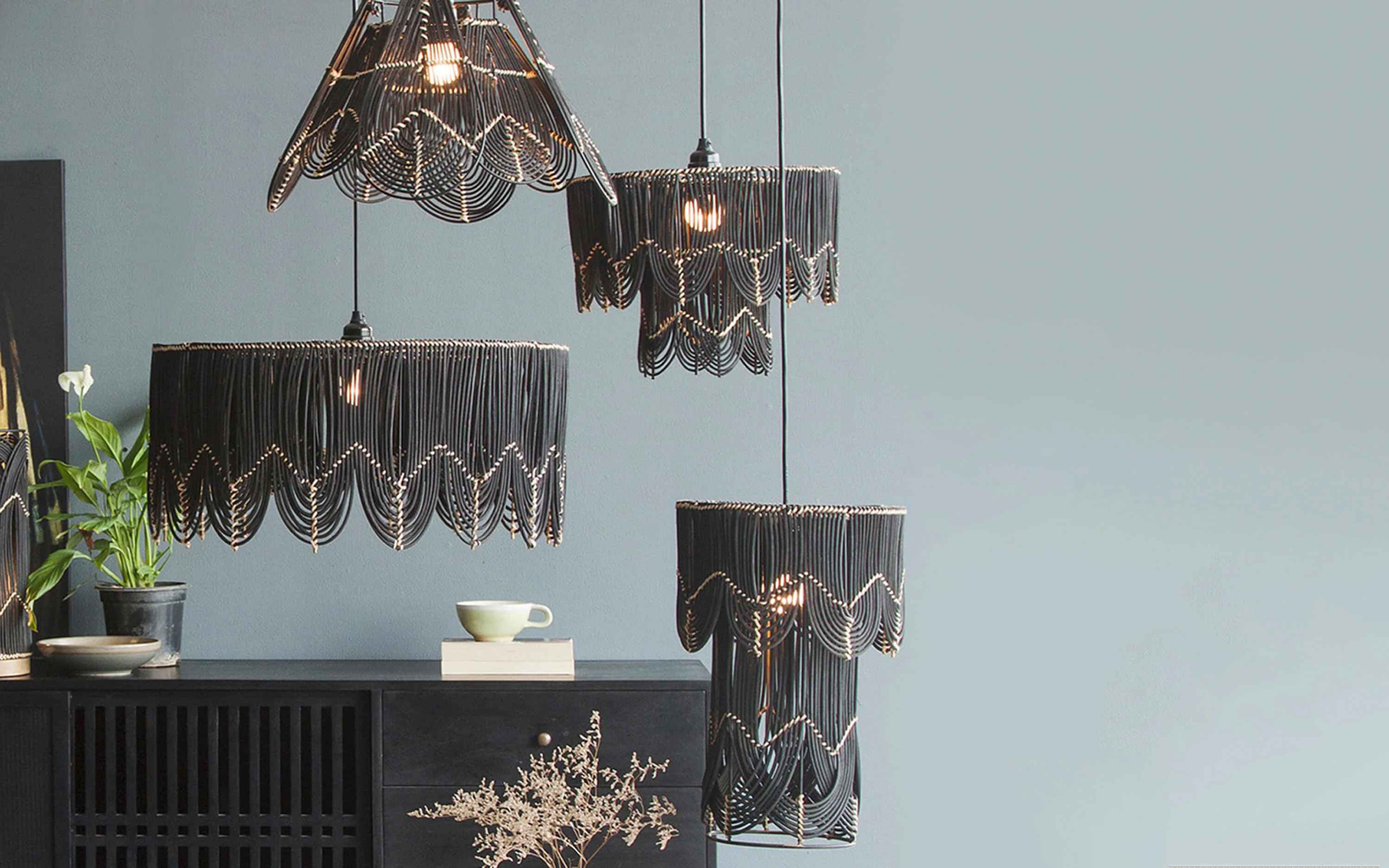 Inspired by Art Deco this collection has clean, bold, rounded concentric lines, which are one of the hallmarks of graphics in that era ushered in a new attitude, characterized by strict functionality, in unadorned styles of modernism using sustainable materials. This Arch Hanging Lamp is tall and made of black cane with a black finish on the metal. It casts a warm and inviting glow in any space, making it perfect for hanging in a hall, living room, or bedroom. The natural cane material gives it a modern and organic feel, while the black finish keeps it sleek and versatile. Whether you're looking for a statement piece or a simple addition to your home décor, this lamp is sure to make a lasting impression. "Depending on your screen settings and resolution on your device there may be a slight variance in fabric color and wood polish of the image and actual product. Wood grains will vary from product to product in case of solid wood furniture."