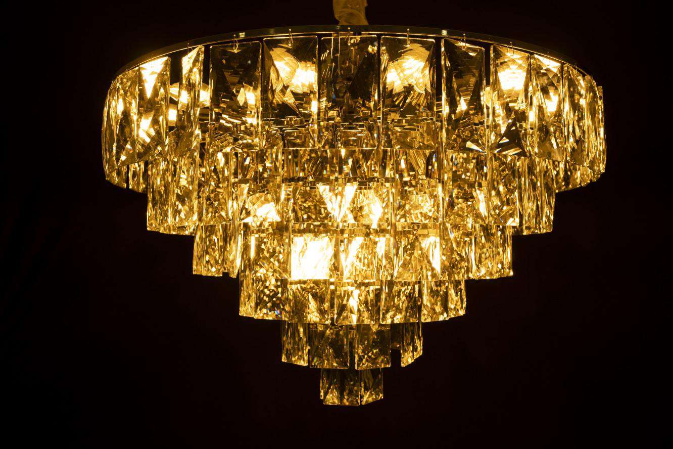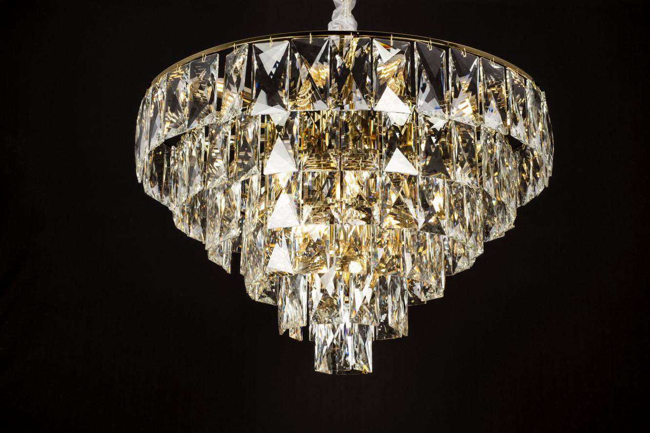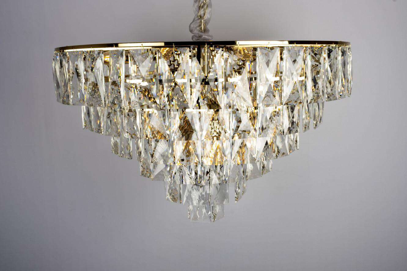Add timeless elegance to your space with this clear crystal chandelier and its sparkling tiered design made from prisms and faceted squares. A band of soothing gold finish metal adorns the top of the tiered, upside down cake design.