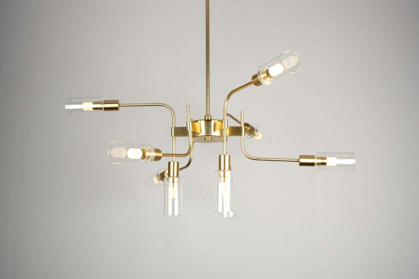 This stunning chandelier features a gold finish center piece upon which several arms are mounted. Attached to each arm is a clear sleek cylindrical glass which houses the light. It is the perfect example for a modern as well as a classic design, all at once.