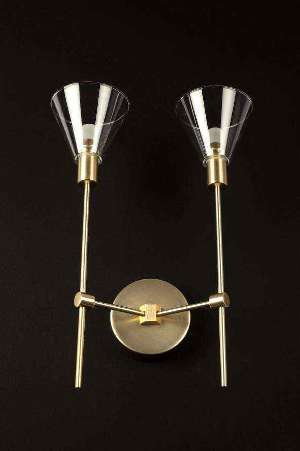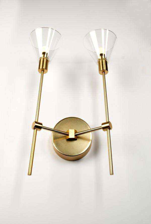 Brighten a hall space or nook with this stunning contemporary wall sconce. This beautiful two-lamp fixture is gorgeously trimmed with gold finish base and topped with a clear glass shade decorated with a striking thumbprint design.