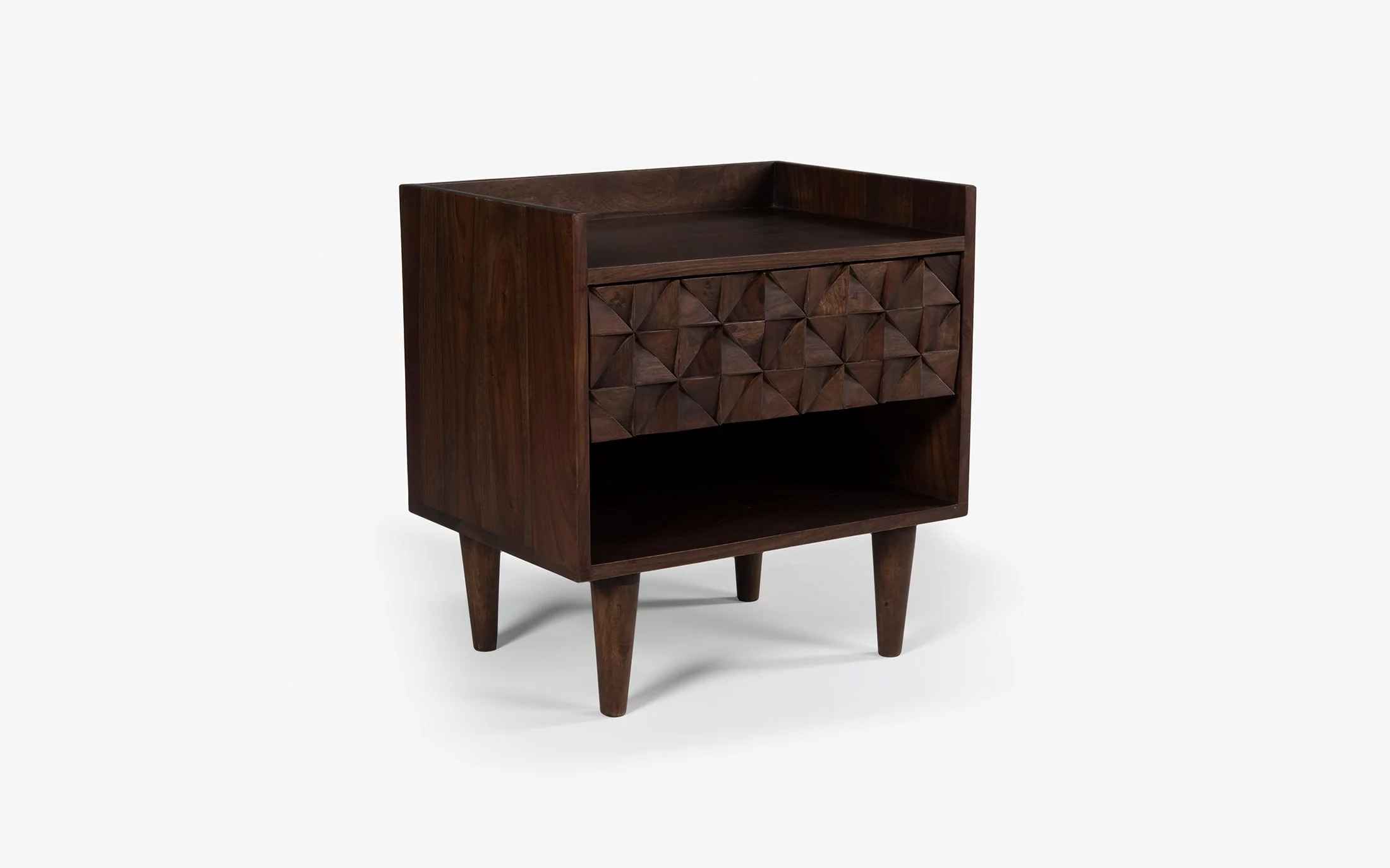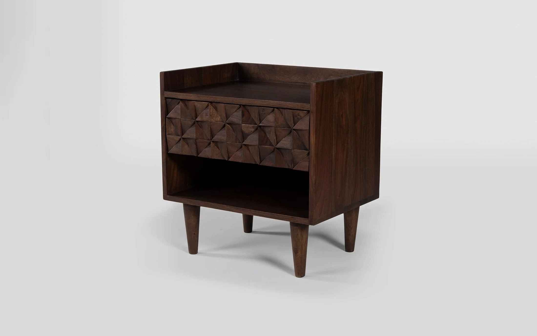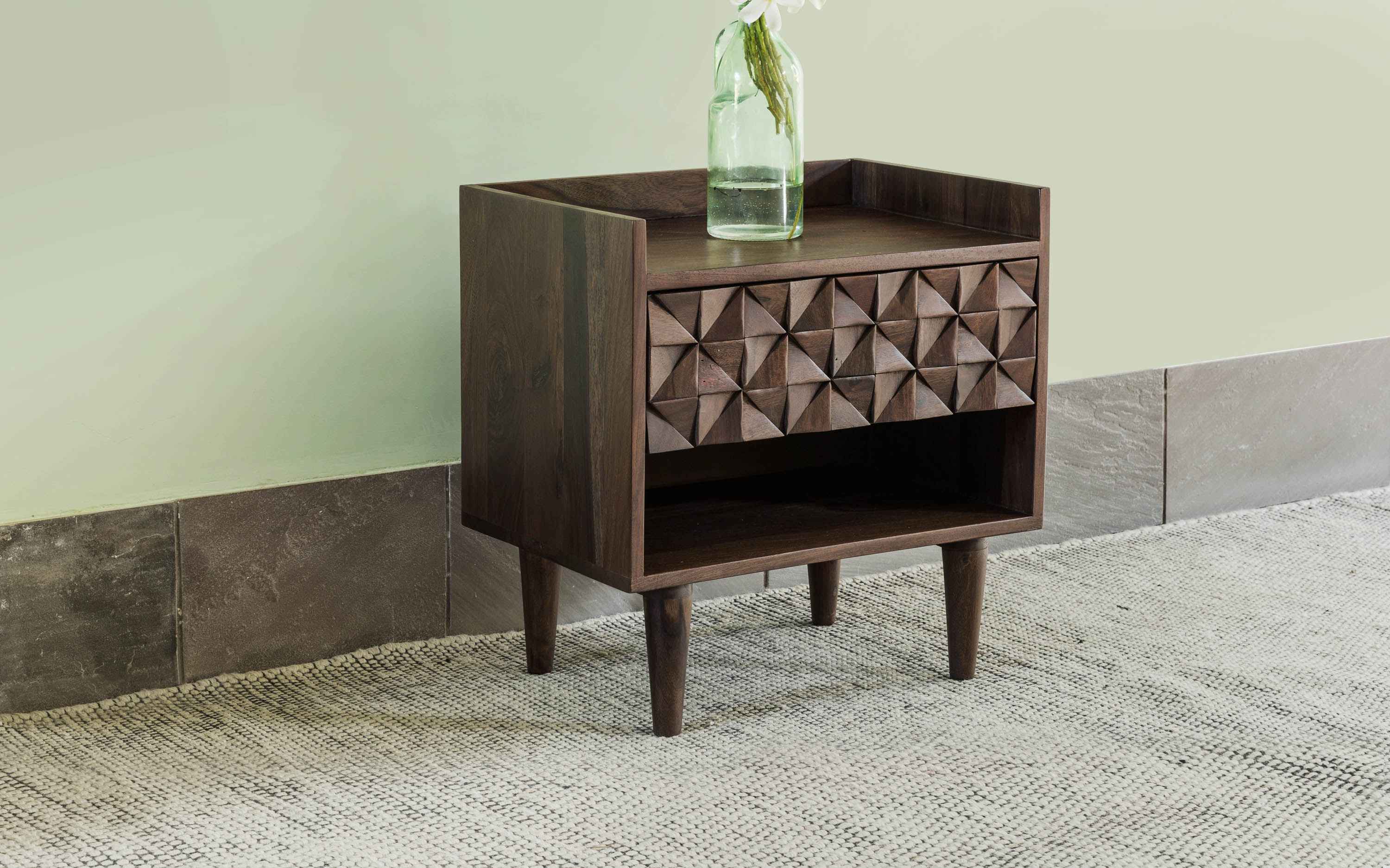 Orangetree presents a perfect blend of art and precision in this timeless collection called Bicasso. Carved out of sheesham wood, the unique design takes up the mind with the rem- iniscence of the work of Picasso. The American walnut finish, which resembles the tint of the walnut tree presents the sheesham wood in its simple beauty. Yet again Orangetree opens up new horizons to the World of design by creating a minimal and artistic collection. The Bicasso bedside table is the perfect choice for your bedroom decor. It is made of Sheesham wood a perfect modern design and has a neat but slightly retro look. "Depending on your screen settings and resolution on your device there may be a slight variance in fabric color and wood polish of the image and actual product. Wood grains will vary from product to product in case of solid wood furniture."