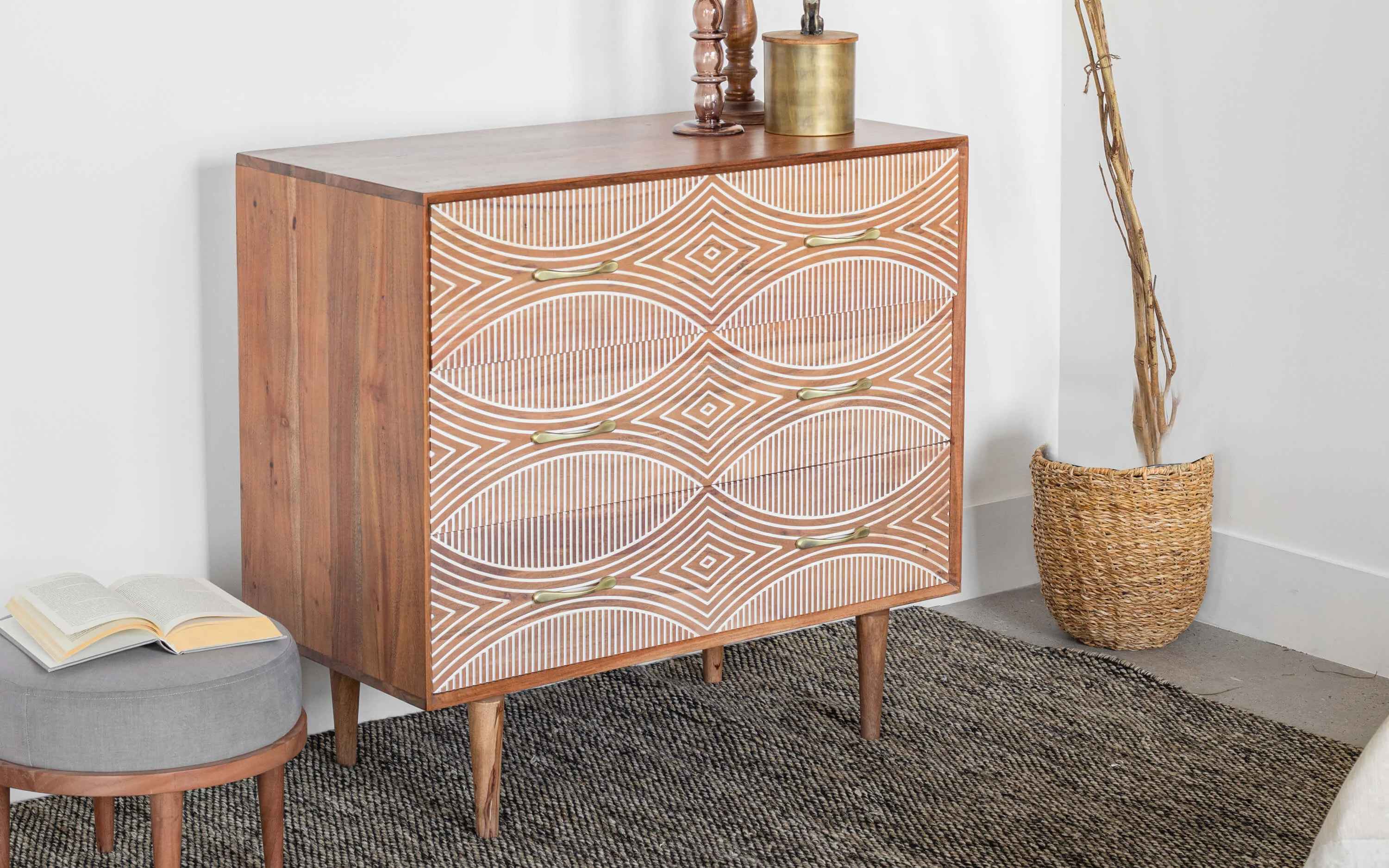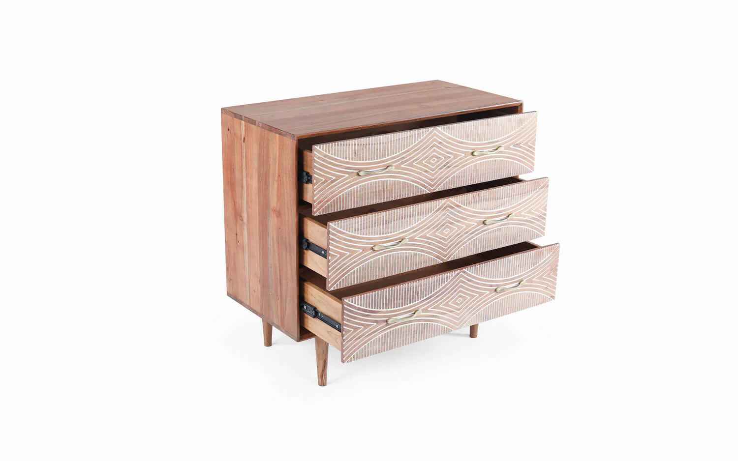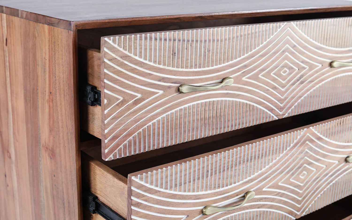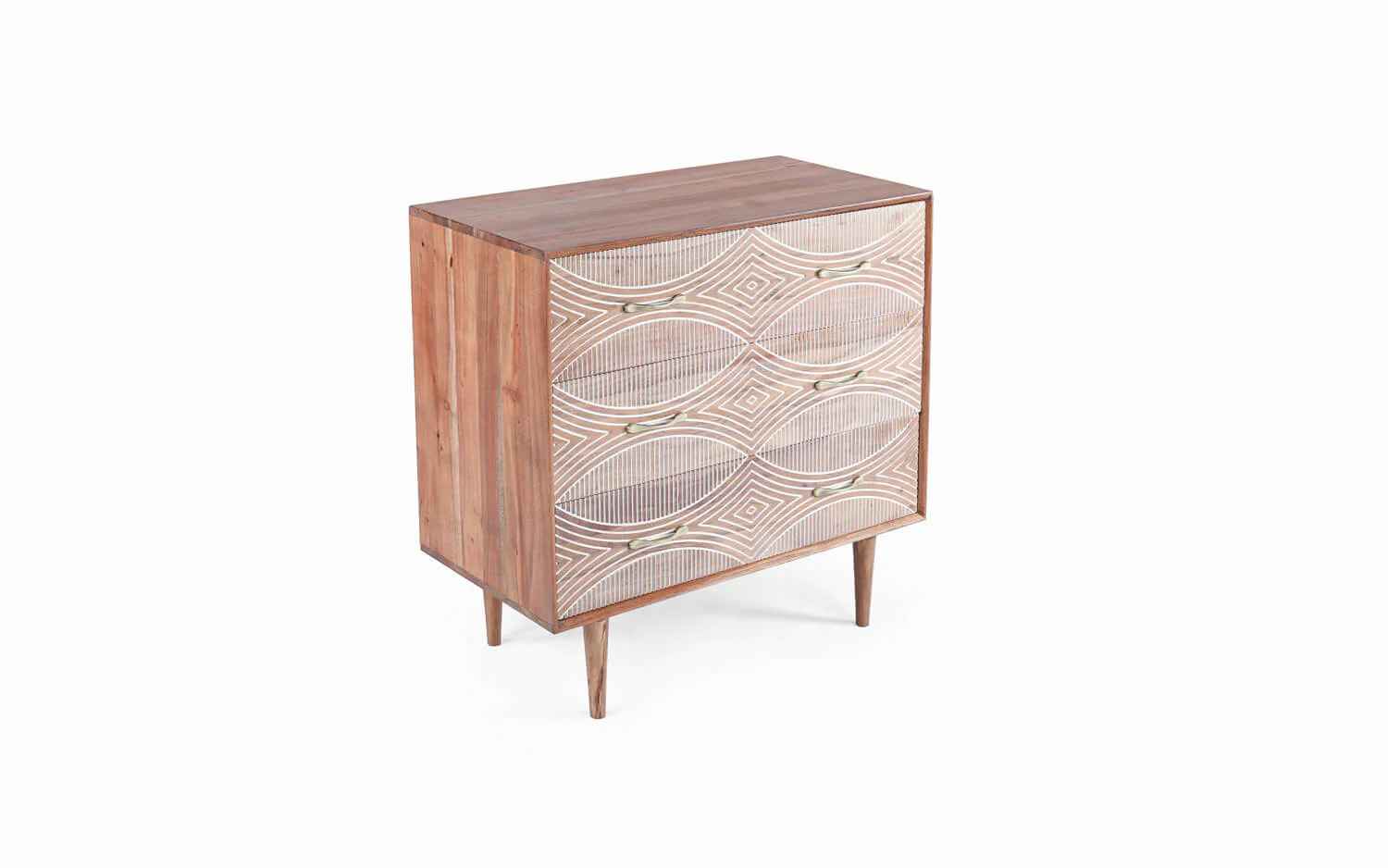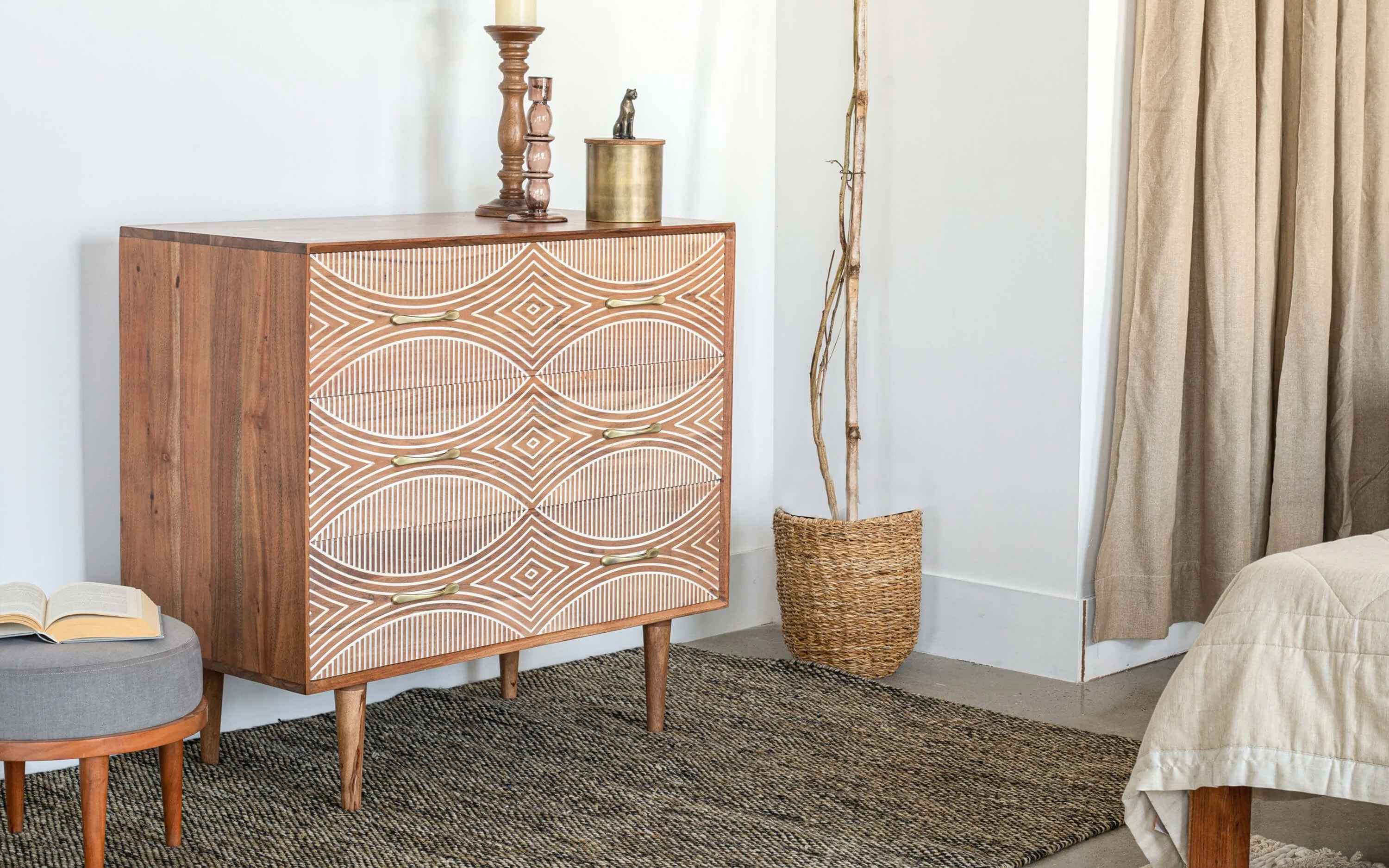 BUNKA collection takes inspiration from the spiral of life. The concentric circles are laser cut in mango wood and finished in white to further highlight the spiral effect. This blend of beauty, technique, and precision adds a modern retro vibe to any bedroom. No harmful chemicals or toxins are used in our furniture. Natural eco-friendly lacquers are used that helps in sustaining a healthy lifestyle. The headboard of this collection is interchangeable and can be replaced with other headboards we offer. Easy to assemble. "Depending on your screen settings and resolution on your device there may be a slight variance in fabric color and wood polish of the image and actual product. Wood grains will vary from product to product in case of solid wood furniture."