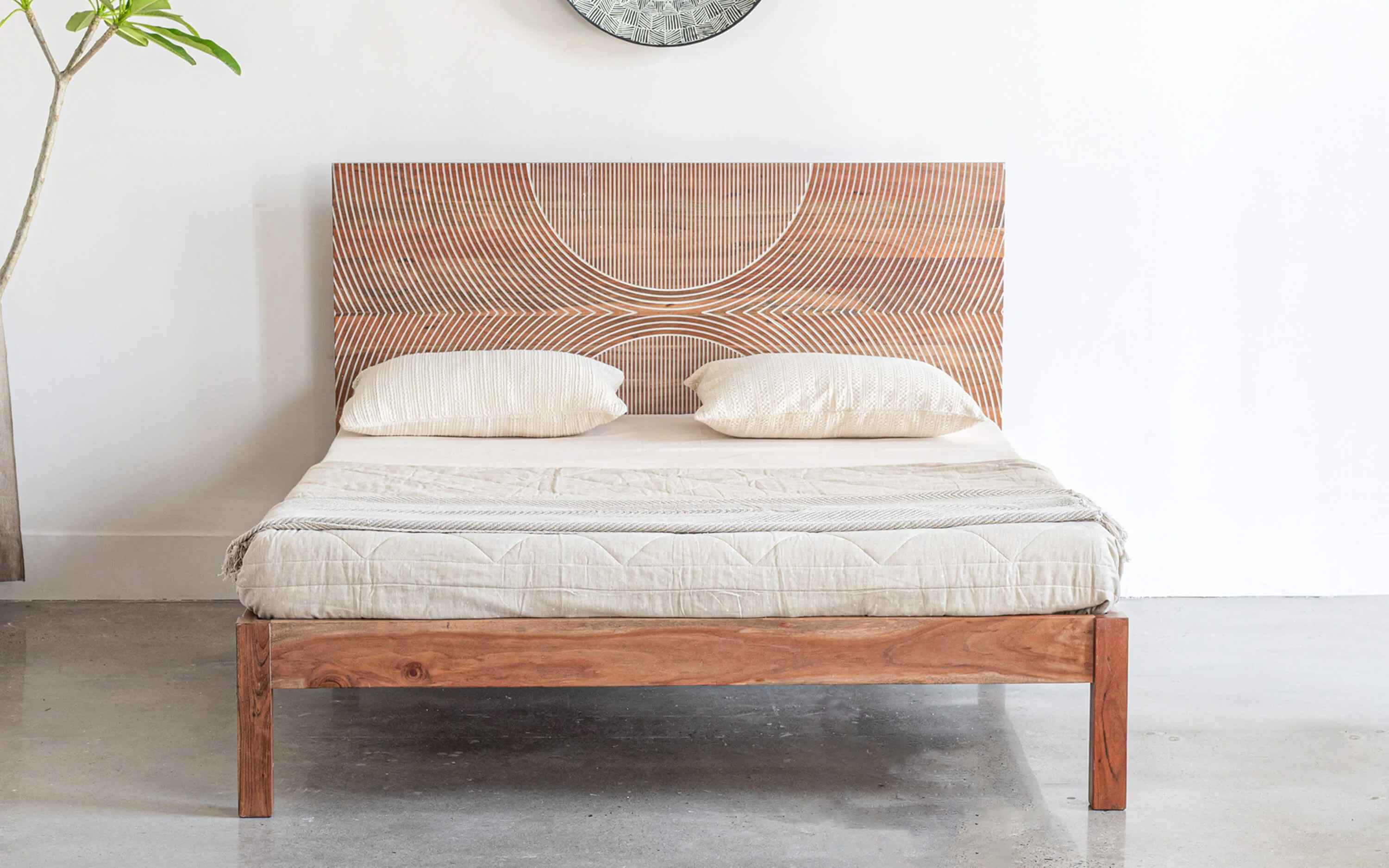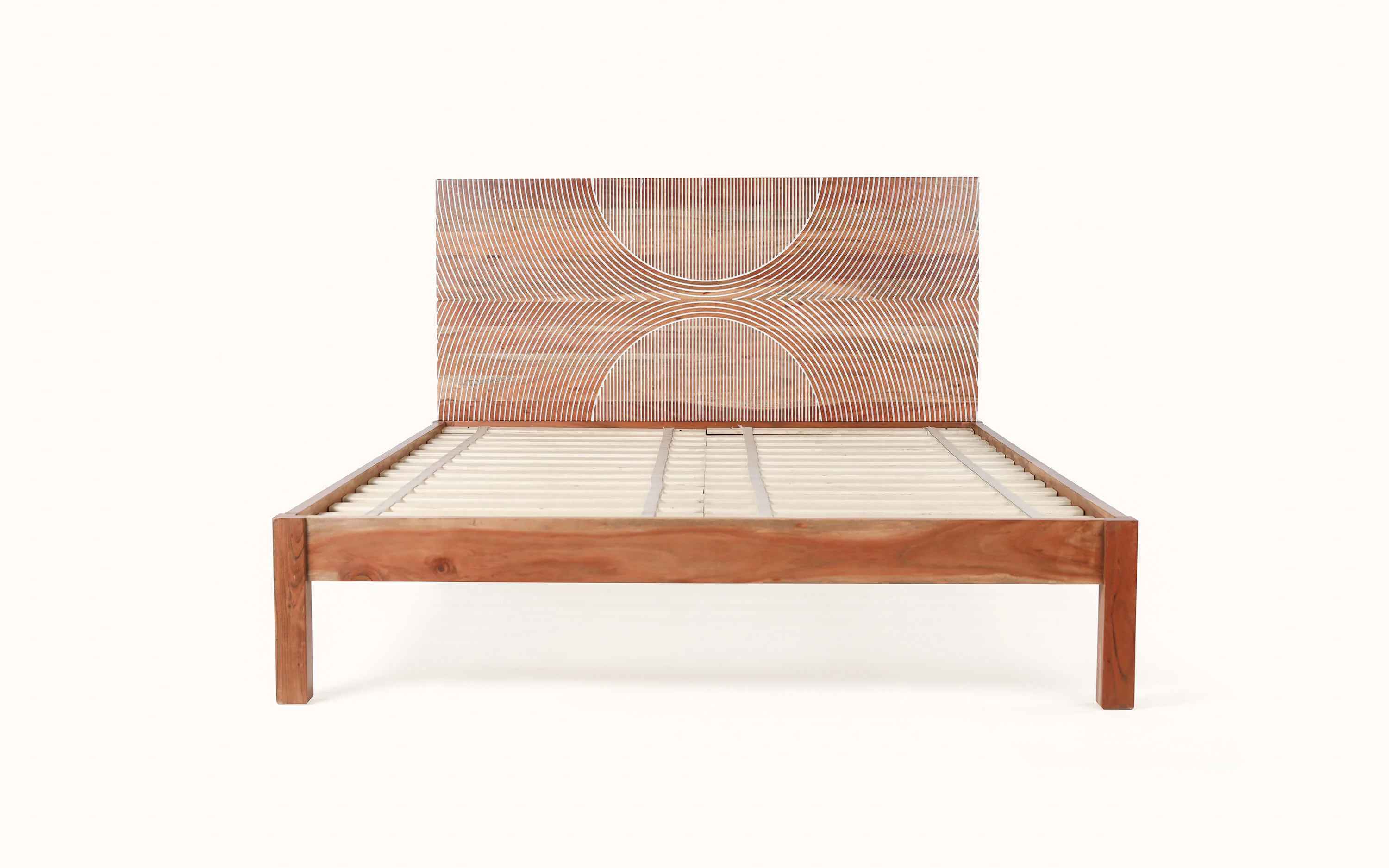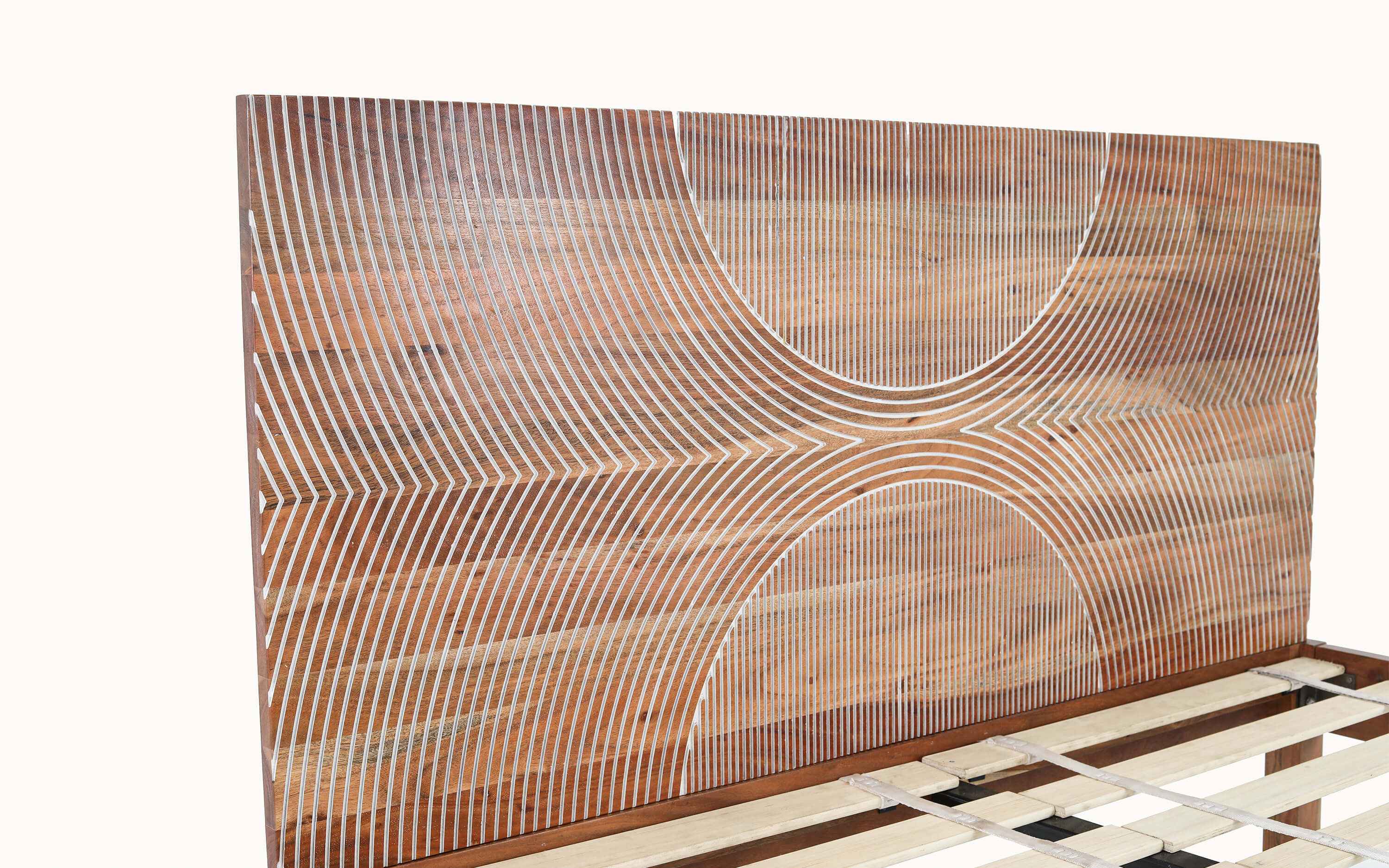 BUNKA collection takes inspiration from the spiral of life. The concentric circles are laser cut in mango wood and finished in white to further highlight the spiral effect. This blend of beauty, technique, and precision adds a modern retro vibe to any bedroom. No harmful chemicals or toxins are used in our furniture. Natural eco-friendly lacquers are used that helps in sustaining a healthy lifestyle. The headboard of this collection is interchangeable and can be replaced with other headboards we offer. Easy to assemble. "Depending on your screen settings and resolution on your device there may be a slight variance in fabric color and wood polish of the image and actual product. Wood grains will vary from product to product in case of solid wood furniture."