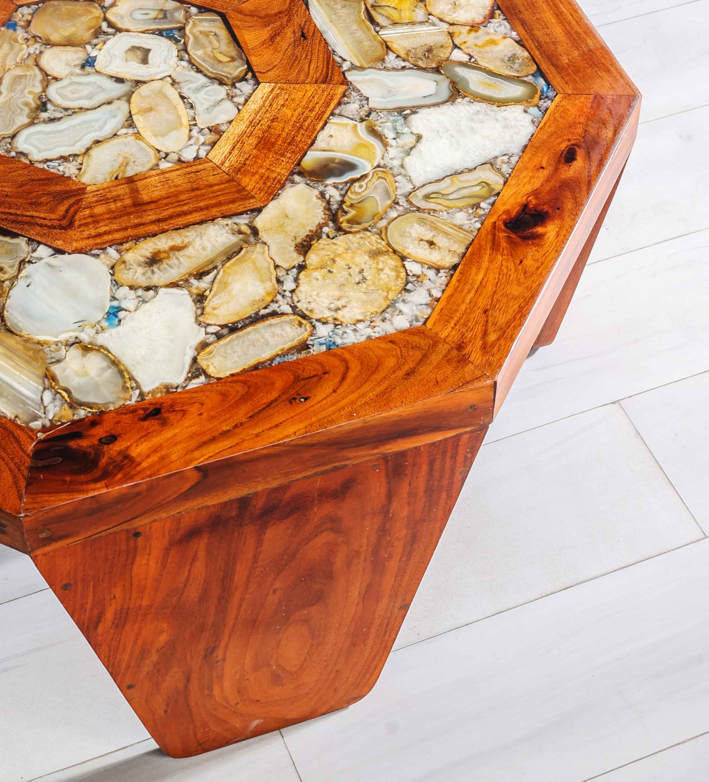 Agate stones inspire this beautiful centre table. It is a lovely blend of the rustic and contemporary setting, which, infused together, gives us the masterpiece. The top of the table is filled with precious agate stones combined together with rustic charm of wood.