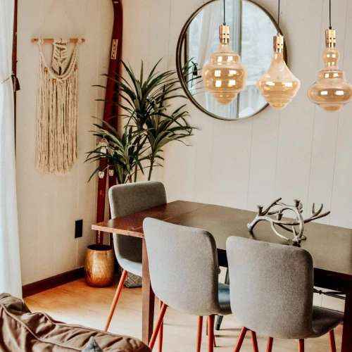 Delicate and romantic, this Casper - B mini pendant is great for adding glamour to a small space. Sleek and elongated, the arm leads down to a soft, eye-catching amber glass shade in a novel shape. Brighten up a stylish bedroom or living room with a sophisticated glow.