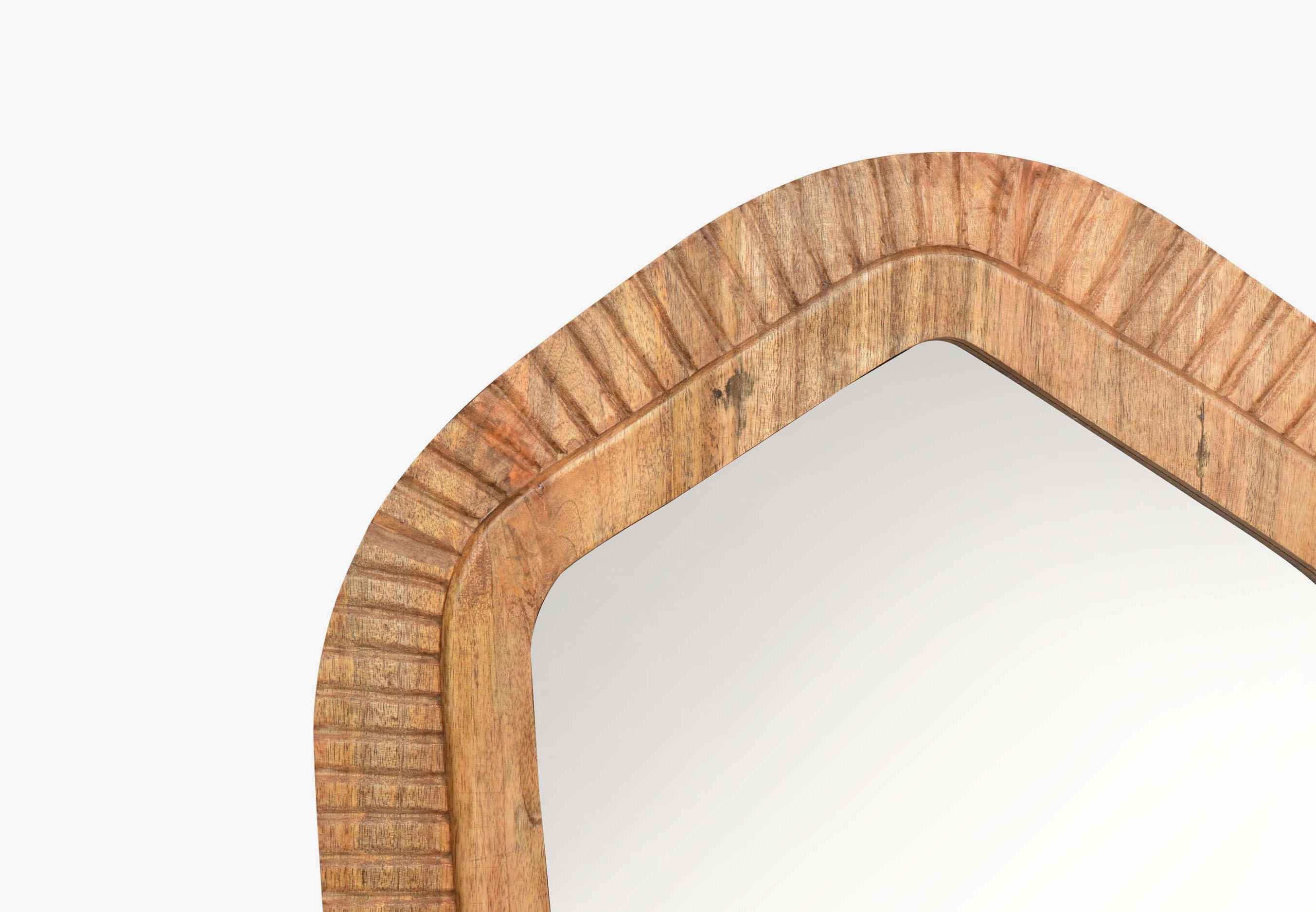 Nostalgia: The handcarved natural wood mirror features a gently rounded frame with intricate handwork on the frame. The Chavi mirror hangs vertically to greet visitors in an entryway, bring light-reflecting brightness to a dark corner or visually enhance the size of a small room. Each piece is crafted from Solid Indian Wood. Natural variations in the wood grain and coloring are to be expected, no two pieces are alike. "Depending on your screen settings and resolution on your device there may be a slight variance in fabric color and wood polish of the image and actual product. Wood grains will vary from product to product in case of solid wood furniture."