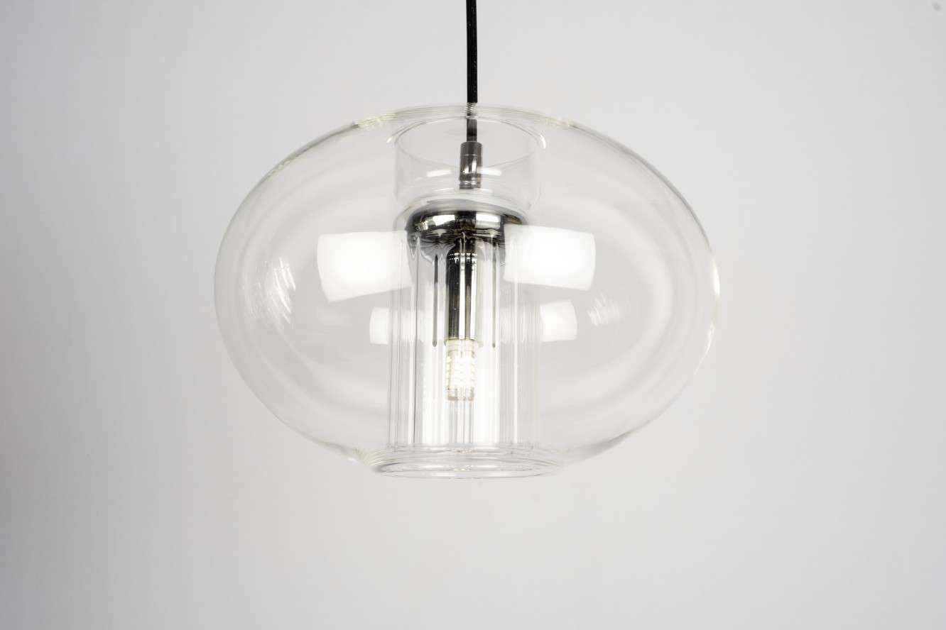 A chrome nickel finish boasts modern elegance on the frame of this steel mini pendant. Its clear glass shade shows antique personality with eye-catching ribbing. It illuminates your favorite decor through it's bold presence. Available in two sizes.