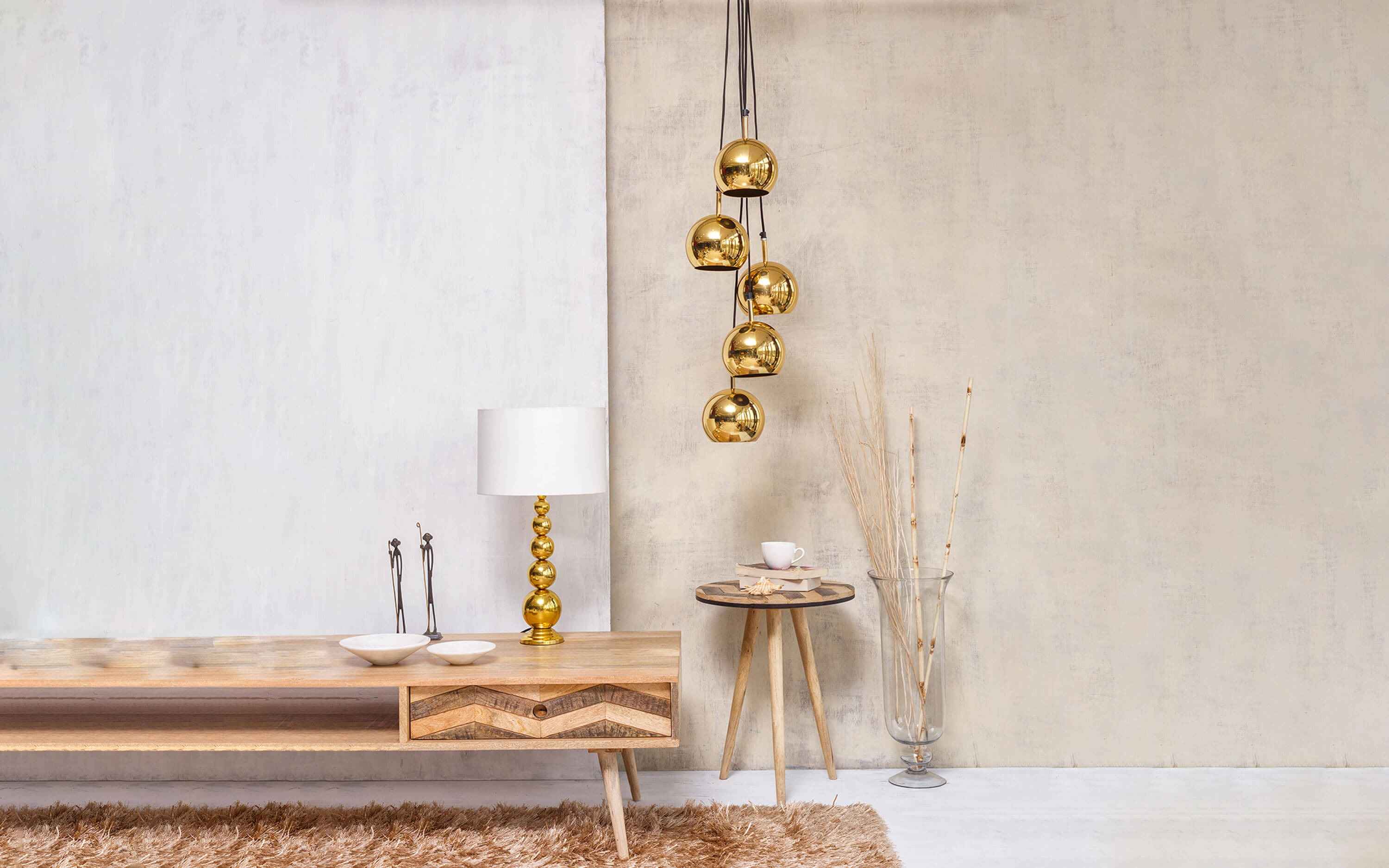 High-low lighting. Crafted from Stainless steel with shinny gold polish, each of our 5 pendants can be adjusted. Pull them all the way up to the ceiling for a clean look or let them hang at different heights over a dining table. "Depending on your screen settings and resolution on your device there may be a slight variance in fabric color and wood polish of the image and actual product. Wood grains will vary from product to product in case of solid wood furniture."