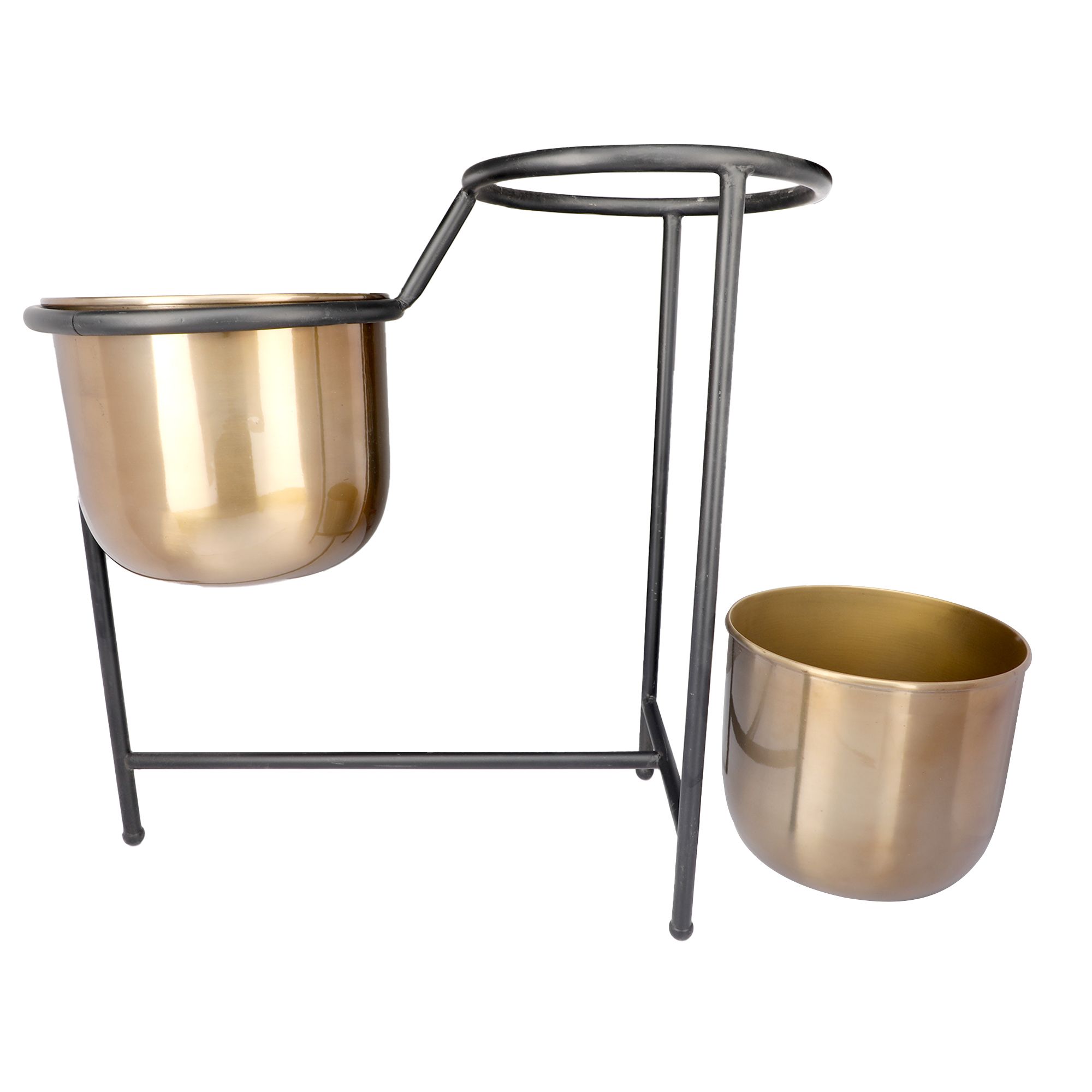 The total height of the planter with stand is 18 Inches (Plants not included) The dimensions of Planter & Stand are: PLANTER: (L * W * H) = (18*7*18) Package Contents- 2 Pot 1 Stand (No Plants Included) This planter is ideal to be used as a floor planter Material: Galvanized Metal With Powder Coating The planter pot doesn't come with the drainage hole at the bottom Volume of the planters pot is 720 ML Notes: a) Does not come with plants as shown in the picture. b) There might be slight variation in the color and design as the product is made by hand
