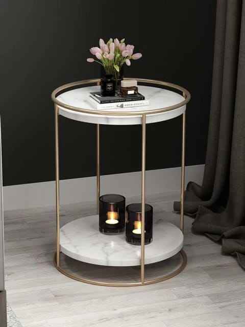 (Gold) Dual Tiered Gold Marble Side Table in gold boasts a perfect design with its sturdy iron frame and vintage-looking tabletop, which create an elegant mix of styles. This side table stands out with its individual character and remarkable durability, making it a functional and stylish addition to any space. With its wide range of applications, it can be placed in your home, bedroom, showroom, or other areas. It can serve as a telephone table, tea table, coffee table, or even as a lamp stand, making it a versatile piece that adds both beauty and functionality to your decor.
