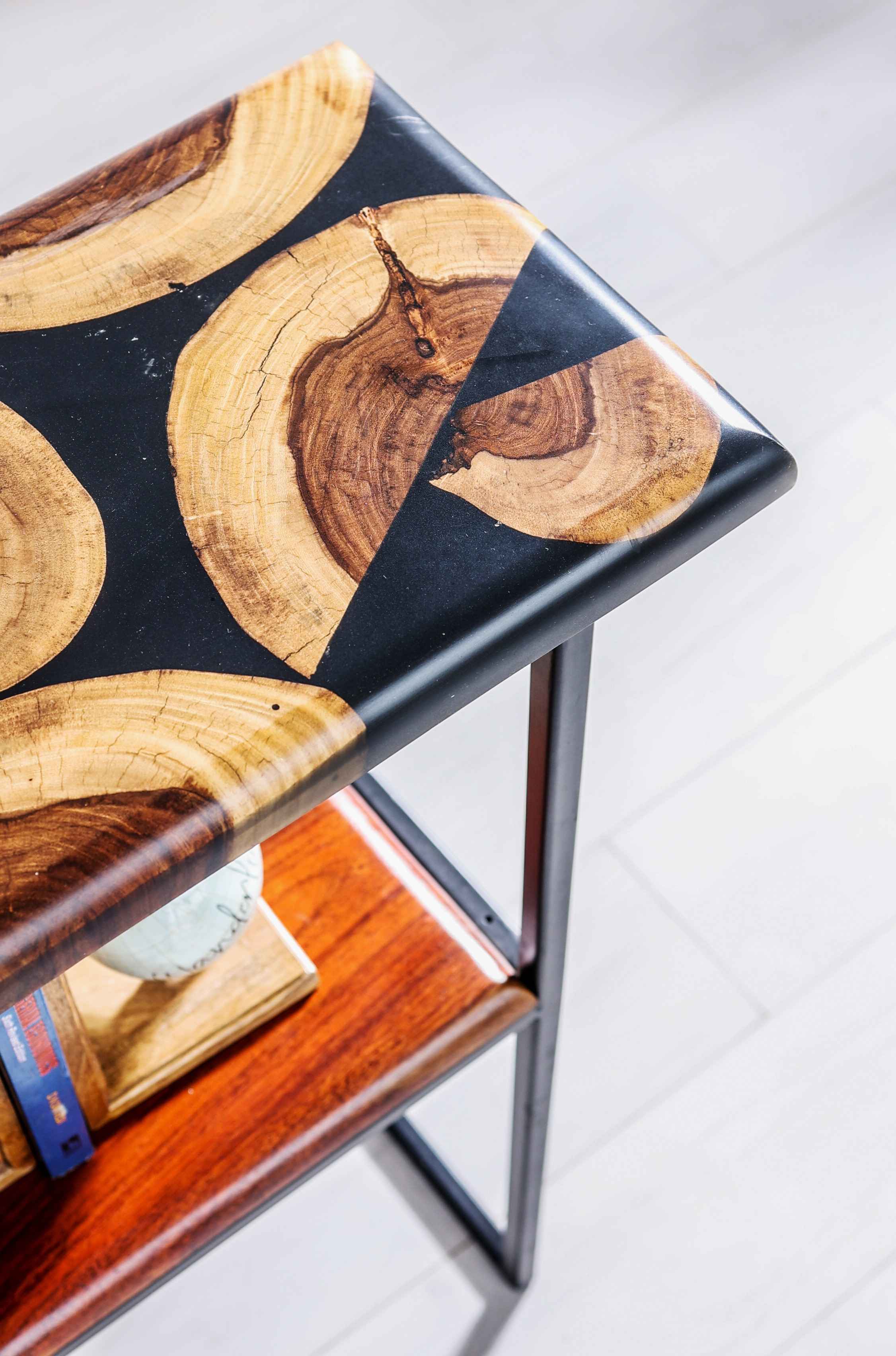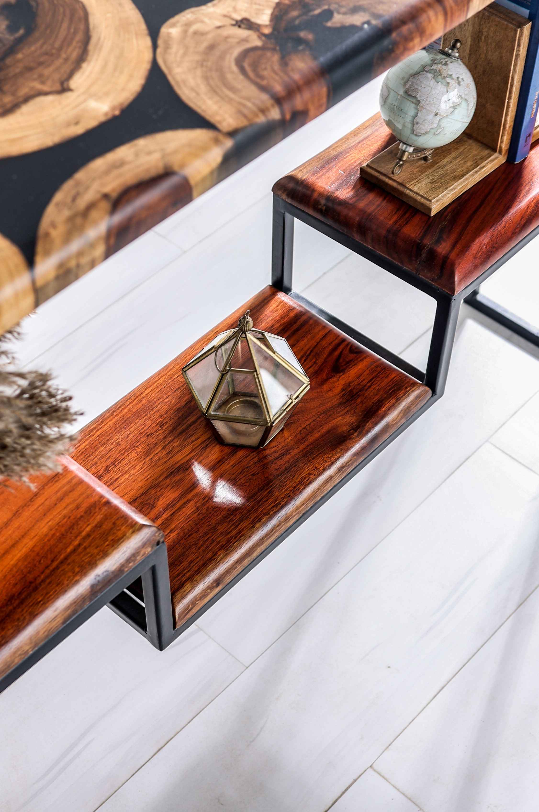 The Black Sea inspires this console between the different islands. It becomes unique in its design because of the presence of baby Sheesham cookies. This console is a blend of very traditional and contemporary styles together. Crafted from Solid Sheesham Wood and Black Epoxy Resin, this black console comes with a matte finish.
