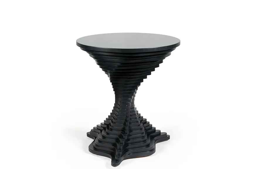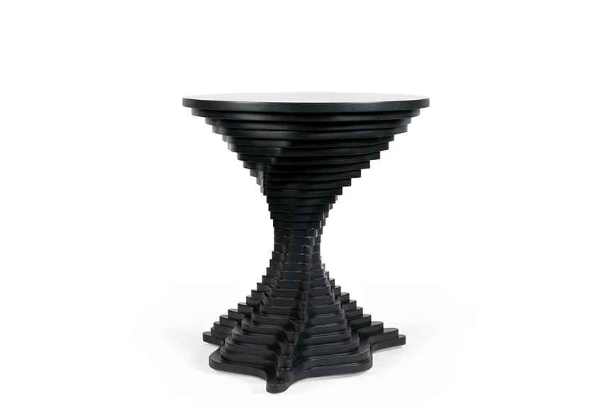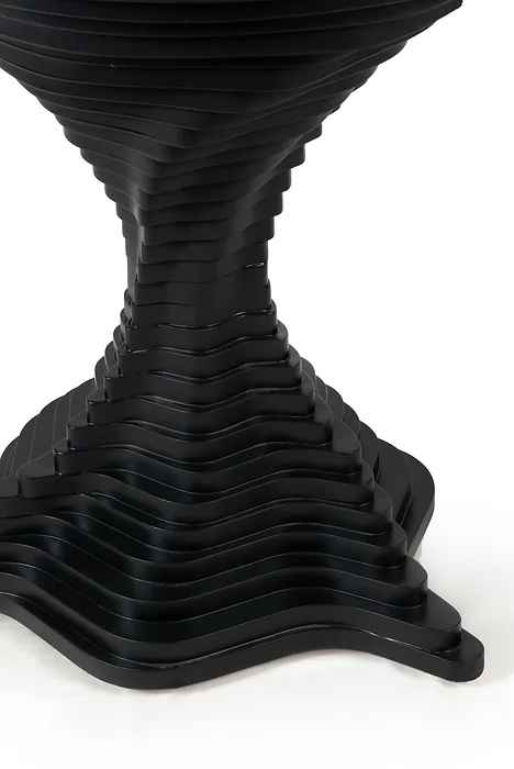 The ghost table is the result of multiple design iterations leading to an unexpected silhouette; an irregular geometry that progressively transforms into a circular shape, leaving behind an organic metamorphosis. A layered composition of 31 sections in green plywood (water resistant), finished with matt polyurethane paint Clear glass (8mm thickness) Adjustable leveling foot Cleaning instructions: Clean the surface with lint free cloth Suitable for Indoors and semi covered spaces