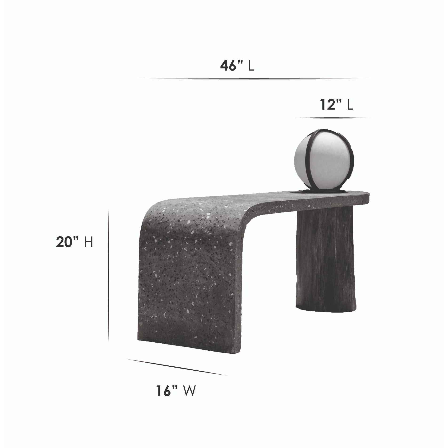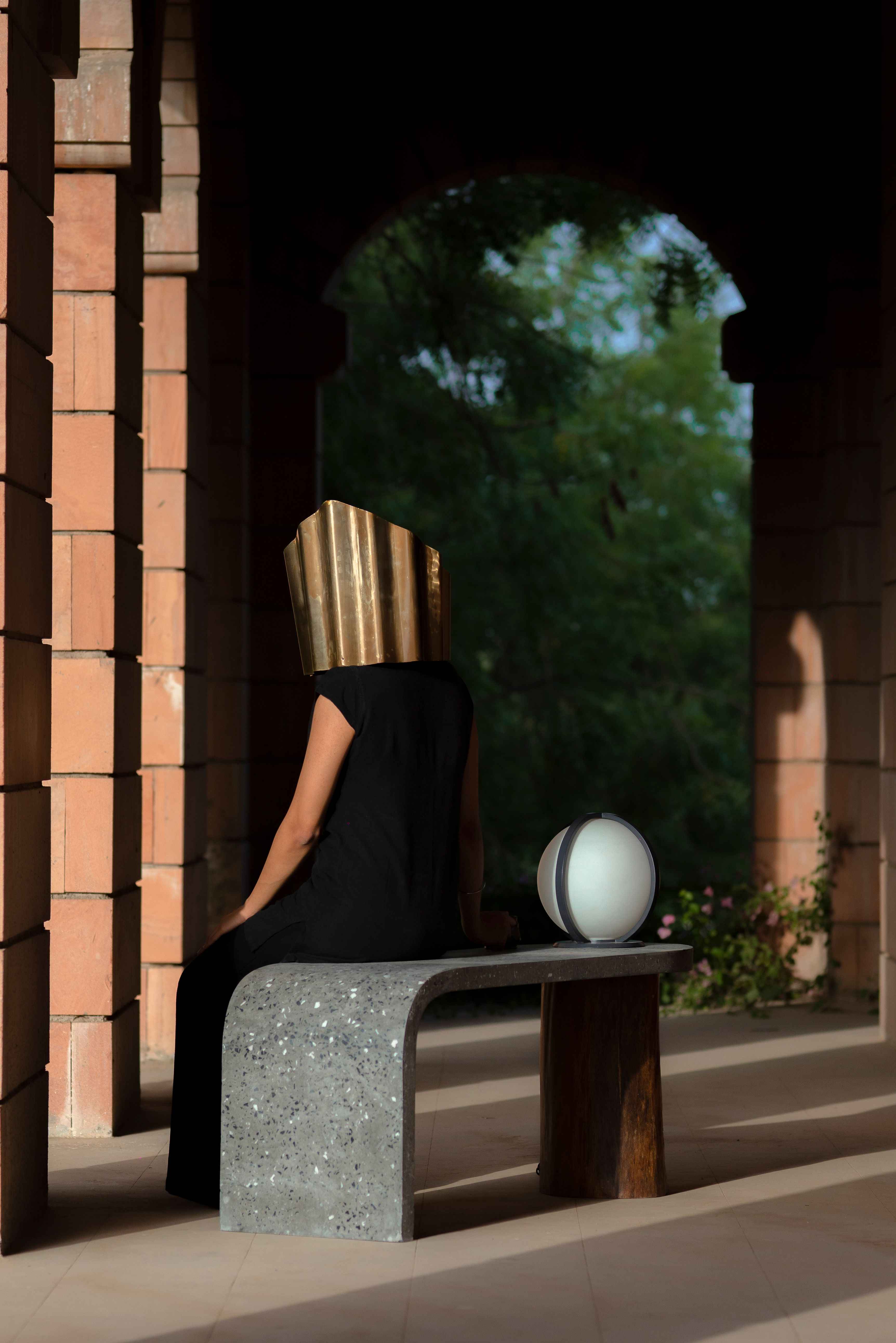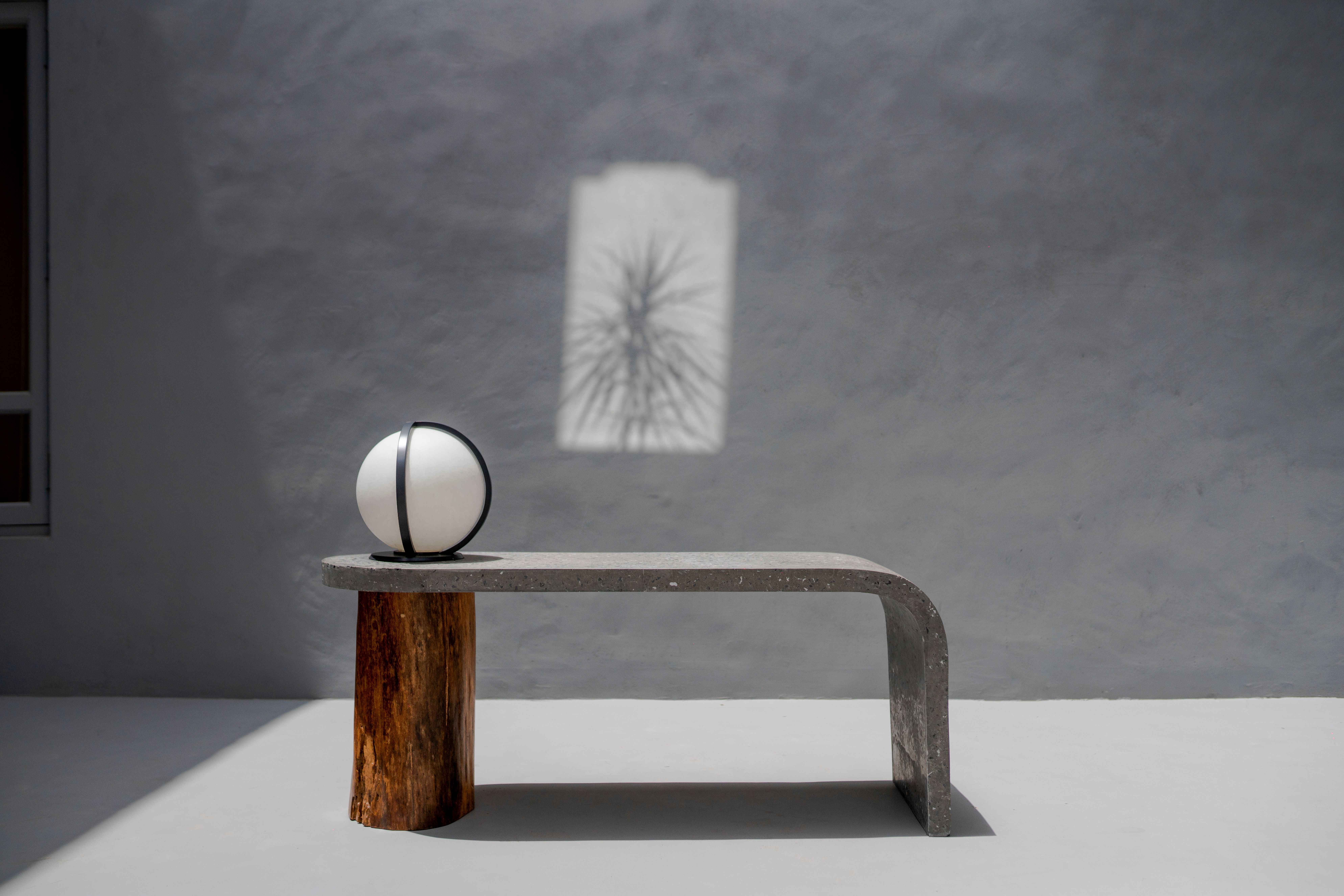 On one side, a concrete terrazzo bench top is curved to form a leg and balanced with a polished natural wood trunk on the other. A large dome light covered by a wooden arm support adds to the piece's functionality and beauty. This is suitable for both indoor and outdoor use.