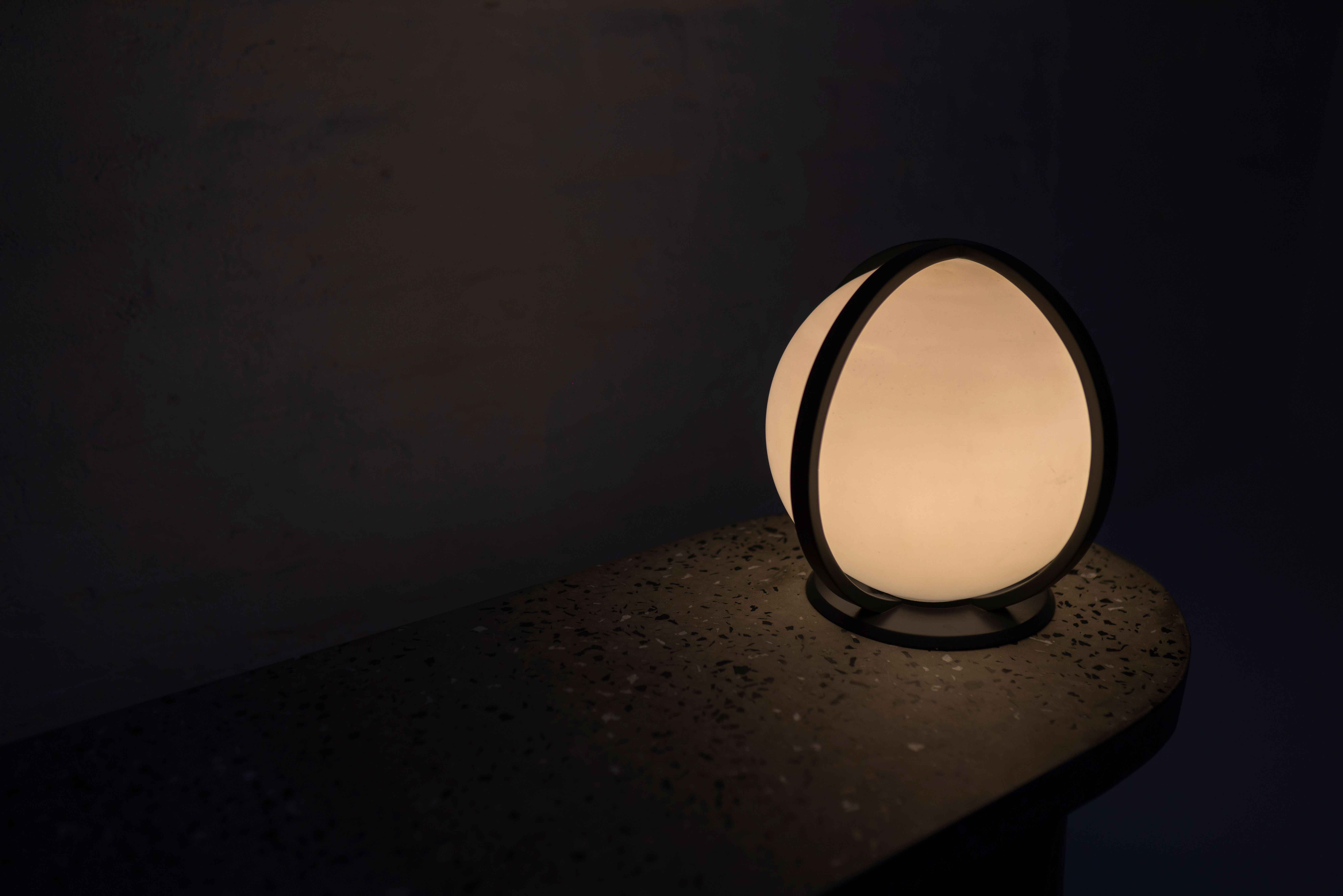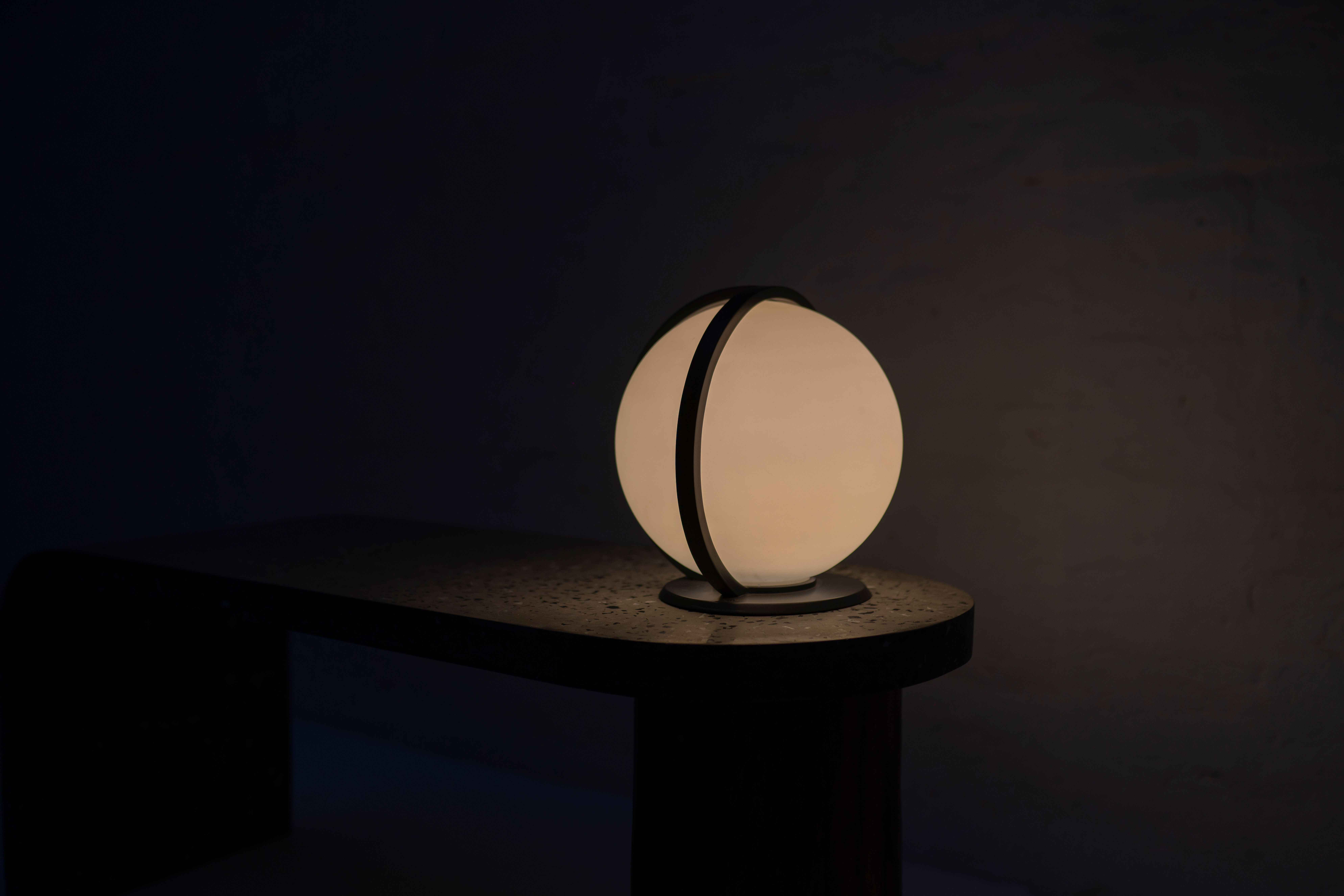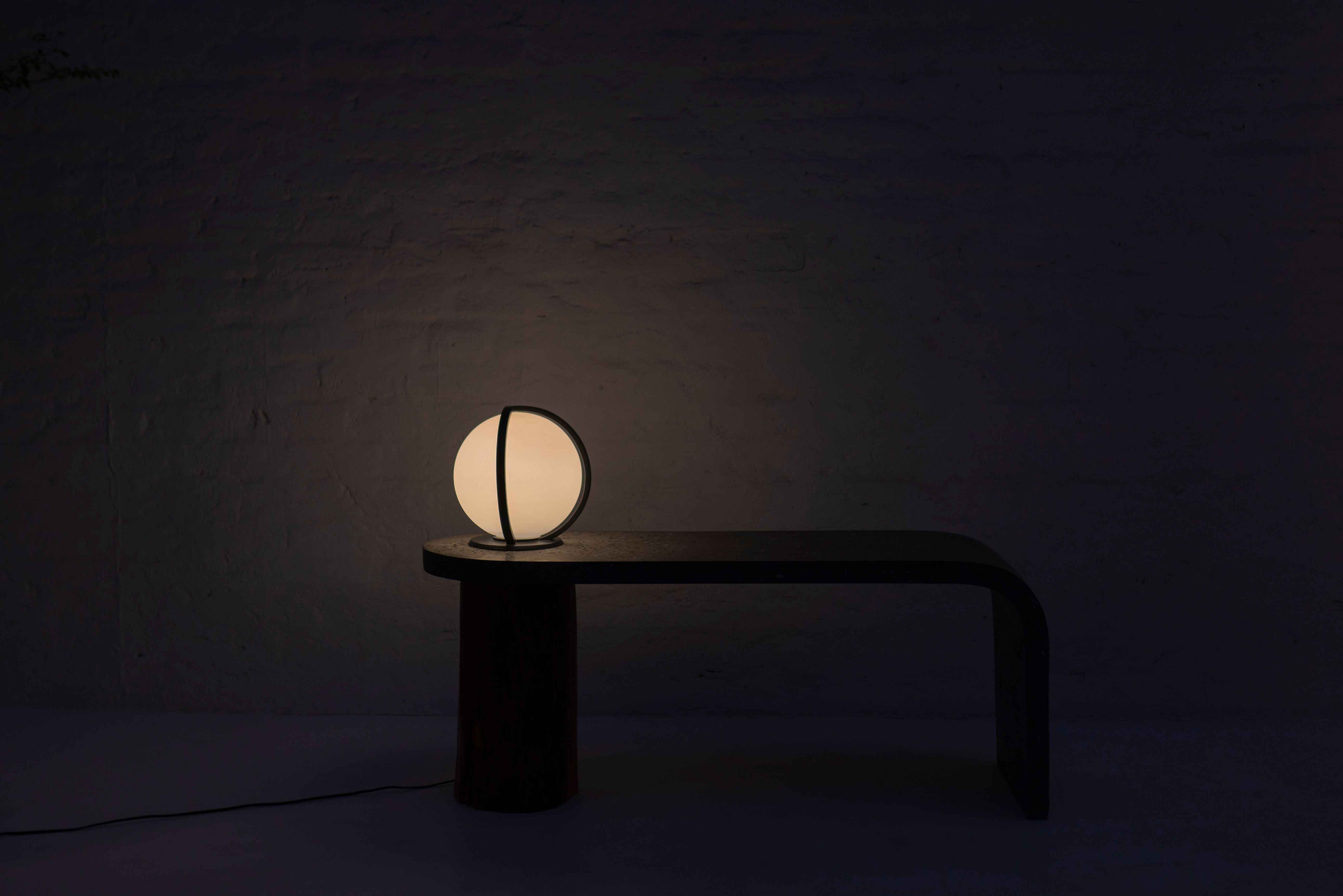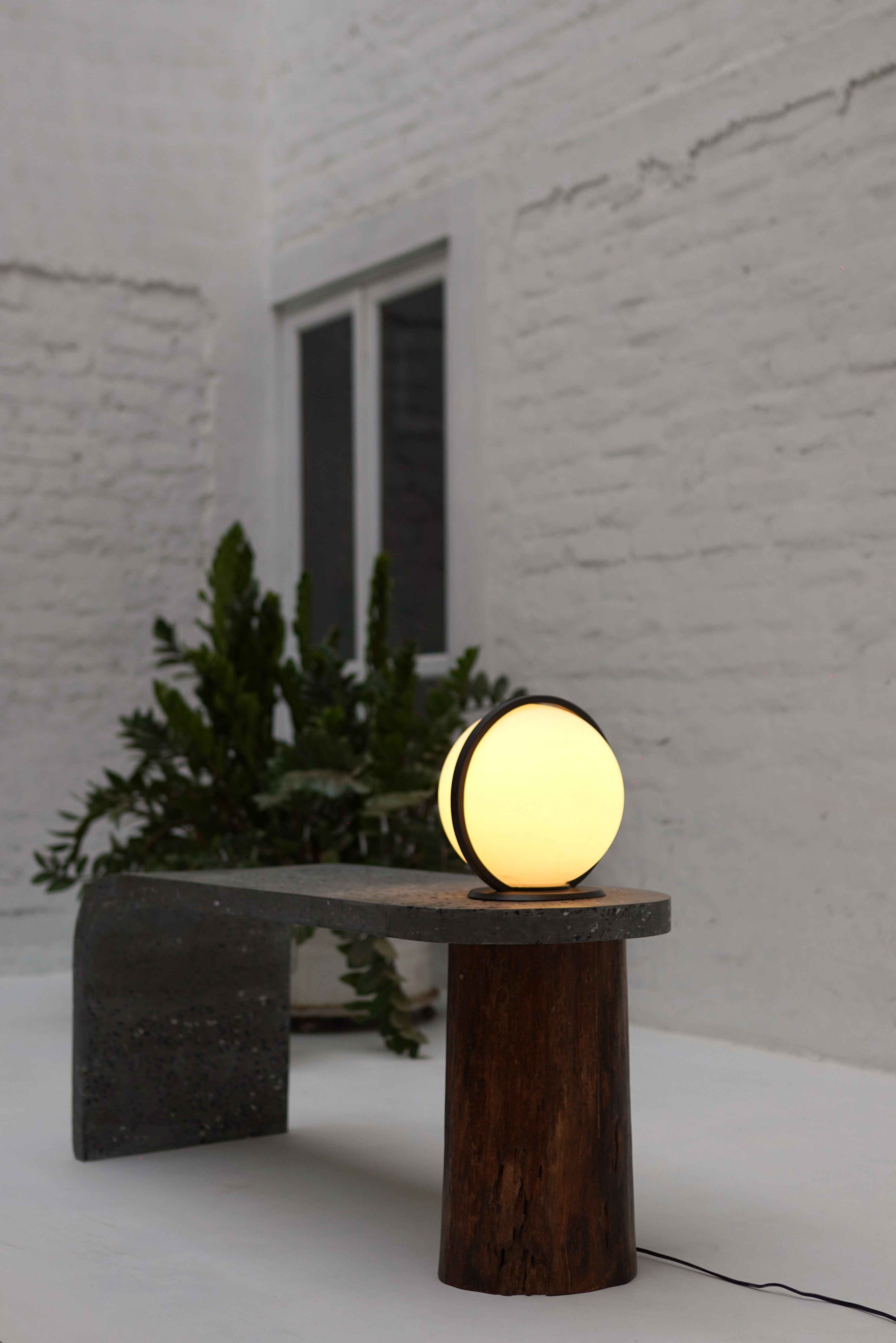On one side, a concrete terrazzo bench top is curved to form a leg and balanced with a polished natural wood trunk on the other. A large dome light covered by a wooden arm support adds to the piece's functionality and beauty. This is suitable for both indoor and outdoor use.