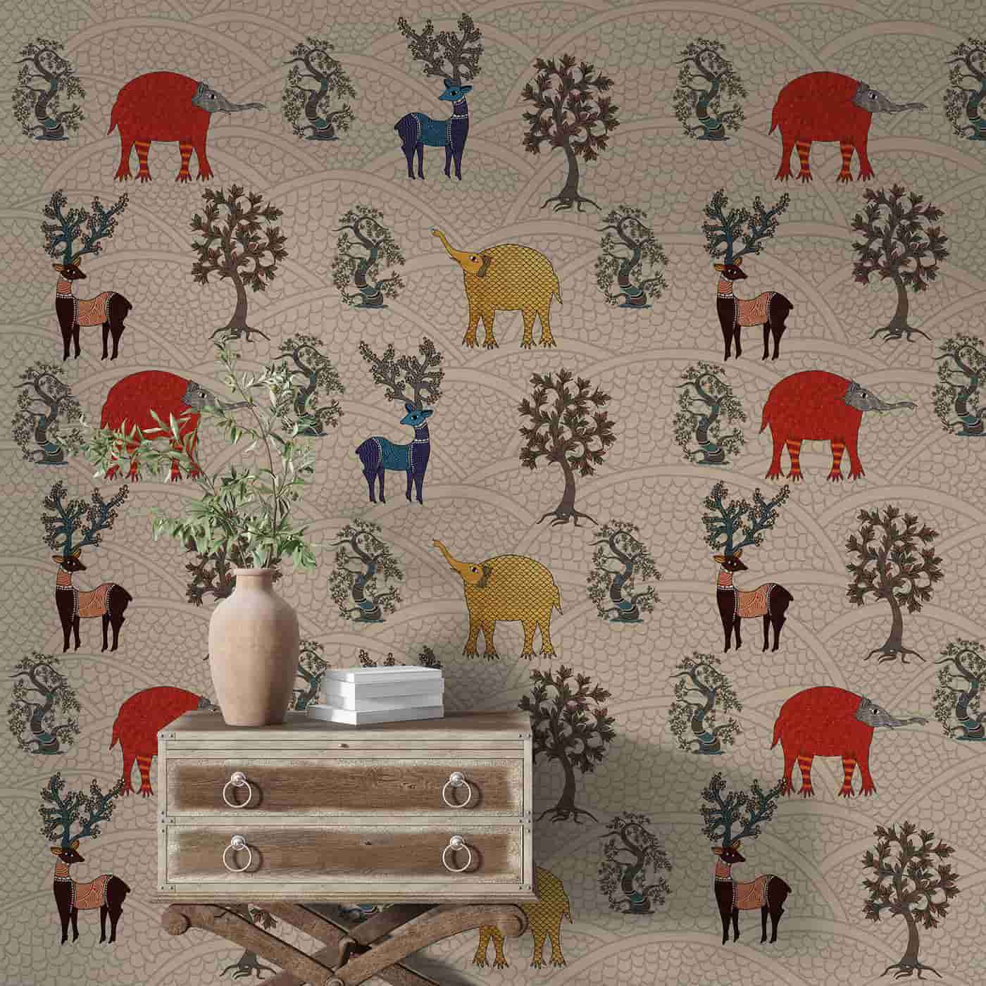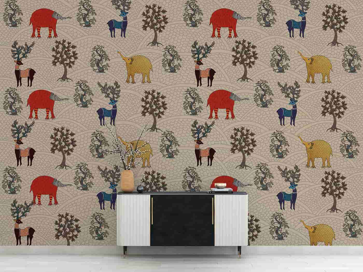 Gond painting is a famous folk art of the Gond tribal community of centralIndia. A community of around four million people spread all over central India, Gonds have a recorded history of 1400 years. The word ?Gond? comes from the Dravidian expression ?Kond? which means ?green mountain?. The central theme of Gond paintings is nature. Gond artists portray nature in various ways in Gond paintings because they believe that the life of man and nature are interlinked. They believes that seeing a good image brings lots of good luck to them. Women use natural colors to paint the walls and floors of their homes. We at Wall Curry have put in our best efforts to preserve and contemporise this art heritage of India and present it to the world. Get this traditional art form to adorn your home today! All our murals are custom-made to fit your wall?s dimensions and they are all supplied in panels. Every wallpaper mural we produce is unique to you. We don?t hold stock.