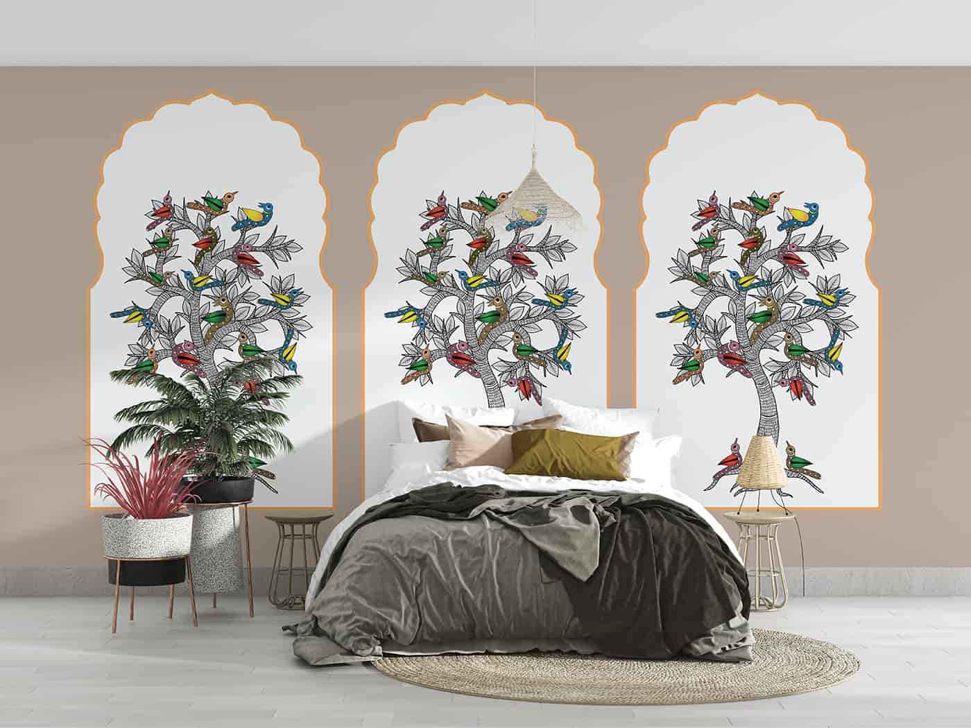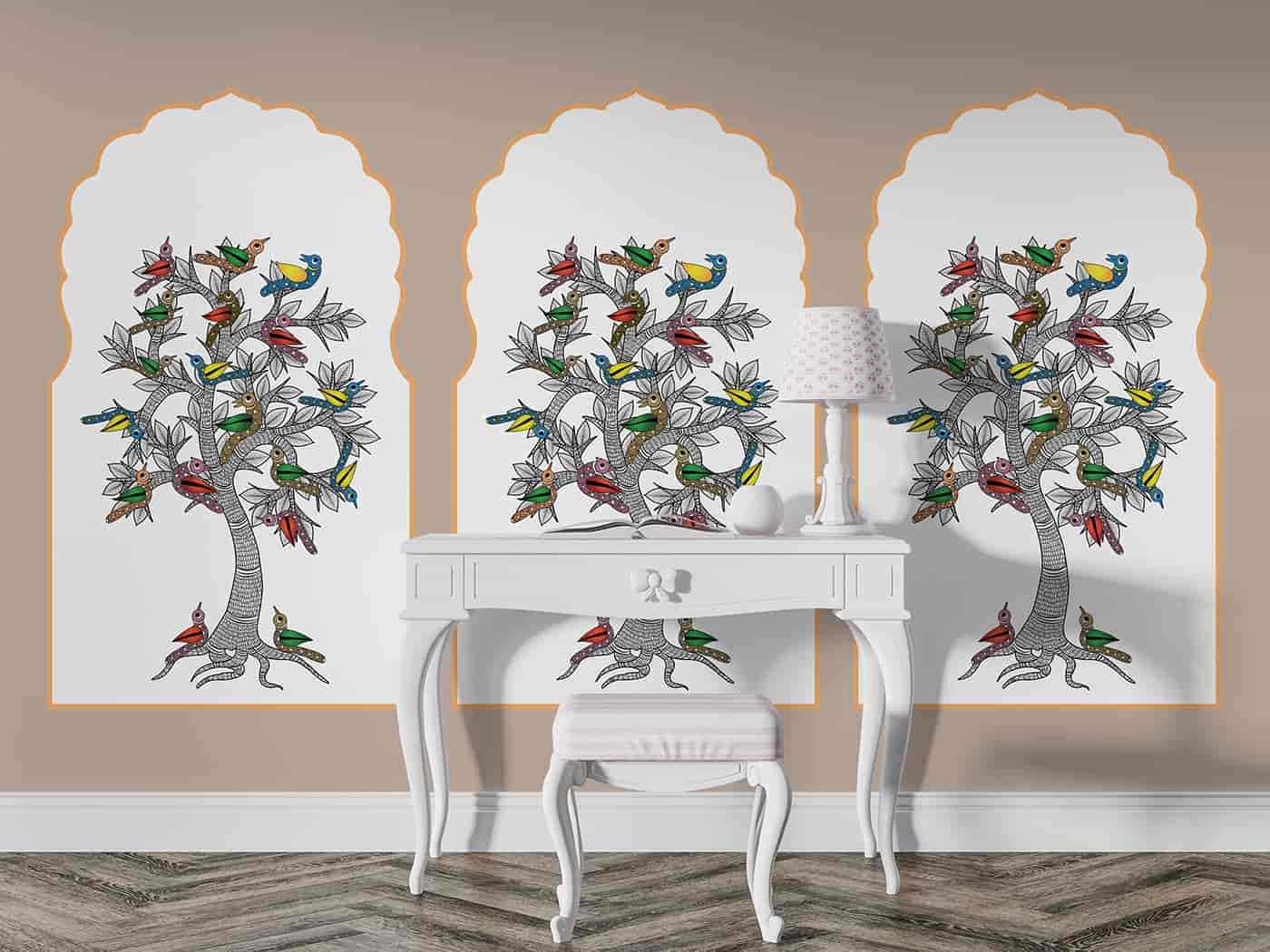 Gond painting is a famous folk art of the Gond tribal community of centralIndia. A community of around four million people spread all over central India, Gonds have a recorded history of 1400 years. The word ?Gond? comes from the Dravidian expression ?Kond? which means ?green mountain?. The central theme of Gond paintings is nature. Gond artists portray nature in various ways in Gond paintings because they believe that the life of man and nature are interlinked. They believes that seeing a good image brings lots of good luck to them. Women use natural colors to paint the walls and floors of their homes. We at Wall Curry have put in our best efforts to preserve and contemporise this art heritage of India and present it to the world. Get this traditional art form to adorn your home today! All our murals are custom-made to fit your wall?s dimensions and they are all supplied in panels. Every wallpaper mural we produce is unique to you. We don?t hold stock.