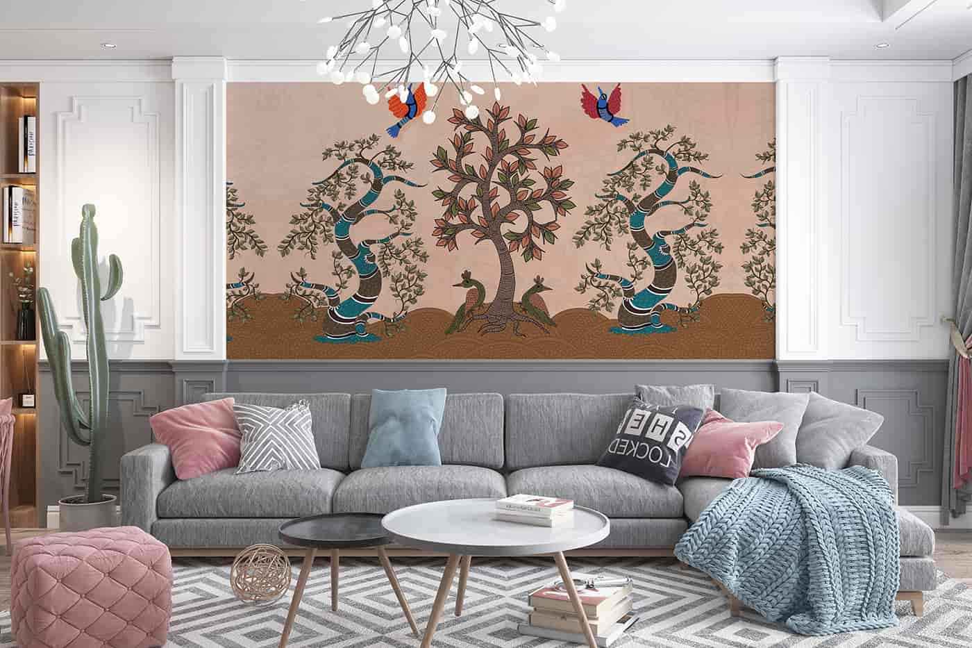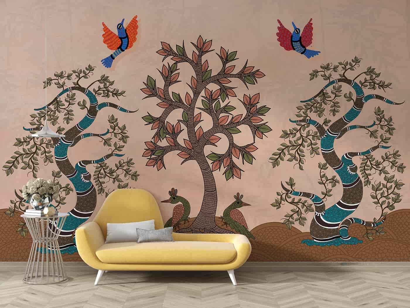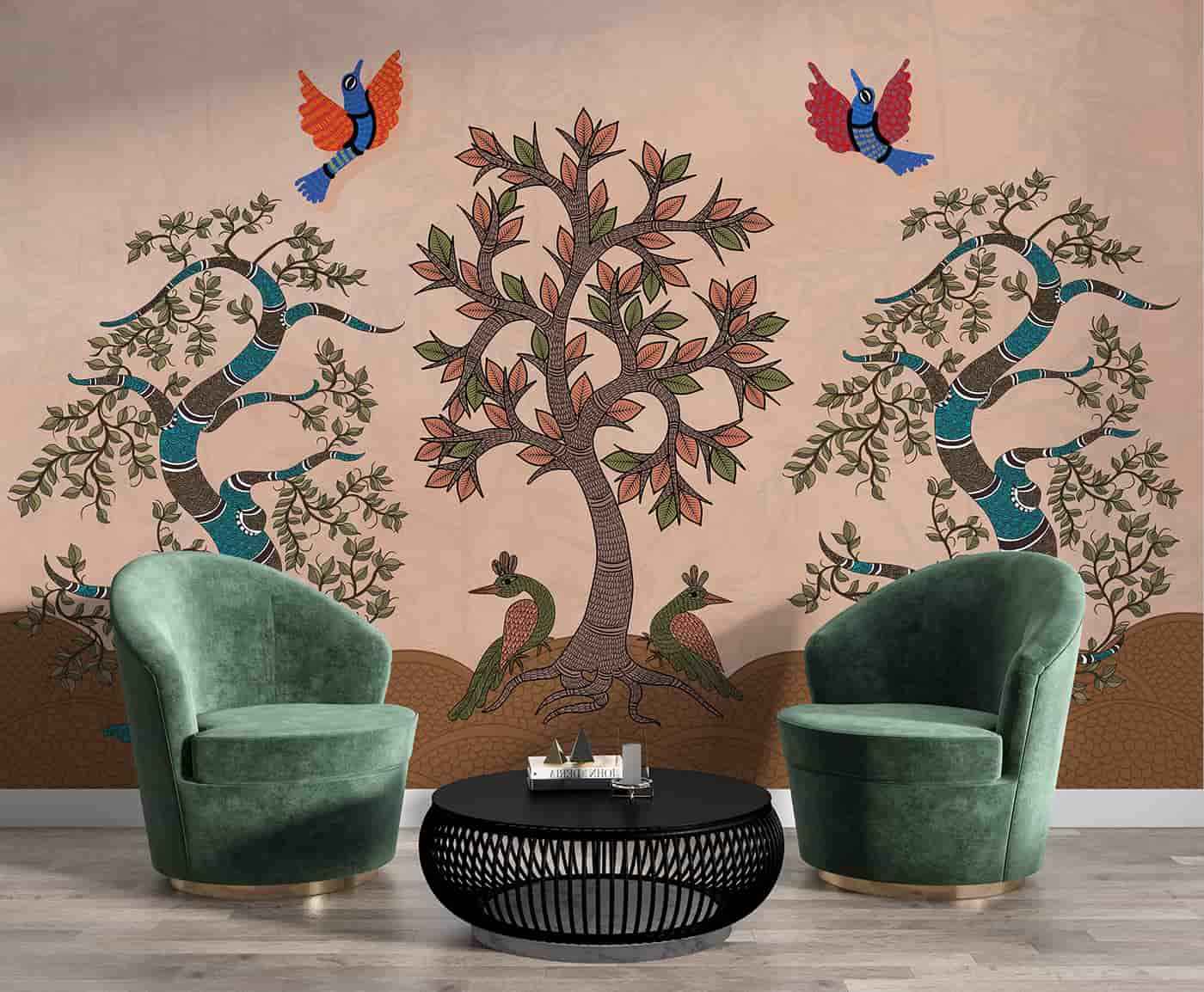 Gond painting is a famous folk art of the Gond tribal community of centralIndia. A community of around four million people spread all over central India, Gonds have a recorded history of 1400 years. The word ?Gond? comes from the Dravidian expression ?Kond? which means ?green mountain?. The central theme of Gond paintings is nature. Gond artists portray nature in various ways in Gond paintings because they believe that the life of man and nature are interlinked. They believes that seeing a good image brings lots of good luck to them. Women use natural colors to paint the walls and floors of their homes. We at Wall Curry have put in our best efforts to preserve and contemporise this art heritage of India and present it to the world. Get this traditional art form to adorn your home today! All our murals are custom-made to fit your wall?s dimensions and they are all supplied in panels. Every wallpaper mural we produce is unique to you. We don?t hold stock.
