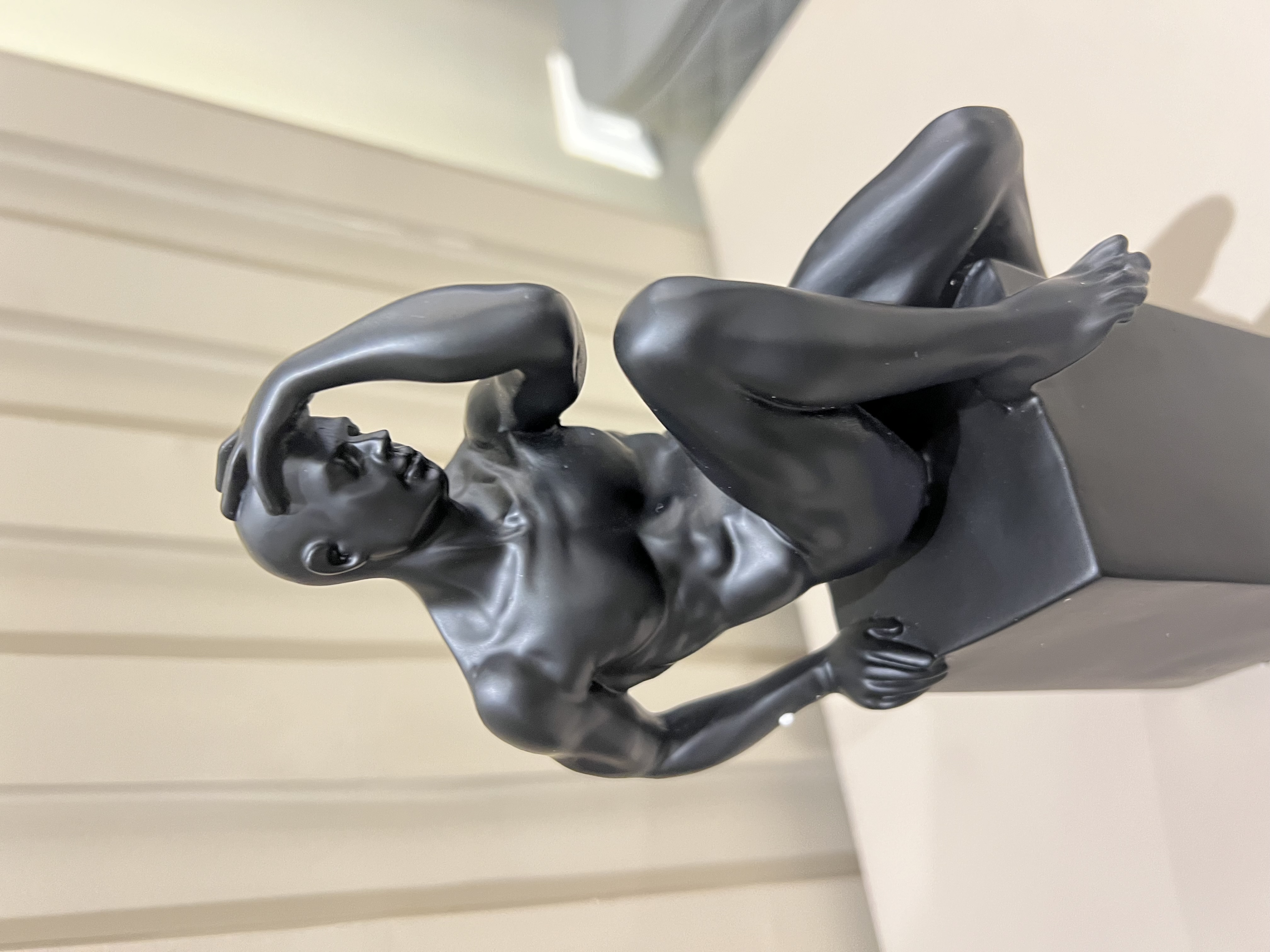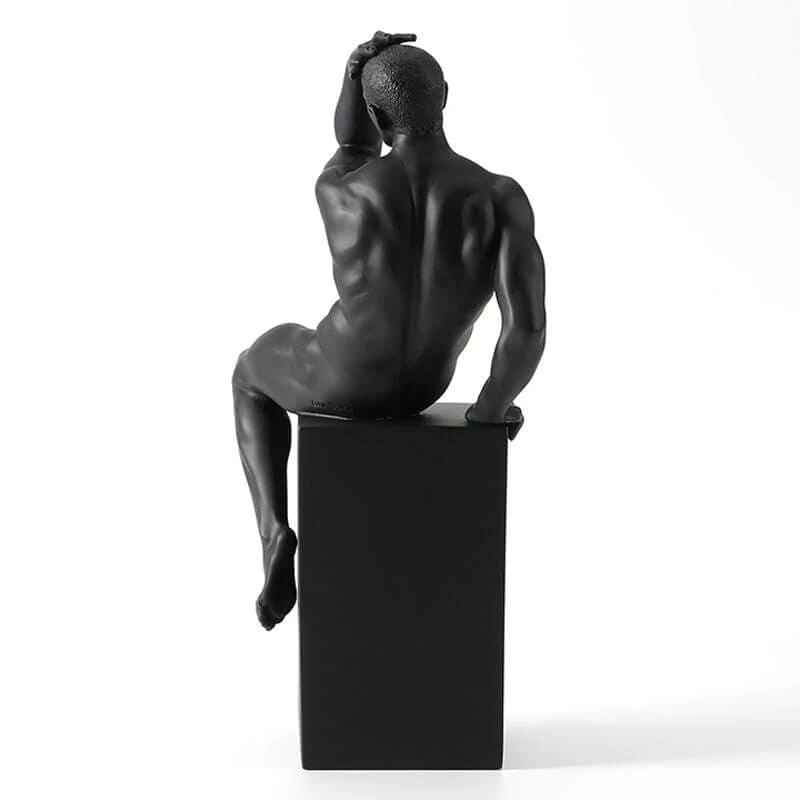 Bring the Greek art to your home with this Nude Male Sculpture Sitting on the Plinth. Chisel to excellence by trained artists; it is crafted of high-quality polystone to lend a vigorous and shiny appeal. The coloration of this sculpted male nude statue with a black hue makes it truly a remarkable piece of art. It features a position with one hand on head and other on the plinth, which represents that he is thinking about something very seriously. Place this attractive masterpiece on any mantelshelf of your living space and beautify your art collection.Made of polystone. weight-4.6lbs