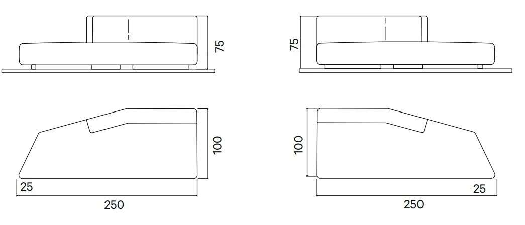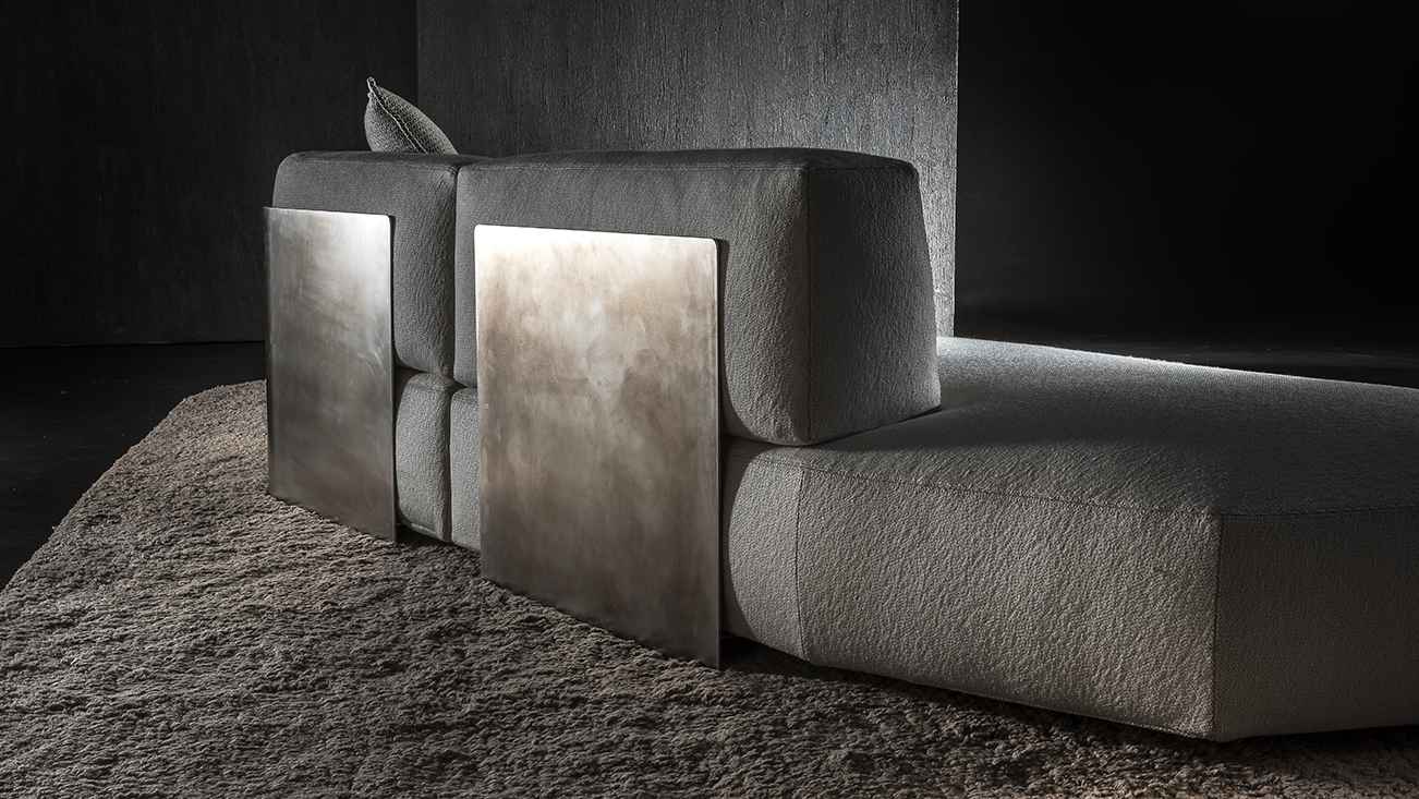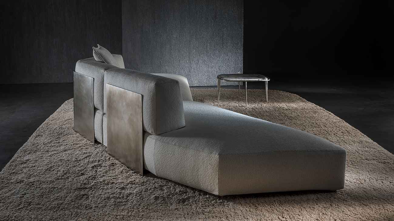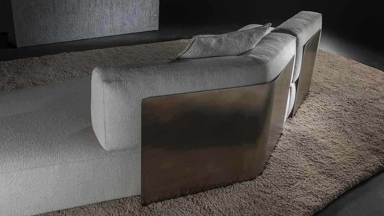 Solid wood padded with polyurethane foam, covered with 100% goose down, internal cover in 100% white cotton lining. Seat cushion with high re-silience polyurethane foam PF45FR and memory foam, covered with 100% quilted goose down (Assopiuma certified Gold Label), with high density (SR75) structural internal support. Internal cover in 100% white cotton. Metal backrest support.