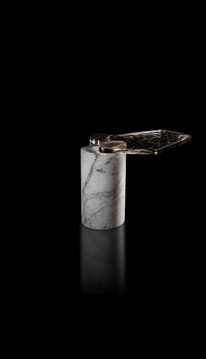Arabescato stone or Rapolano stone. TOP: Swivel top in casted glass finish Steel Gray.