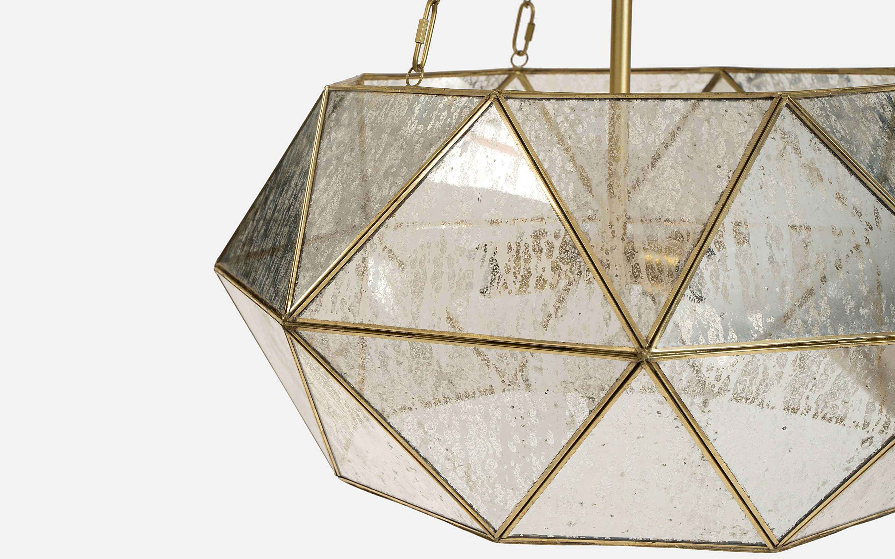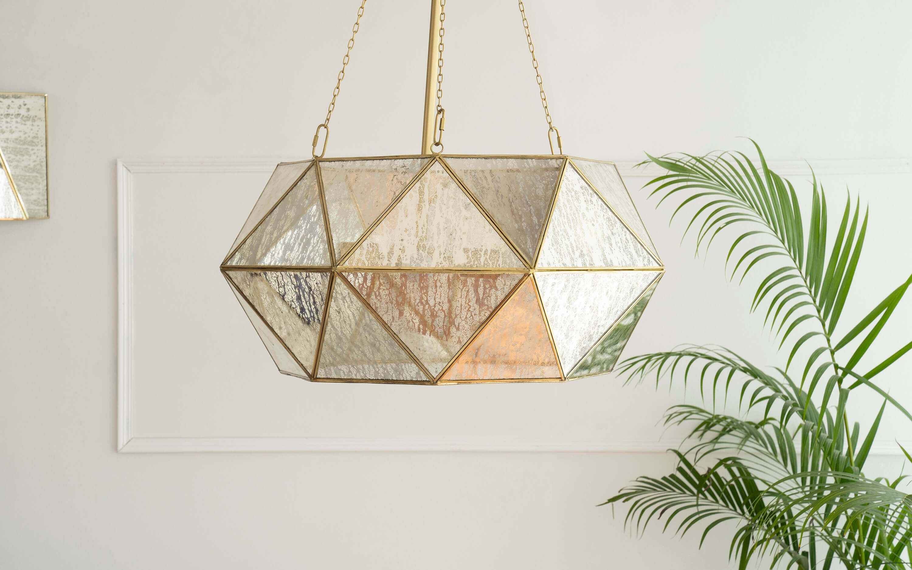 Much like expressionist abstract art, Hera Collection focuses on asymmetrical geometry that utilizes clean lines, though abstract style, and also incorporates chaotic aspects through the antique gold finish on glass to offer a fresh and unique perspective. Lighting also features simple lines and borrows from a modern aesthetic. The Hera Chandelier Hanging Lamp is a beautiful and unique piece that will add a touch of elegance to any room. It is made of iron and distressed gold mirror, and has a gold finish on the metal. This chandelier is perfect for hanging in a hallway, living room, dining room, or bedroom. It will add a touch of class and sophistication to any space. "Depending on your screen settings and resolution on your device there may be a slight variance in fabric color and wood polish of the image and actual product. Wood grains will vary from product to product in case of solid wood furniture."