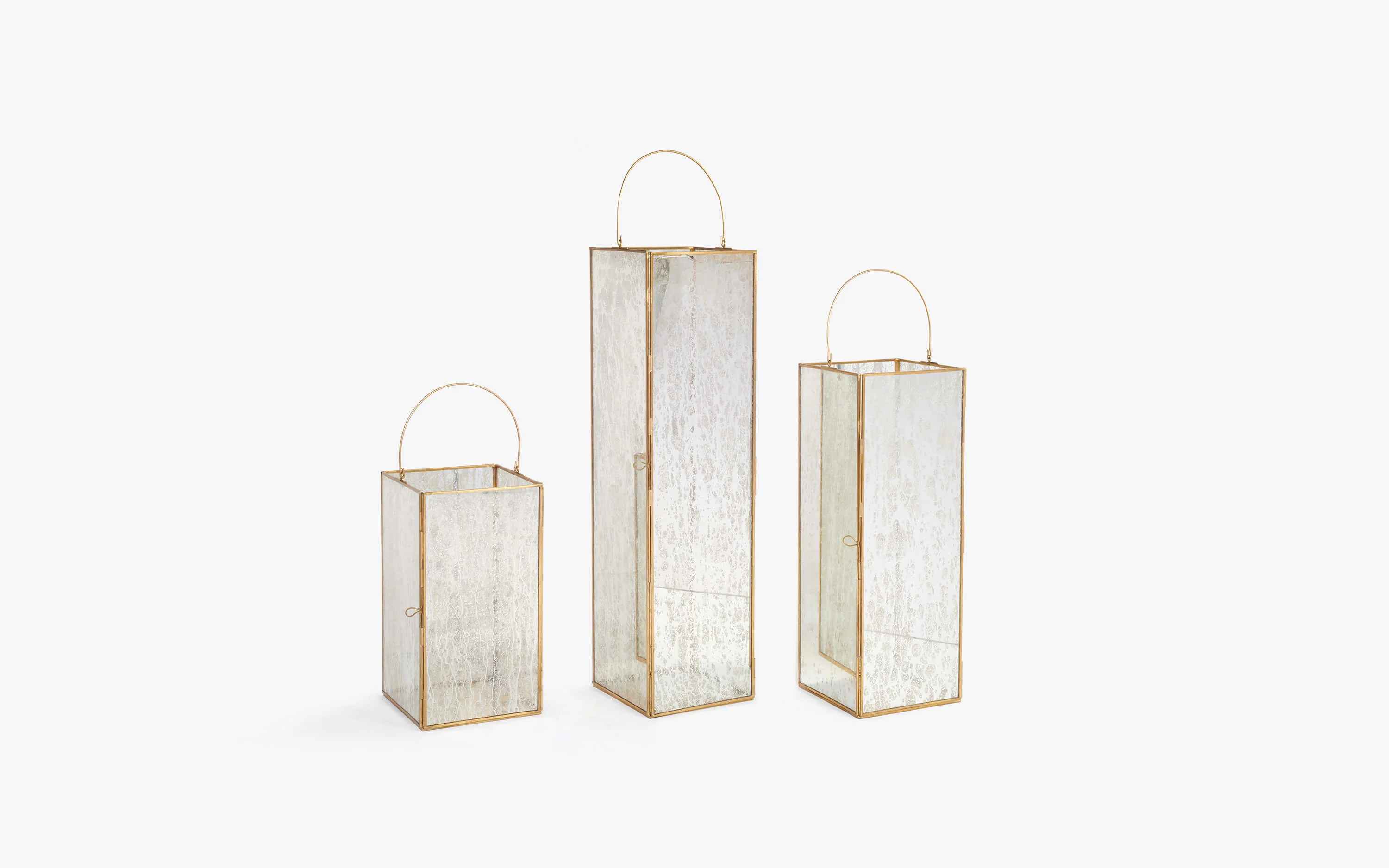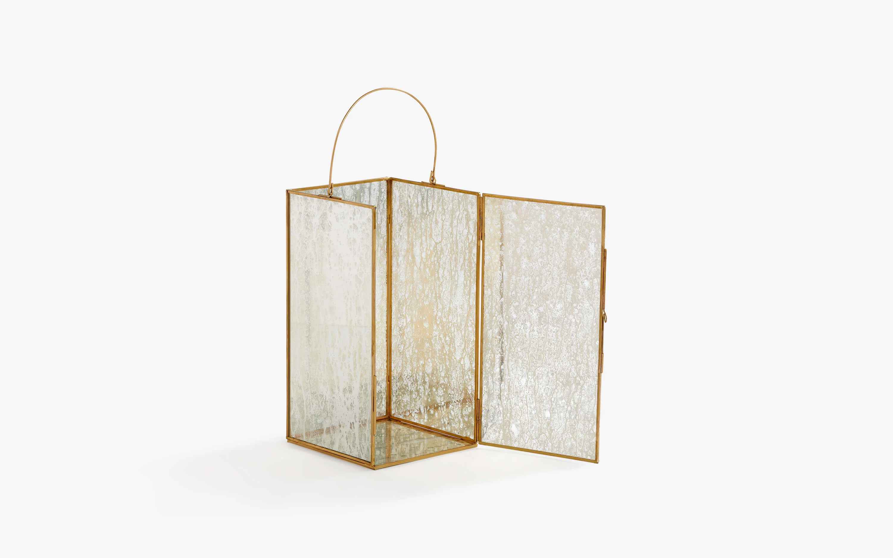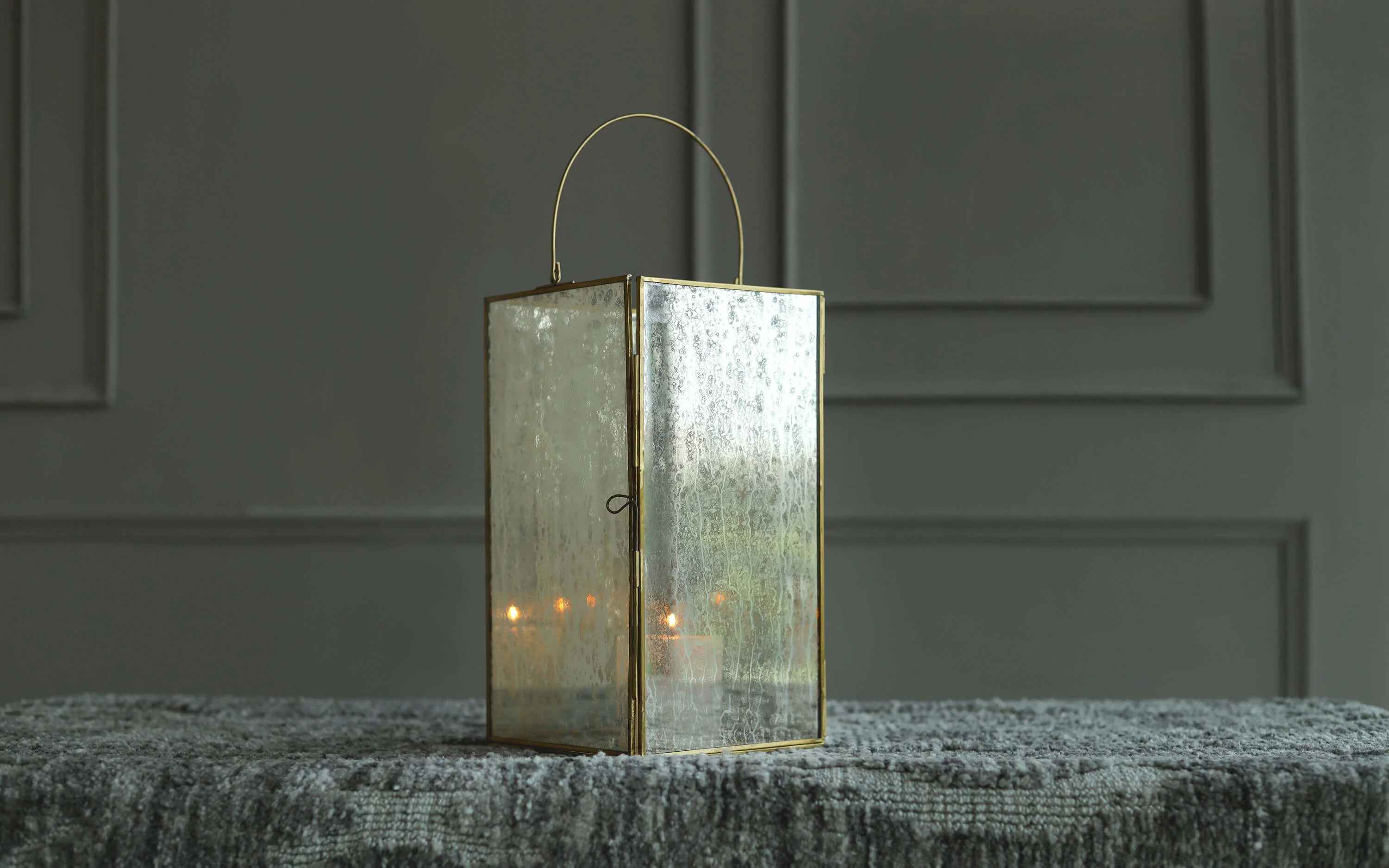A graceful yet exquisite show of sleek metal lines and glass, the Hera Lantern instantly transforms any and every nook & corner of the house during the festivities. The lantern stands out with its clean, minimal & easy-to-hold design, giving a lovely festive feel with the contrasting brass and antique finish glass. Place all the sizes together to create a stunning show of light and harmony! "Depending on your screen settings and resolution on your device there may be a slight variance in fabric color and wood polish of the image and actual product. Wood grains will vary from product to product in case of solid wood furniture."