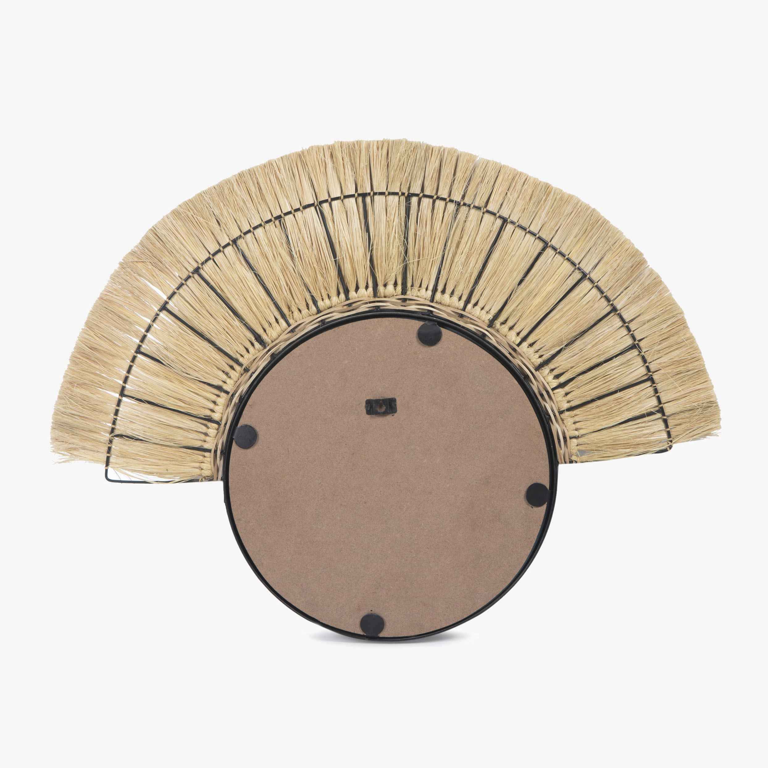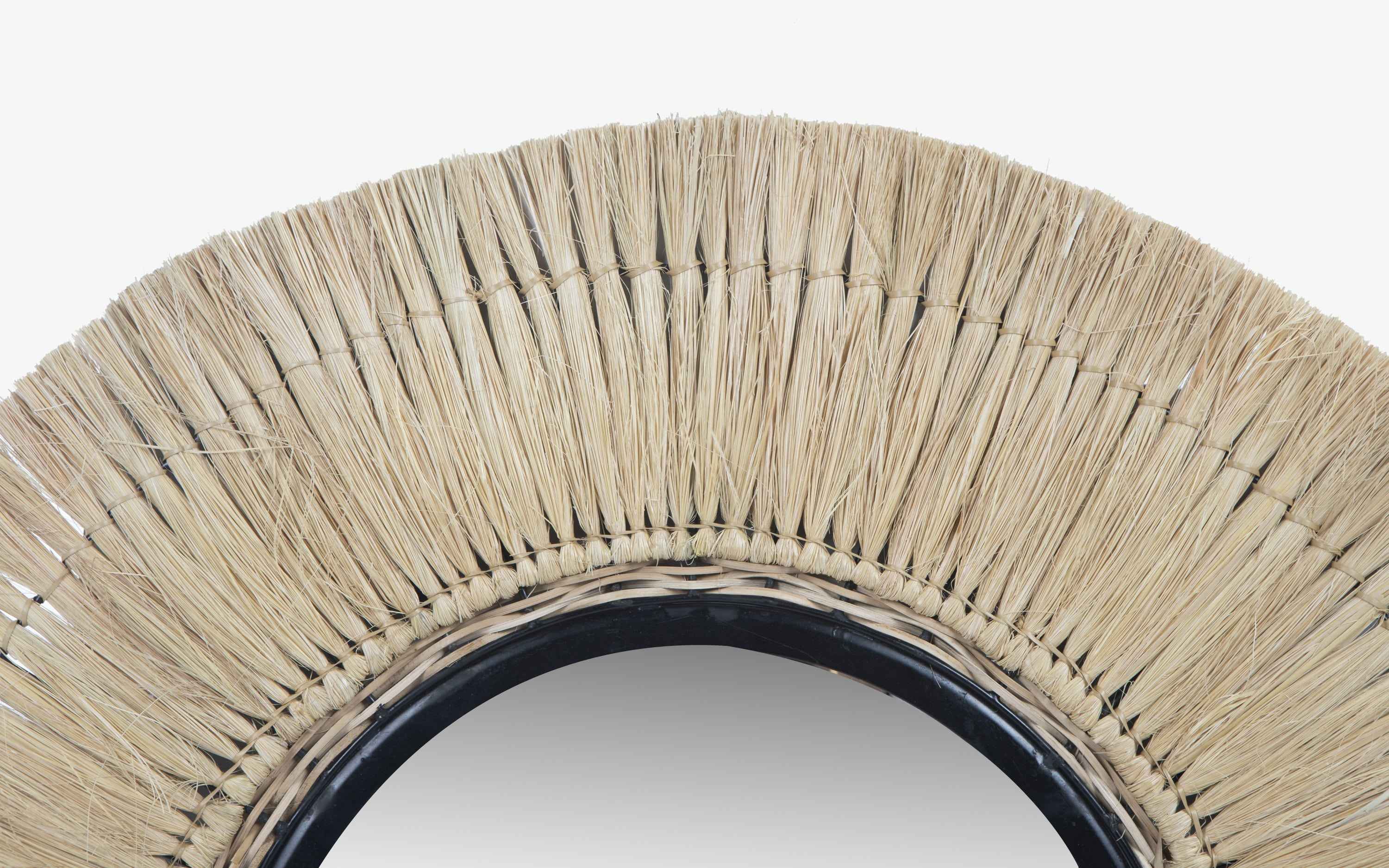 Hailing from northern Namibia, in the Kunene Region, the Himba people though small in number are mighty in their clever use of natu ral materials and craft techniques. The Himba Collection, which is a part of the Tribal Collection, uses natural fiber called Moonjh and transforms it into the most rustic chic home decor designs you can think of. From hanging lights to mirror and other wall decor this collection is surely going to add a little bit of nature in your living space. This is a unique Himba Semicircle Mirror. The intricacy of the design and the symbolism that it represents make it a perfect piece for any living room or bedroom. "Depending on your screen settings and resolution on your device there may be a slight variance in fabric color and wood polish of the image and actual product. Wood grains will vary from product to product in case of solid wood furniture."