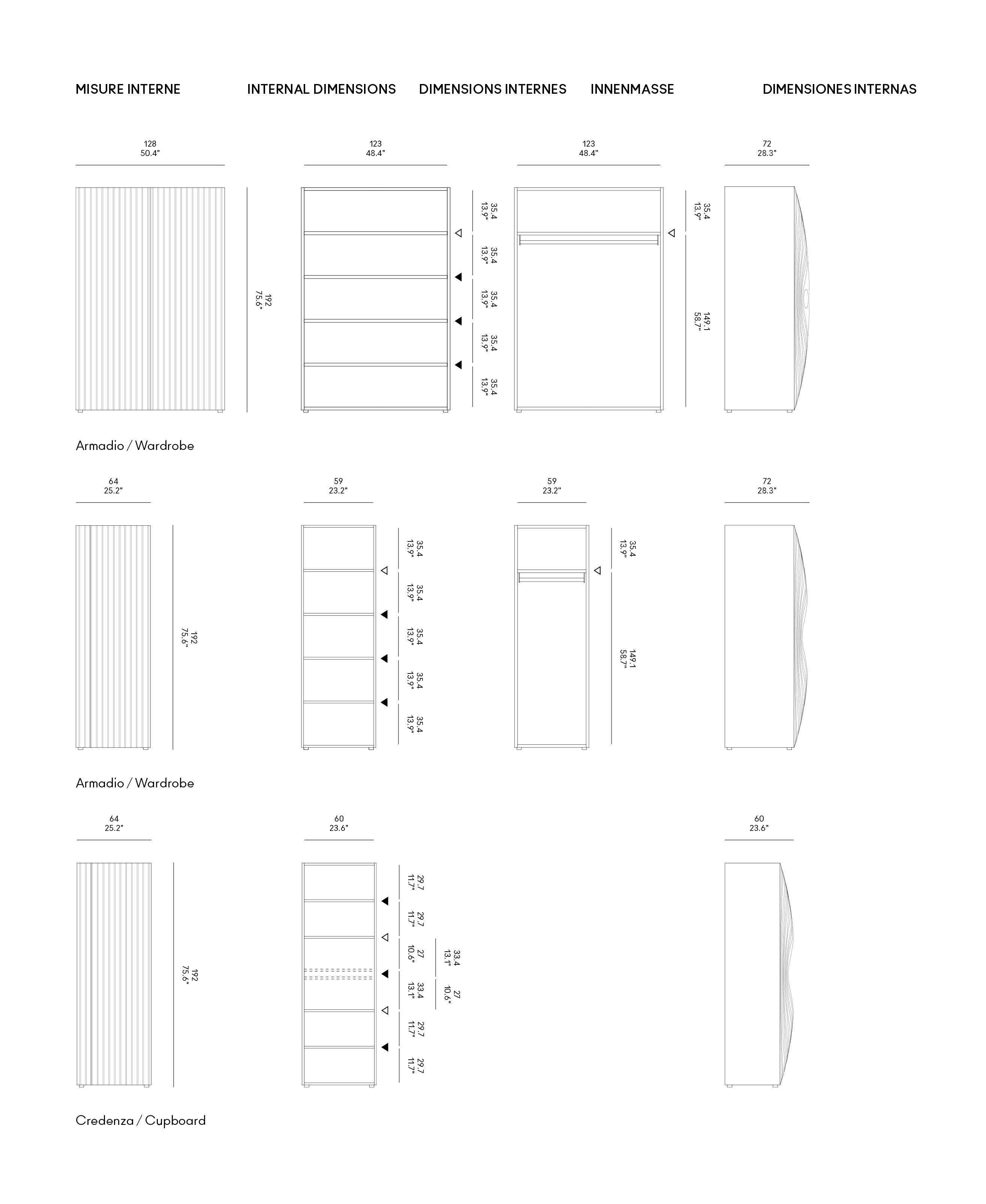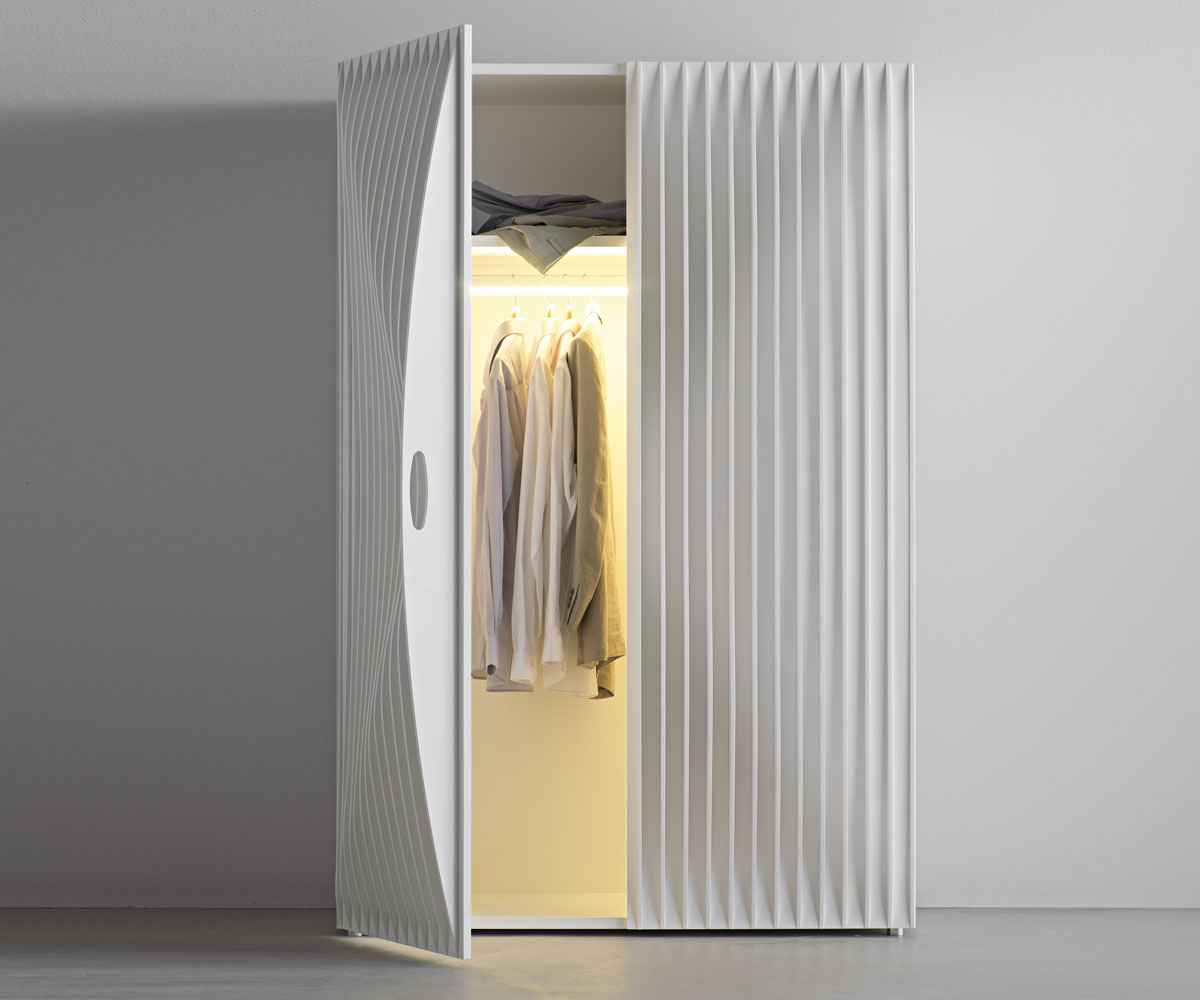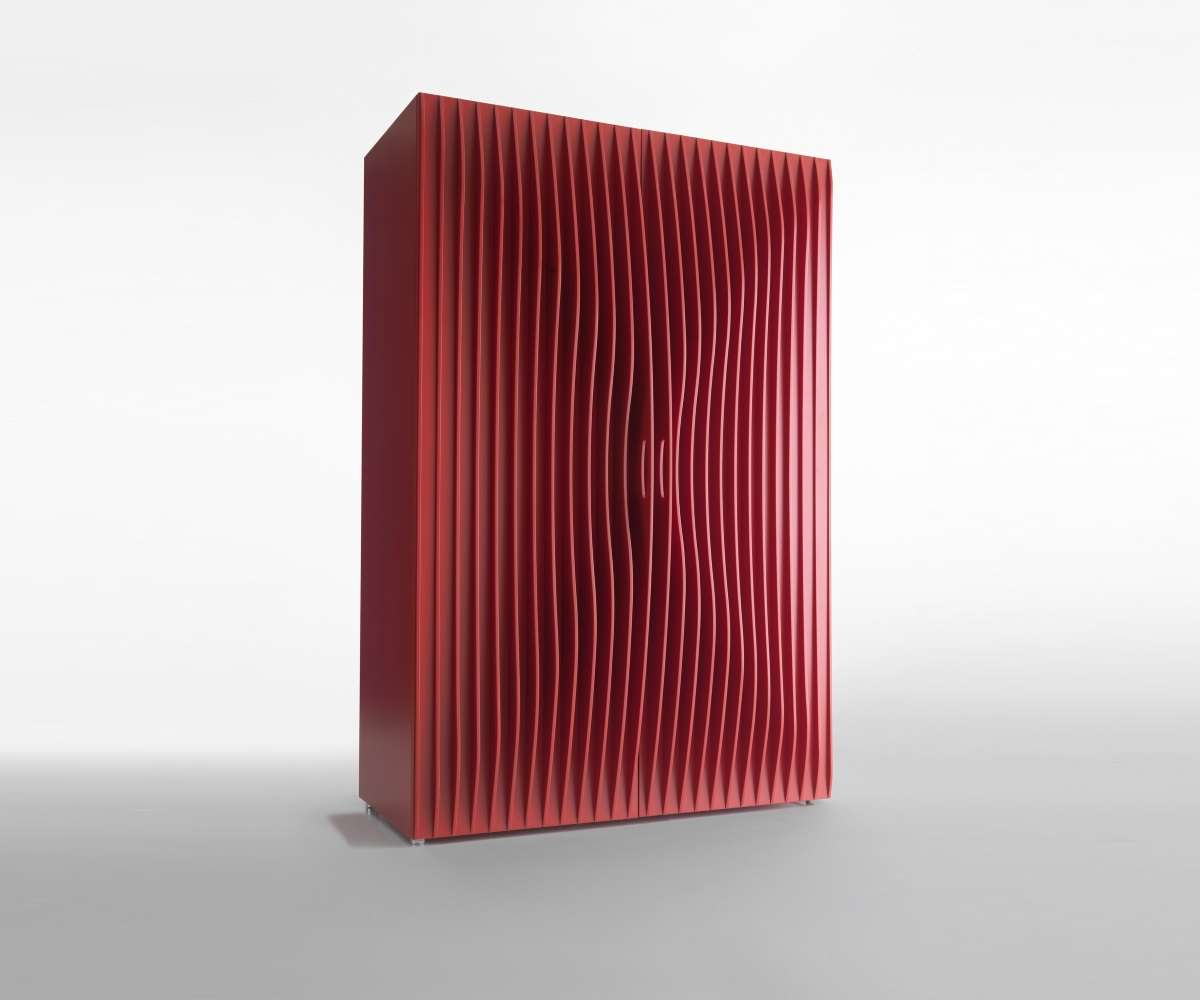 Frame, shelves and doors made from lacquered particle board or MDF. Ripple-effect in lacquered MDF
