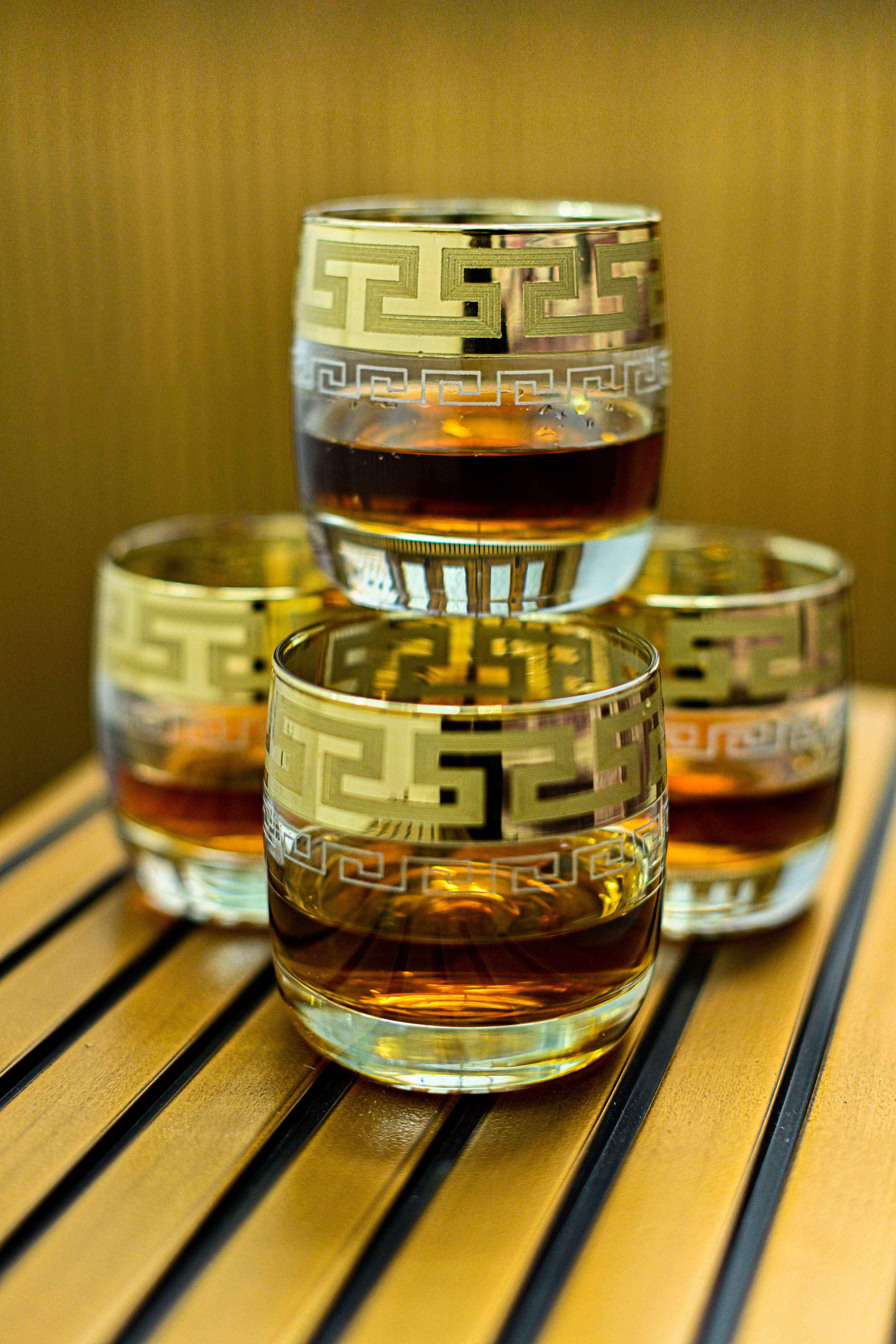 Whiskey glass decorated with gold stripes. These are original glasses from Russia for more demanding lovers of glass and gold. This set of glasses will make a stunning addition to your bar, table and drinkware collection. Crystal clear glasses are adorned with double sided Gold pattern which is visible from inside the glass as well as the outside. The set is an excellent addition to your glassware collection and a perfect set to make your party fancier. Designed to impress, these glasses will catch all the attention of your guests. Made of the top-notch glass, the tumblers are extremely durable and reliable. The classic pattern makes them eye-catching and beautiful, while the gold rim adds even more elegance to the item. The set contains 6 tumblers for an outstanding party. Carefully crafted from the highest quality glass, these items will serve you for an incredibly long time. The Gold plated glasses that sits comfortably in hand are ideal for any liquor or cocktail – Whisky, Scotch, Vodka, Juices or even plain water.
