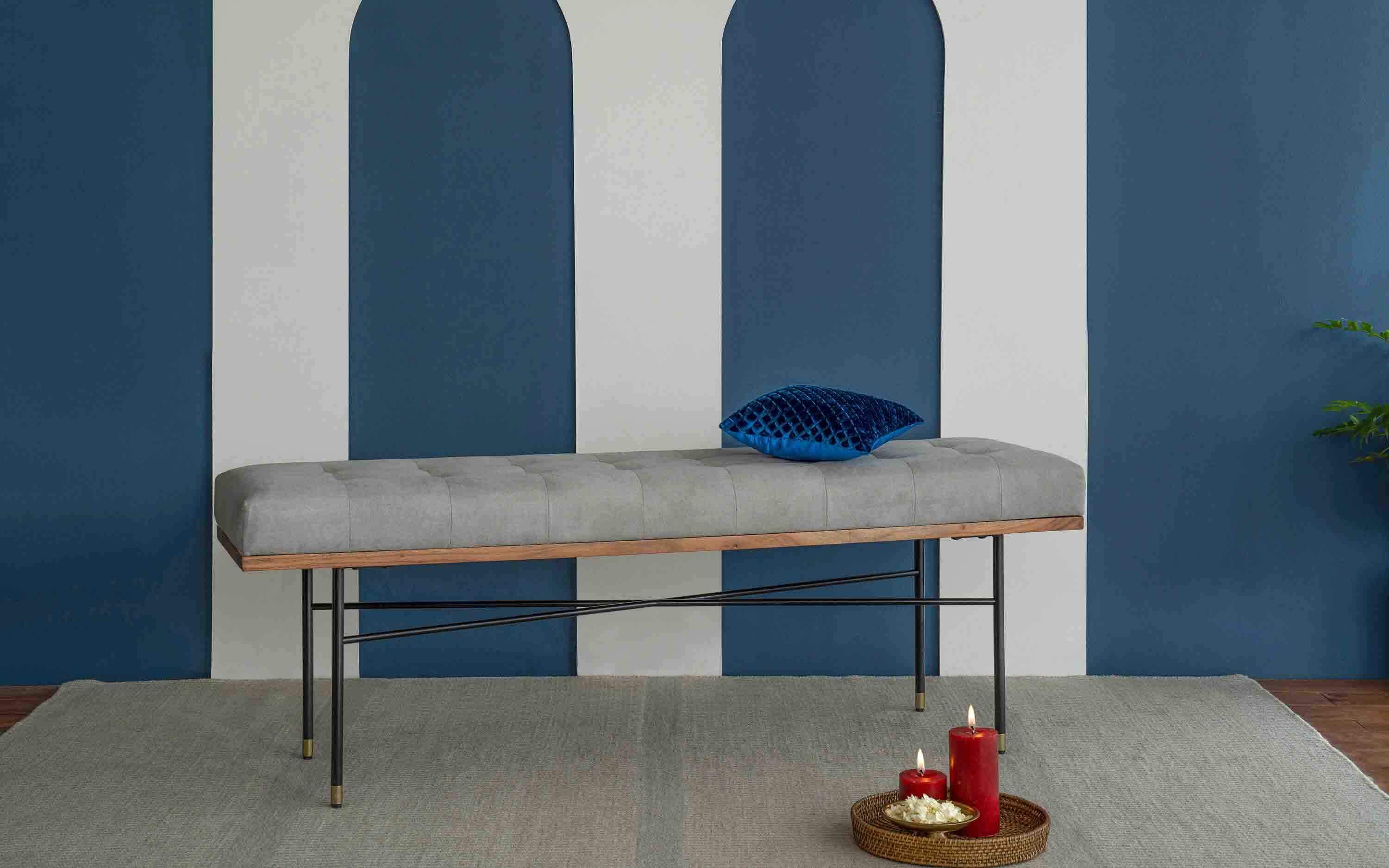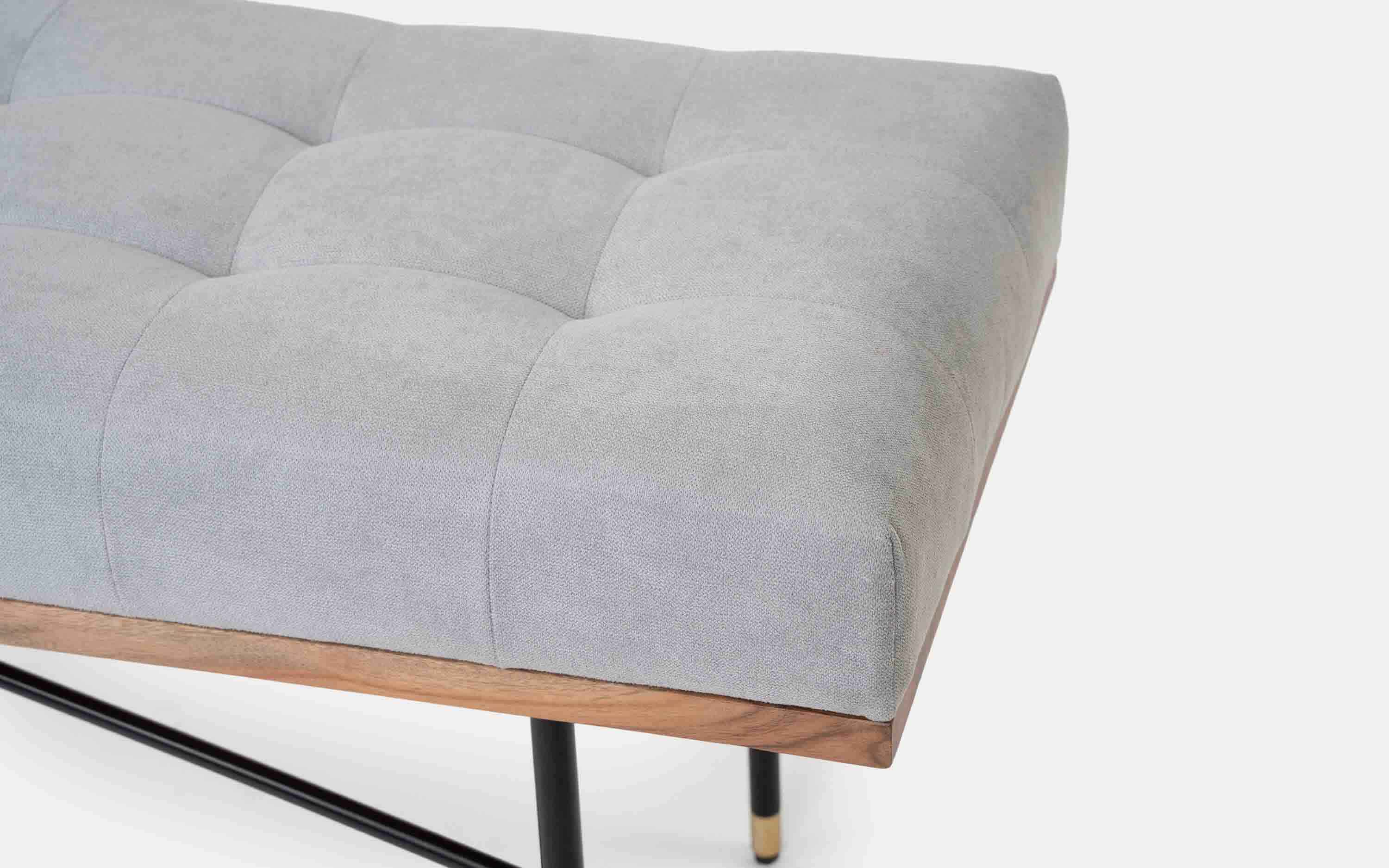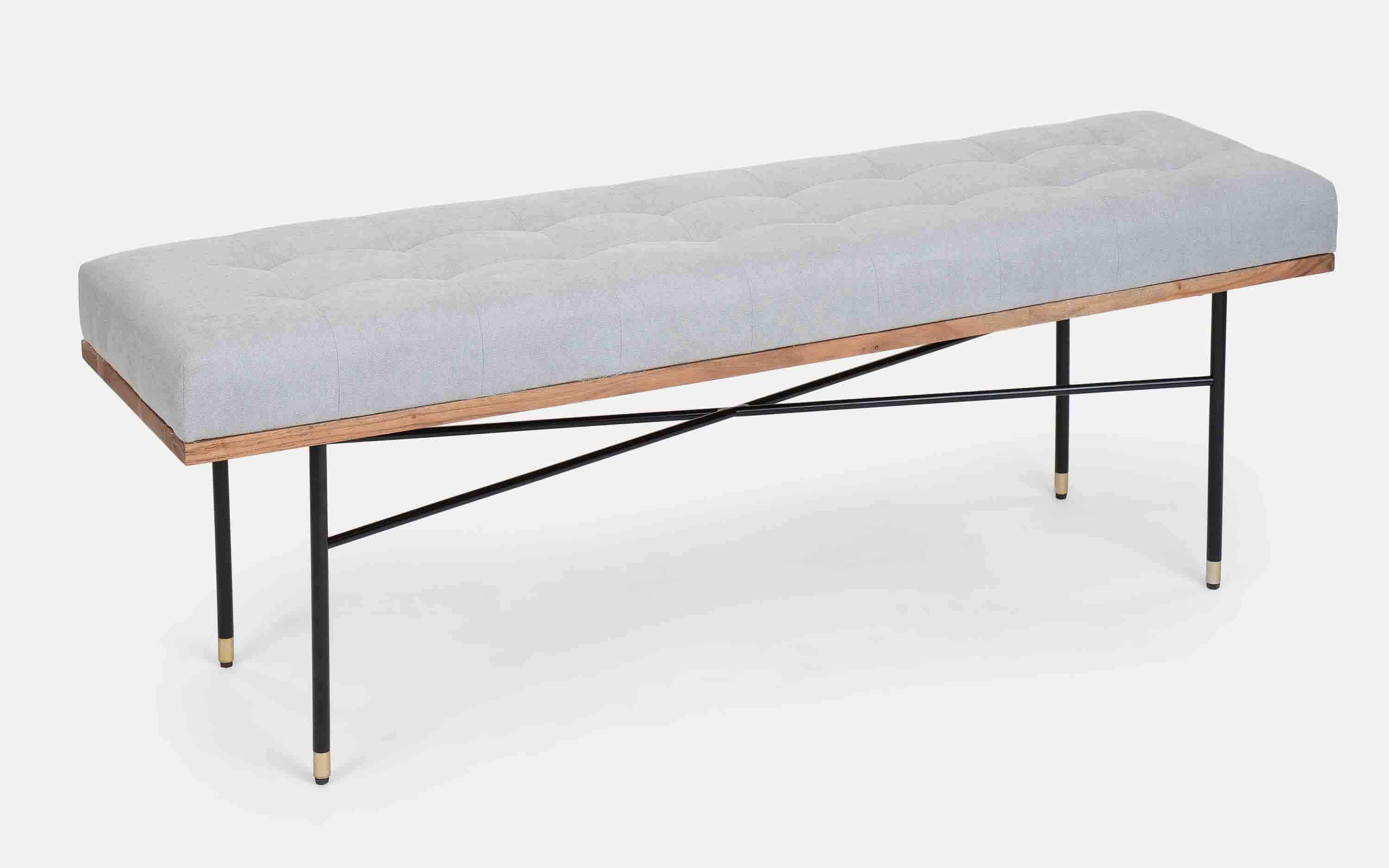 An easy way to revitalize a living room or entryway, our Ipiano bench showcases classic grey fabric on a clean-lined frame. The bench's generously sized box cushion sits on black-finished metal legs, a linear design that perfectly complements any décor "Depending on your screen settings and resolution on your device there may be a slight variance in fabric color and wood polish of the image and actual product. Wood grains will vary from product to product in case of solid wood furniture."