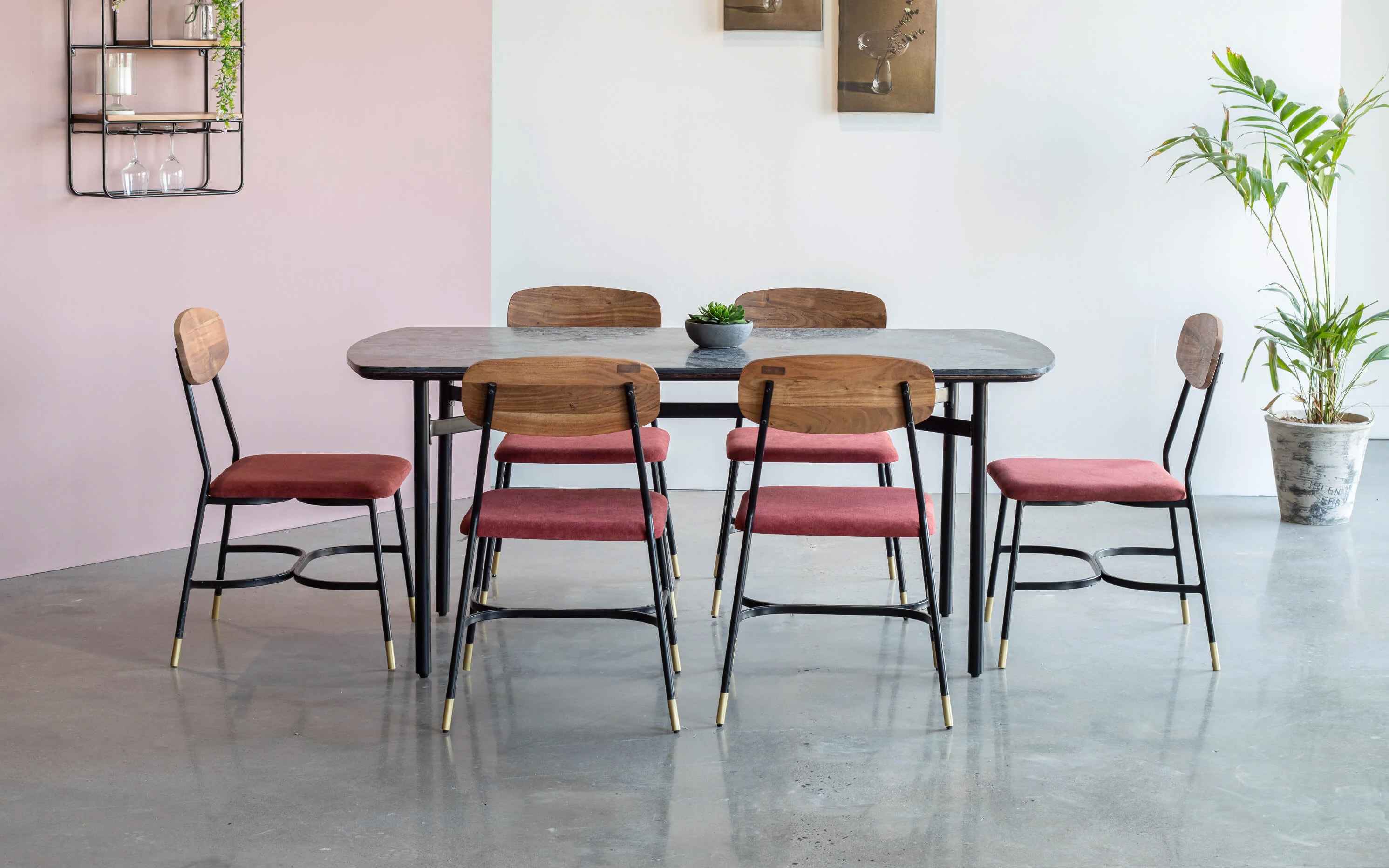 Mild steel, Black Marble, Acacia wood and Upholstery