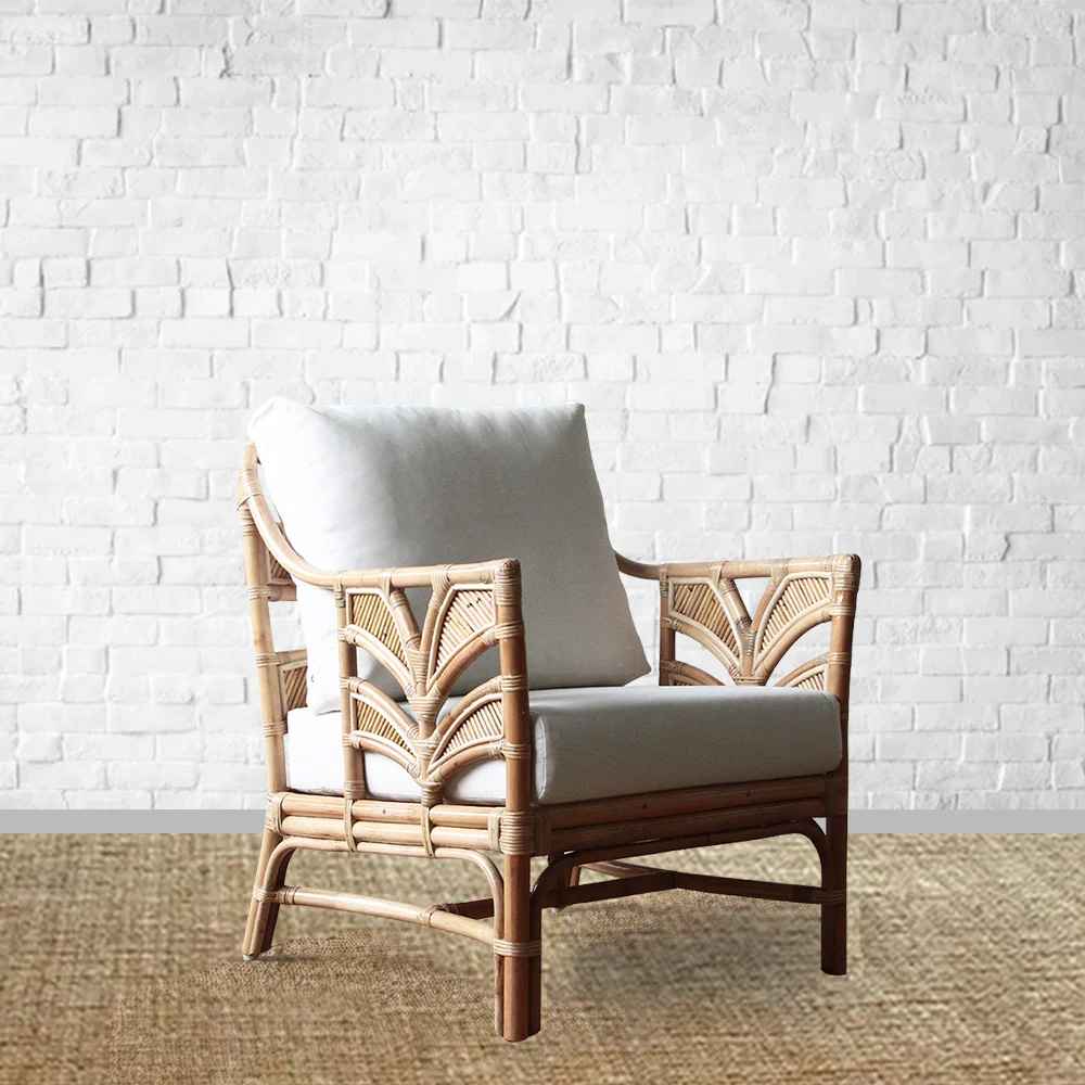 The Island Oasis collection has been expertly crafted from eco-friendly and sustainably sourced natural rattan by our skilled artisans. Whether you're going for a coastal, modern, casual, or scandi vibe, this range adds timeless quality and warmth to your space. This range is suitable for outdoor use under cover, but should not be exposed directly to UV and moisture. It is shown here in its natural form. Each Island Oasis Armchair comes with a back and base cushion in your choice of fabrics. We offer various options depending on the intended use of the chair. High-performance fabrics are made for outdoor use and are durable, resistant to fading, stains, and water damage. These fabrics are available in our 'Wrap Over' style covers and come with Premium Support Foams. Premium Support Foams are firmer at first but will soften over time. Wrap over covers have no piping and seams that run along the sides for a neat finish.