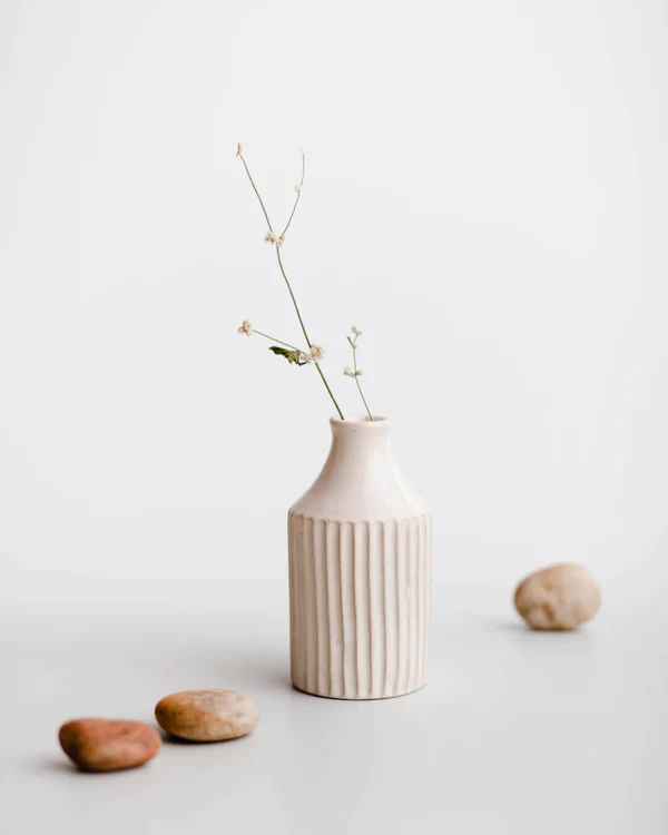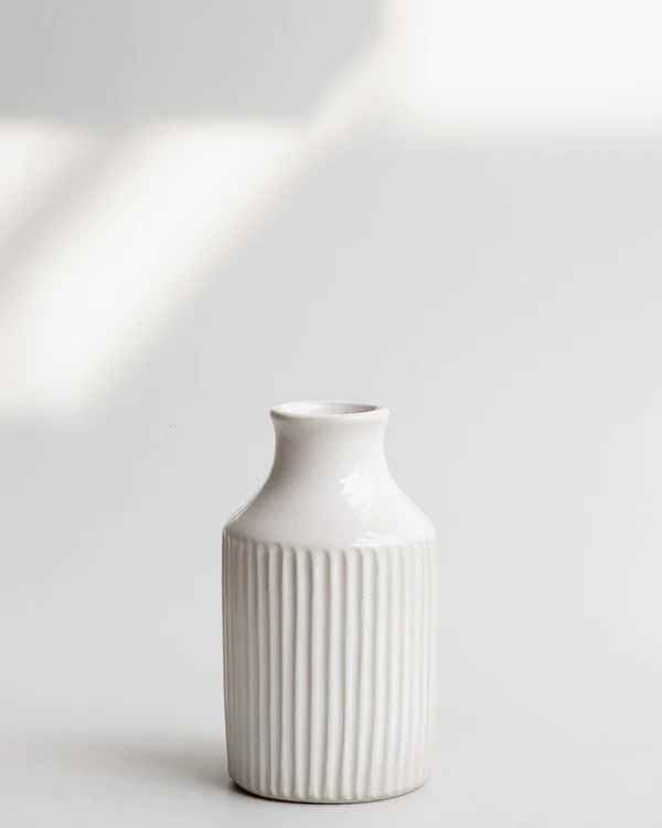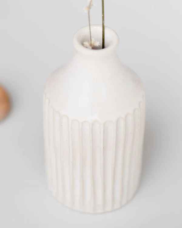Give your home décor a modern contemporary vibe with this elegantly cut rustic white small ceramic vase with textural ridges and soothing pottery design.