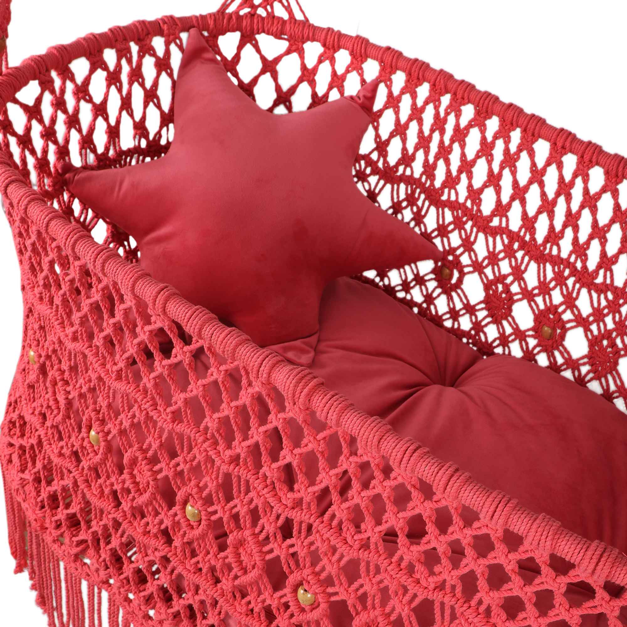 This baby cradle is made by weaving the each knot by hands of Indian Artists. The cradle is madeup of macrame cotton rope, iron frame and wooden beads. You will get a mattress and a star shape cushion along with this cradle. It is perfect for comfortable sleep.