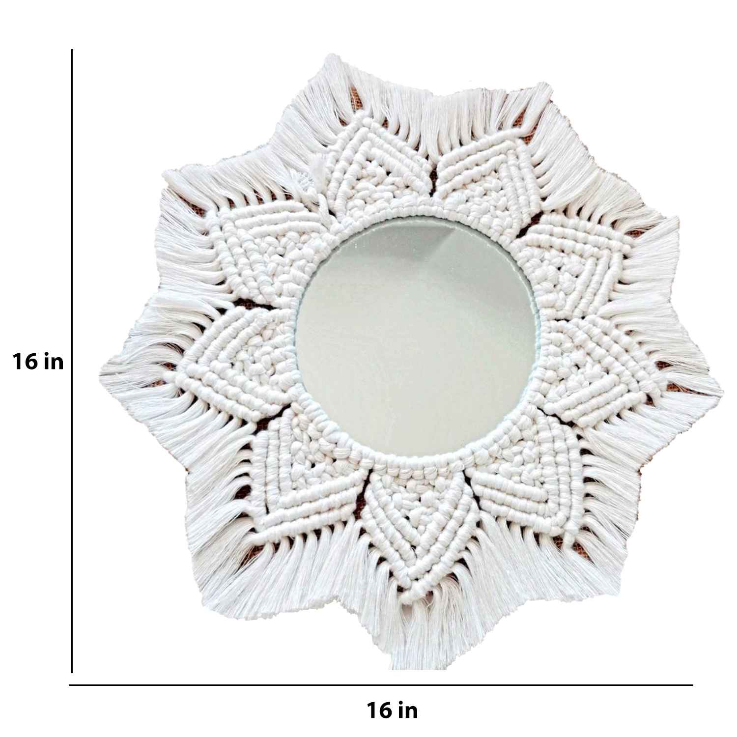 Our Soft macrame mirror can complement the bohemian style of your home or be a good start for your soft style. Our handmade macramé mirror is perfect for adding a natural feel to your home decor. A perfect gift for yourself and your loved ones. You will feel bohemian style on every wall. Bedroom, hall, children’s room will be a unique piece for all your rooms. Proudly handmade and available in white color . Mirror diameter: 10″ / Full diameter: 16″ Made with 100% twisted cotton cord. Good choice for birthday and anniversaries gift to your family or lover.