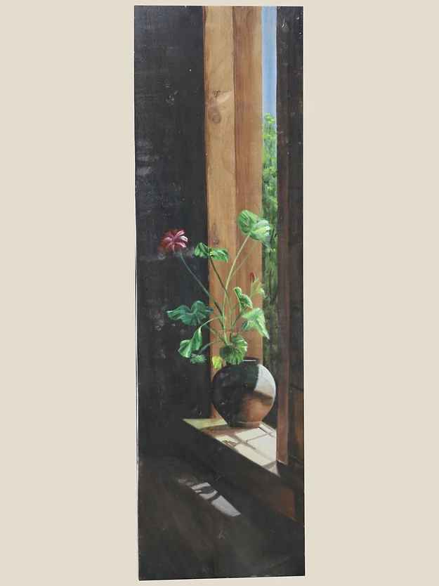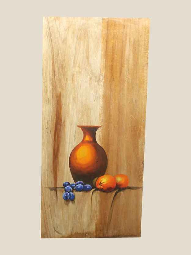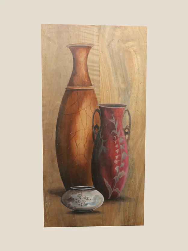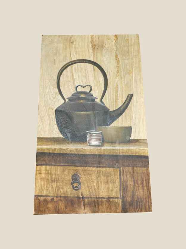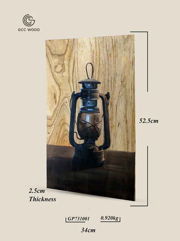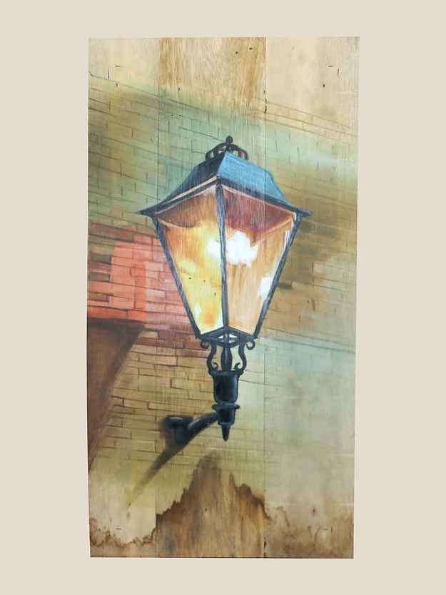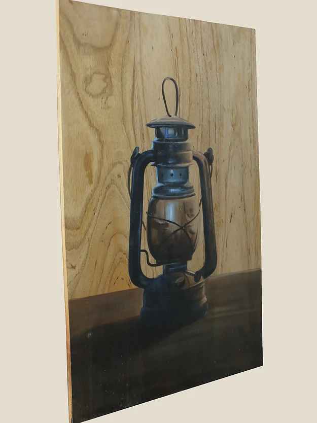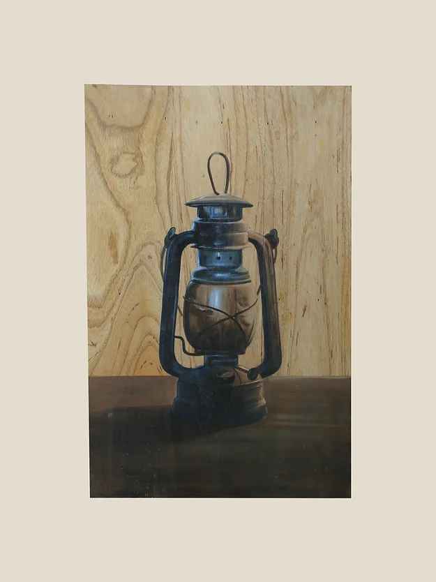 The painting depicts a kerosene lamp, rendered in exquisite detail, sitting atop a wooden table. The lamp's glass shade is painted with a soft, warm glow, evoking the ambiance of a cozy evening at home. The wooden table on which the lamp rests is also detailed with a realistic wood grain, giving the painting a tactile quality. The overall effect is one of nostalgia and warmth, with the simple, functional object taking on a sense of beauty and importance. The painting captures the simple pleasures of life, reminding us of the comfort and security of a home filled with love and light.