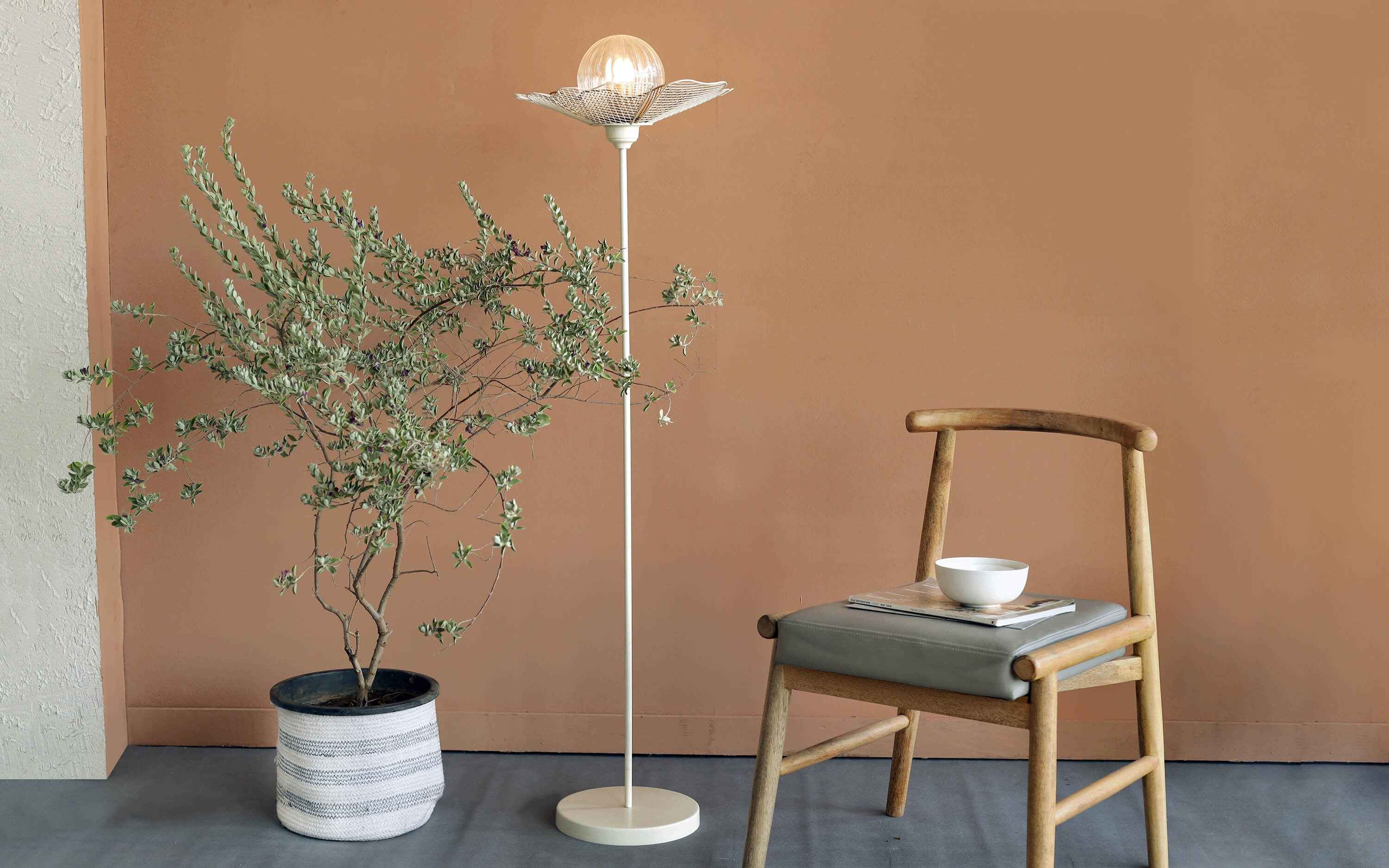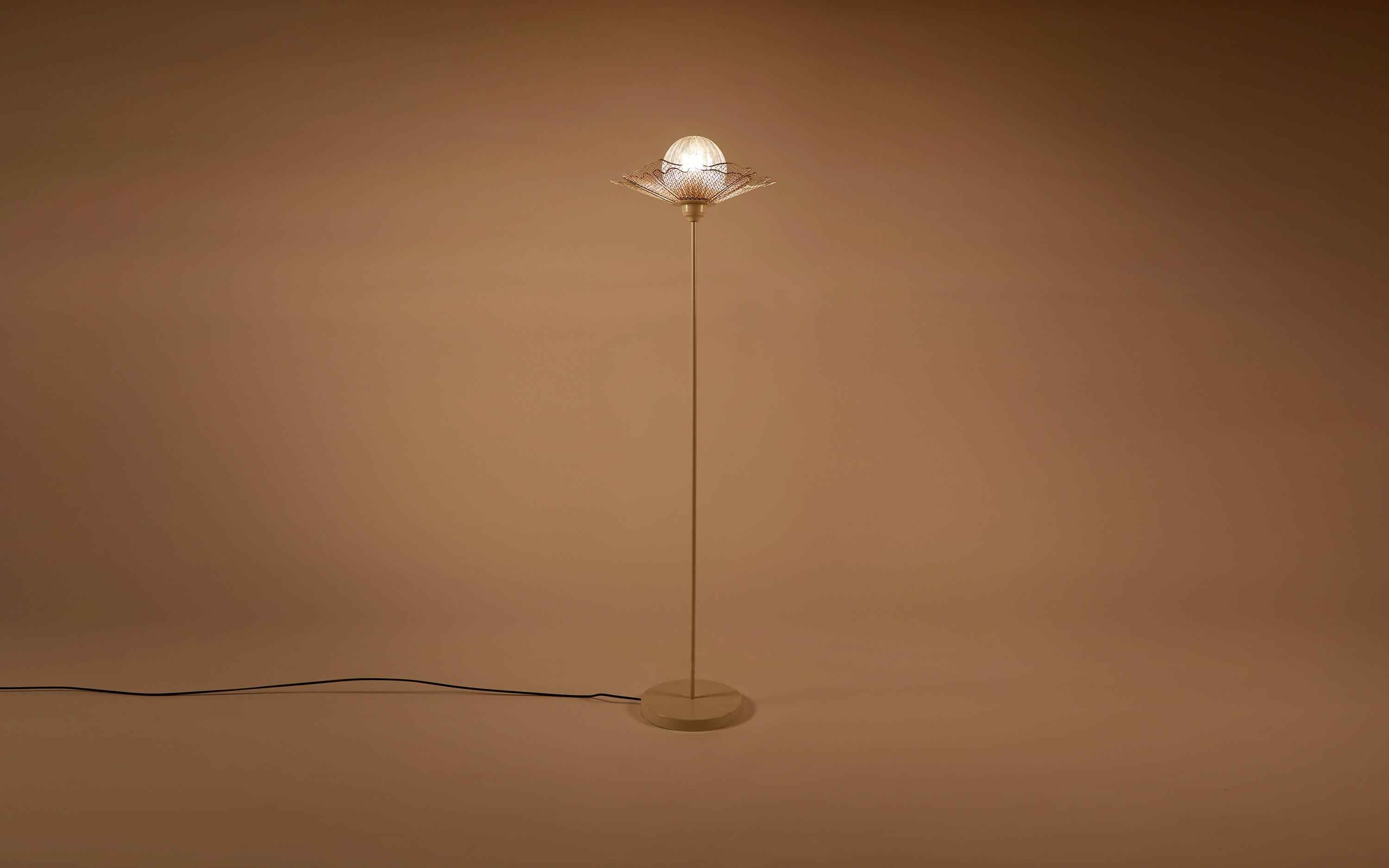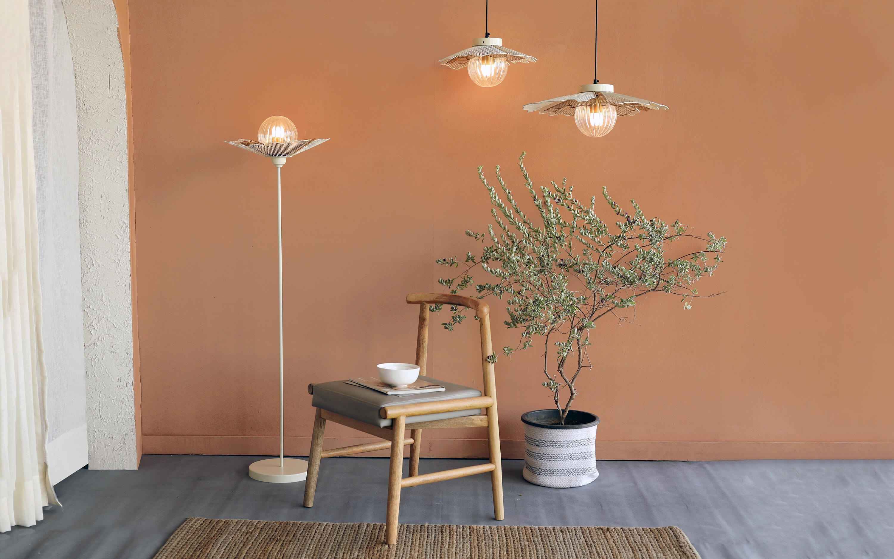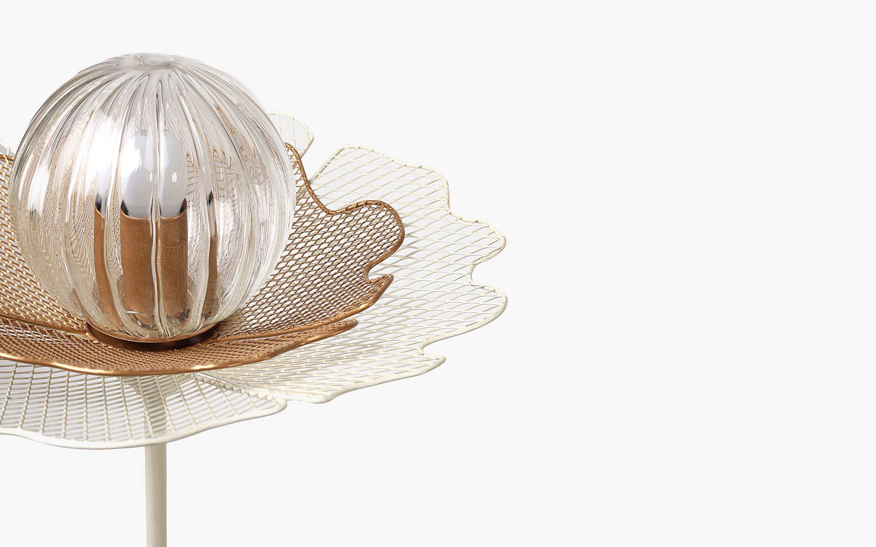 Keshi collection represents a poppy flower In Japan- Poppy is symbolic of deep emotion, and serves as a reminder to have and remember good times. Iron mesh frames the petals in natural style which surrounds the bud represented by the embossed glass ball to light up the room with its sculptural, contemporary look. "Depending on your screen settings and resolution on your device there may be a slight variance in fabric color and wood polish of the image and actual product. Wood grains will vary from product to product in case of solid wood furniture."