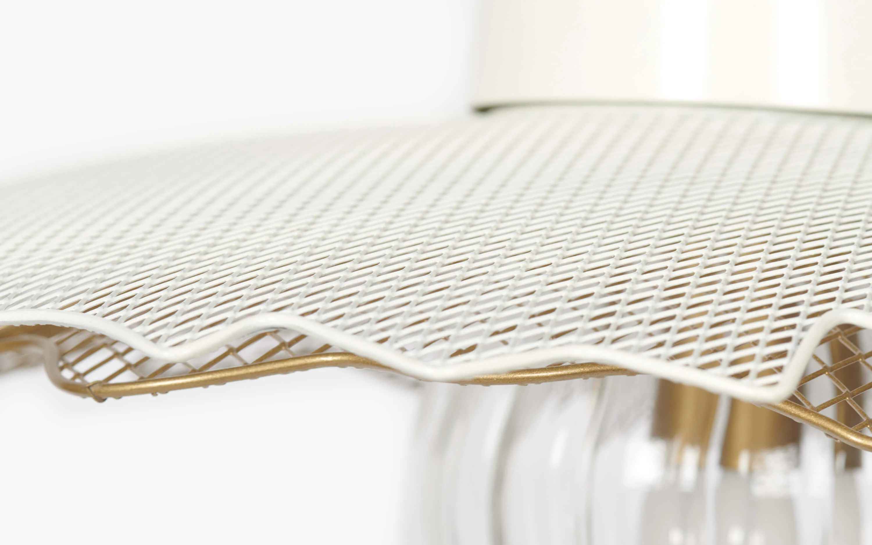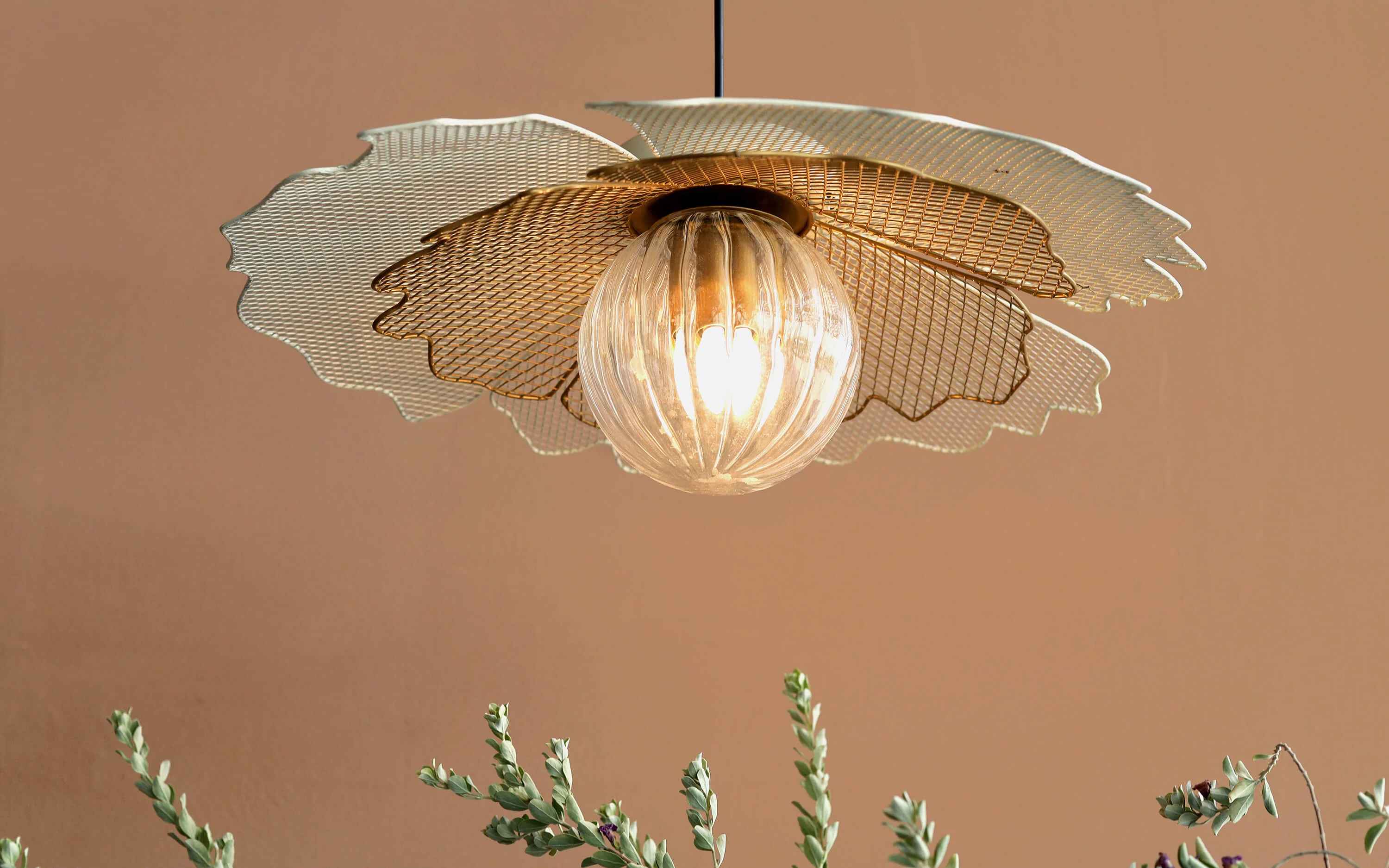 Keshi collection represents a poppy flower In Japan- Poppy is symbolic of deep emotion, and serves as a reminder to have and remember good times. Iron mesh frames the petals in natural style which surrounds the bud represented by the embossed glass ball to light up the room with its sculptural, contemporary look. "Depending on your screen settings and resolution on your device there may be a slight variance in fabric color and wood polish of the image and actual product. Wood grains will vary from product to product in case of solid wood furniture."