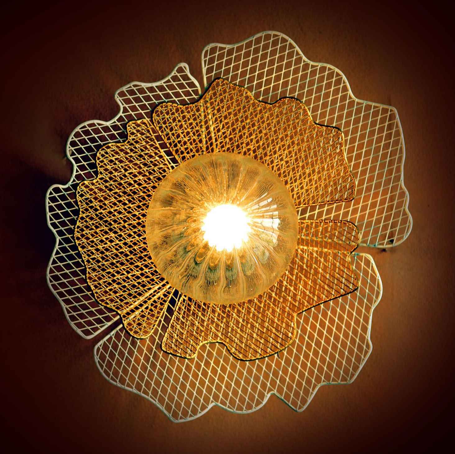 Keshi collection represents a poppy flower In Japan- Poppy is symbolic of deep emotion, and serves as a reminder to have and remember good times. Iron mesh frames the petals in natural style which surrounds the bud represented by the embossed glass ball to light up the room with its sculptural, contemporary look. "Depending on your screen settings and resolution on your device there may be a slight variance in fabric color and wood polish of the image and actual product. Wood grains will vary from product to product in case of solid wood furniture."